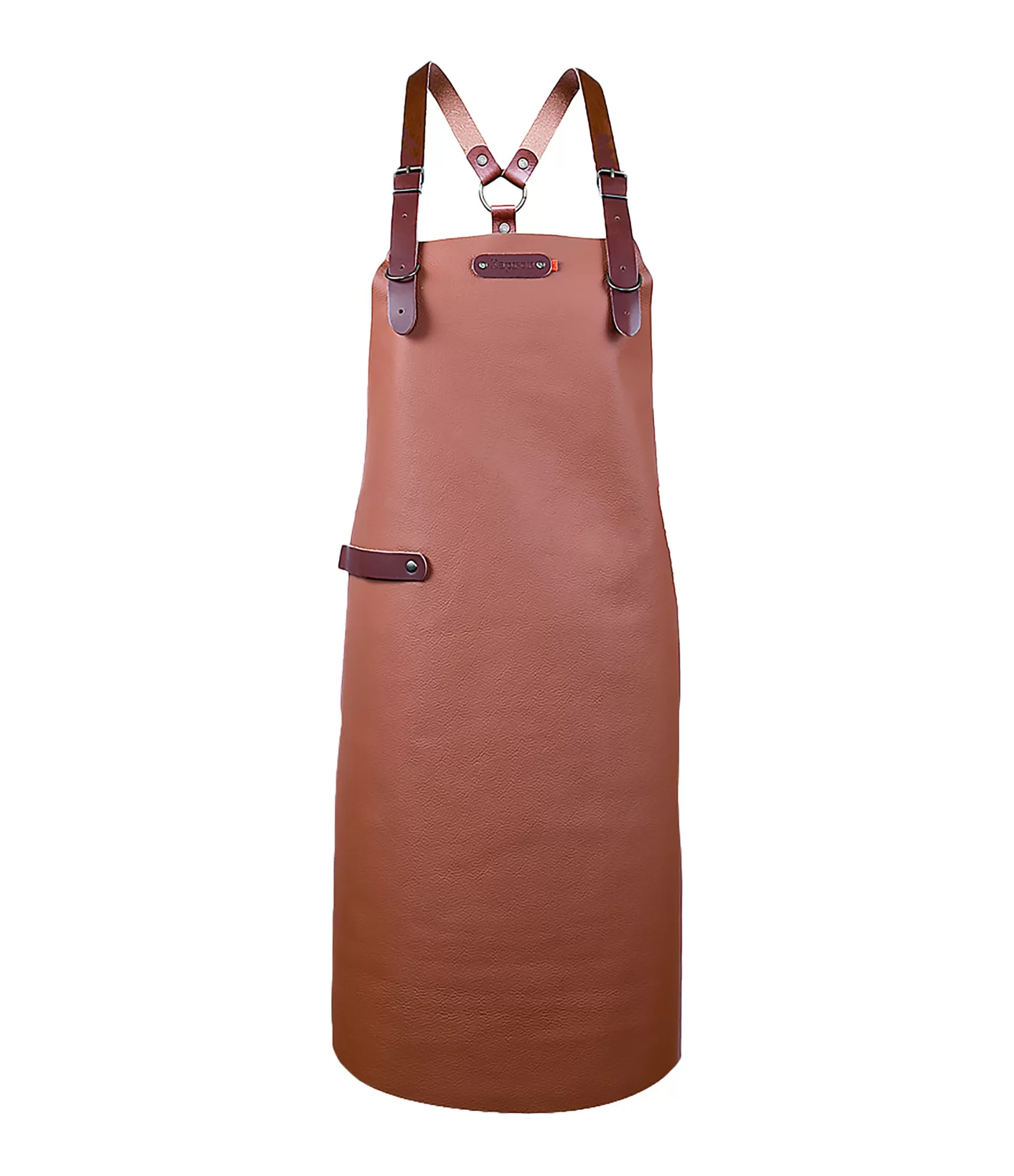 Modelis pieder Bovine Shoulder Apron kolekcijai, tāpēc tam ir krusteniskas siksnas, kas ne tikai uzlabo valkāšanas komfortu, bet arī vizuāli pastiprina priekšauta raksturu. Siksnas vienmērīgi sadala svaru uz pleciem, tāpēc priekšauts ir ērts arī ilgstošas lietošanas laikā. Regulējamās misiņa sprādzes ļauj precīzi pielāgot priekšautu individuālajam ķermeņa augumam.