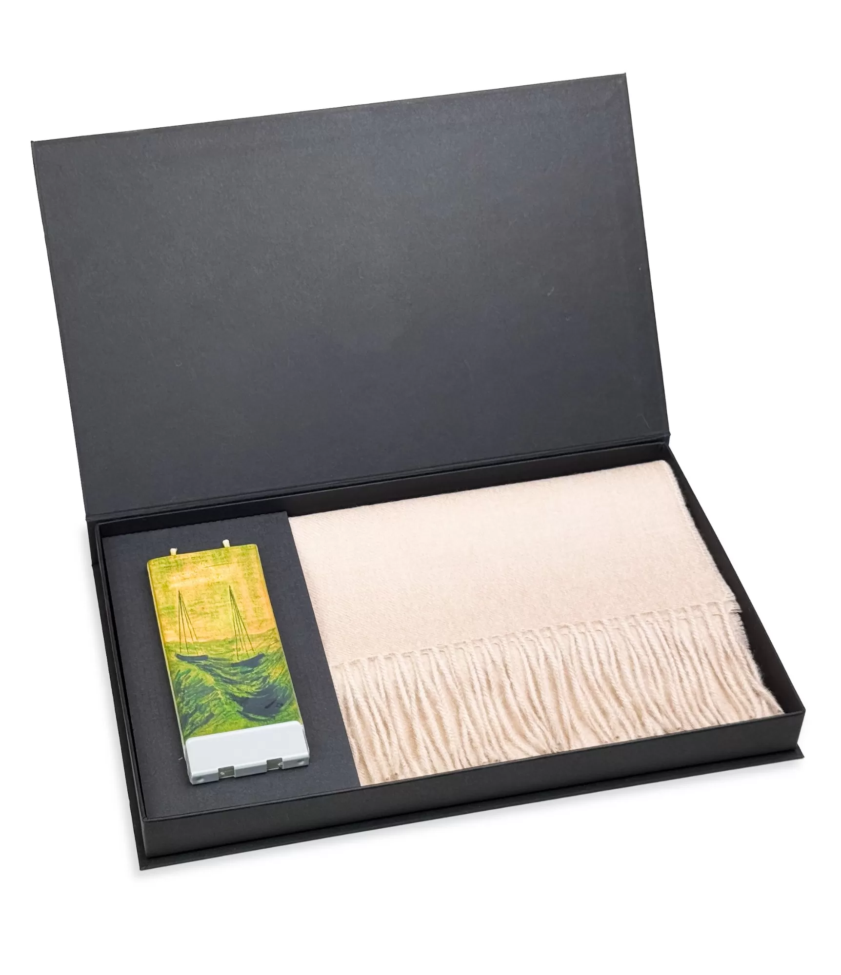 Šajā dāvanu komplektā ir apvienota elegance, komforts un mākslinieciska simbolika. Galvenā uzmanība – 100% bērnu alpakas vilna, ko raksturo īpašs maigums, maigums un izturība. Sieviešu smilškrāsas un krēmkrāsas ki šalics ir daudzpusīgi, viegli pielāgojami dažādu stilu apģērbiem, un bārkstis piešķir papildu šarmu. 200x30 cm šalika kļūst par neaizvietojamu aksesuāru jebkurā gadalaikā – gan ziemai, gan svaigā pavasara vakarā. Stilīgie šalics vienmēr ir vairāk nekā tikai apģērba gabals – tie kļūst par oriģinālu dāvanu sievietei, kura novērtē smalkumu, dabiskumu un kvalitāti.