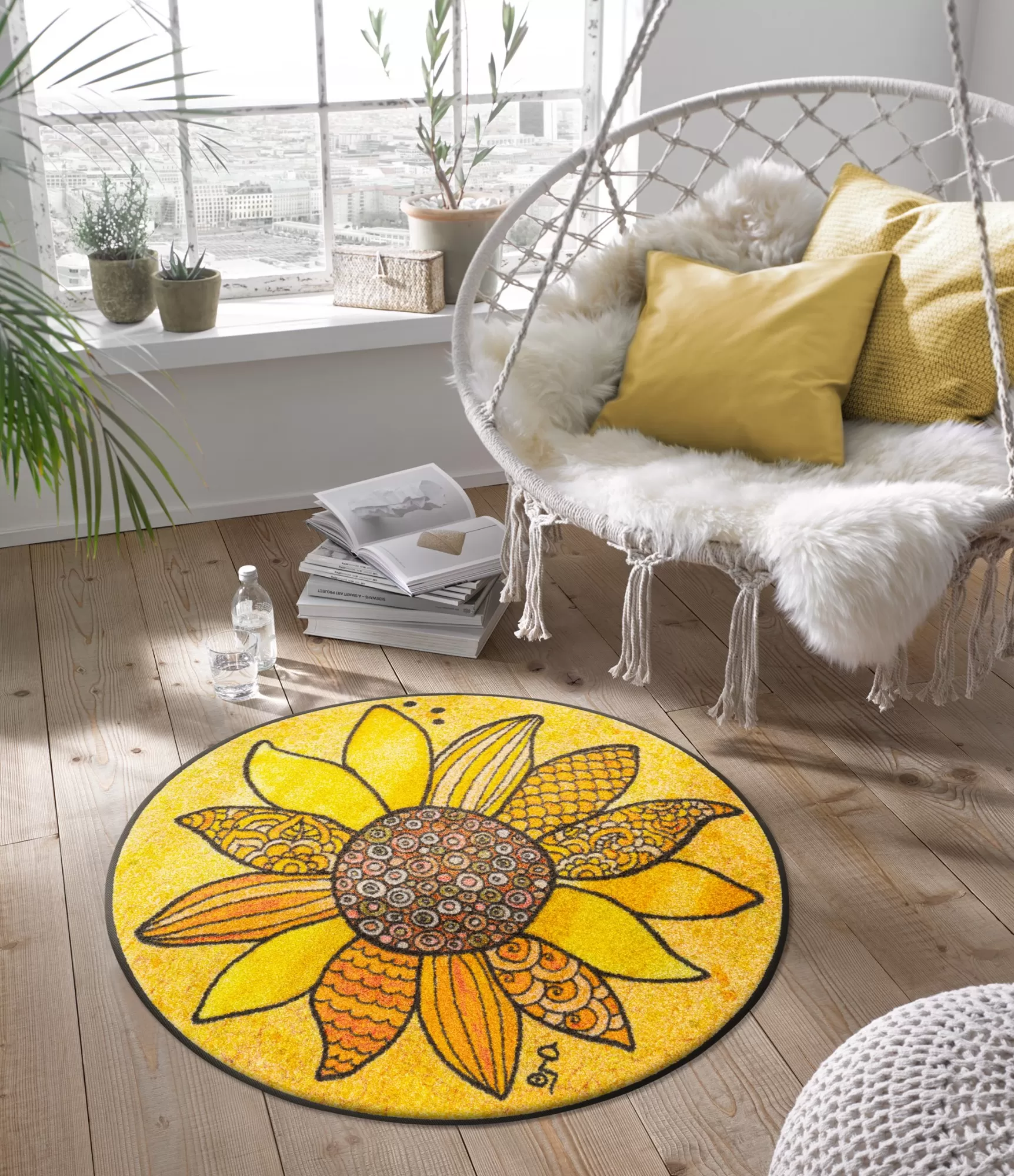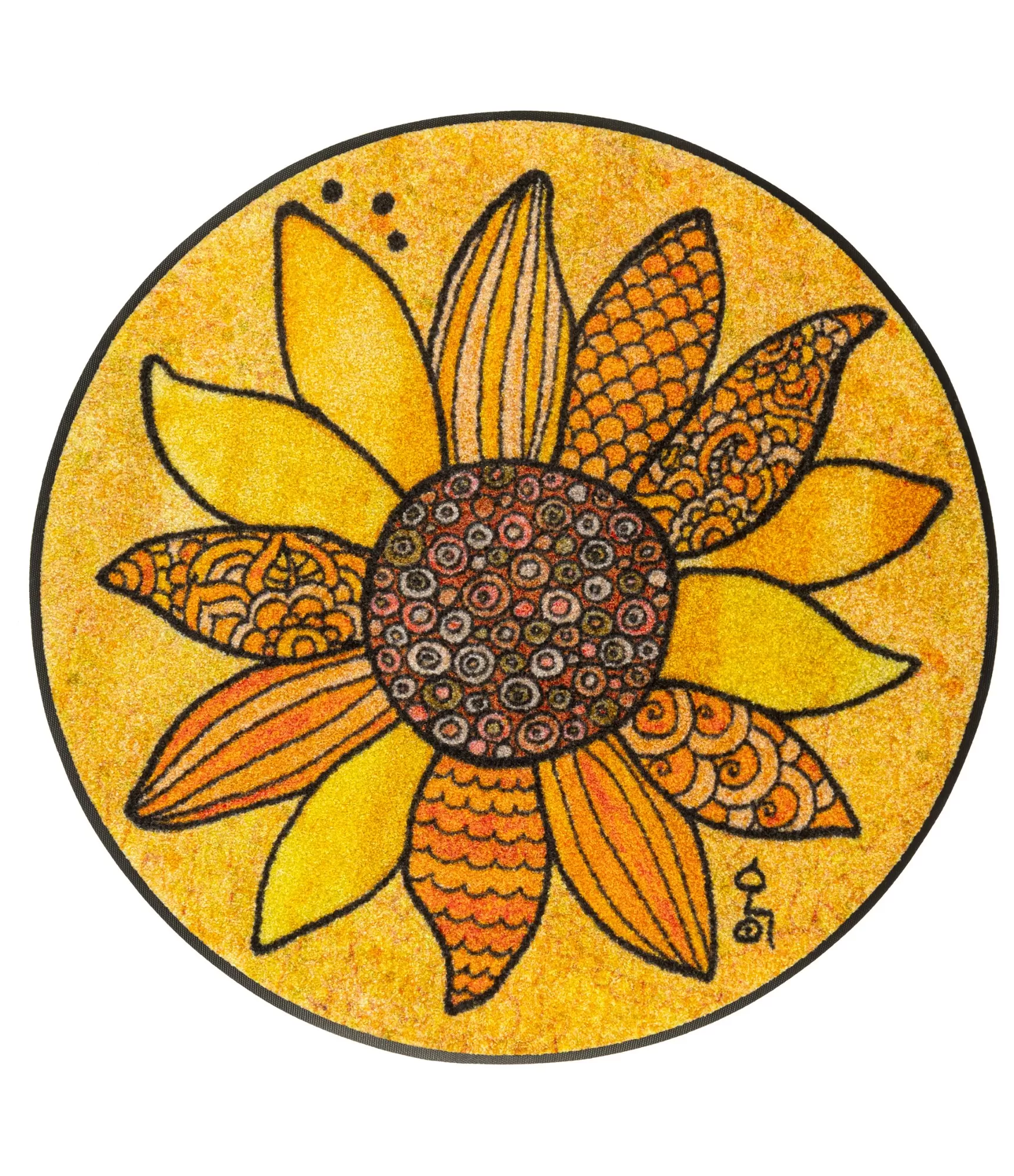 Mazgājams paklājs viesistabai ar apaļu formu un spilgti dzeltenu fonu noteikti piesaistīs uzmanību un piešķirs jūsu mājām krāsu un enerģiju. Paklāja centrā attēlota liela, koša dzeltena puķe, kas rada mājīgu un pozitīvu noskaņu. Tas lieliski piestāv gan gaišiem, gan tumšiem interjeriem, jo dzeltenā krāsa piešķir dzīvīumu un gaismu.