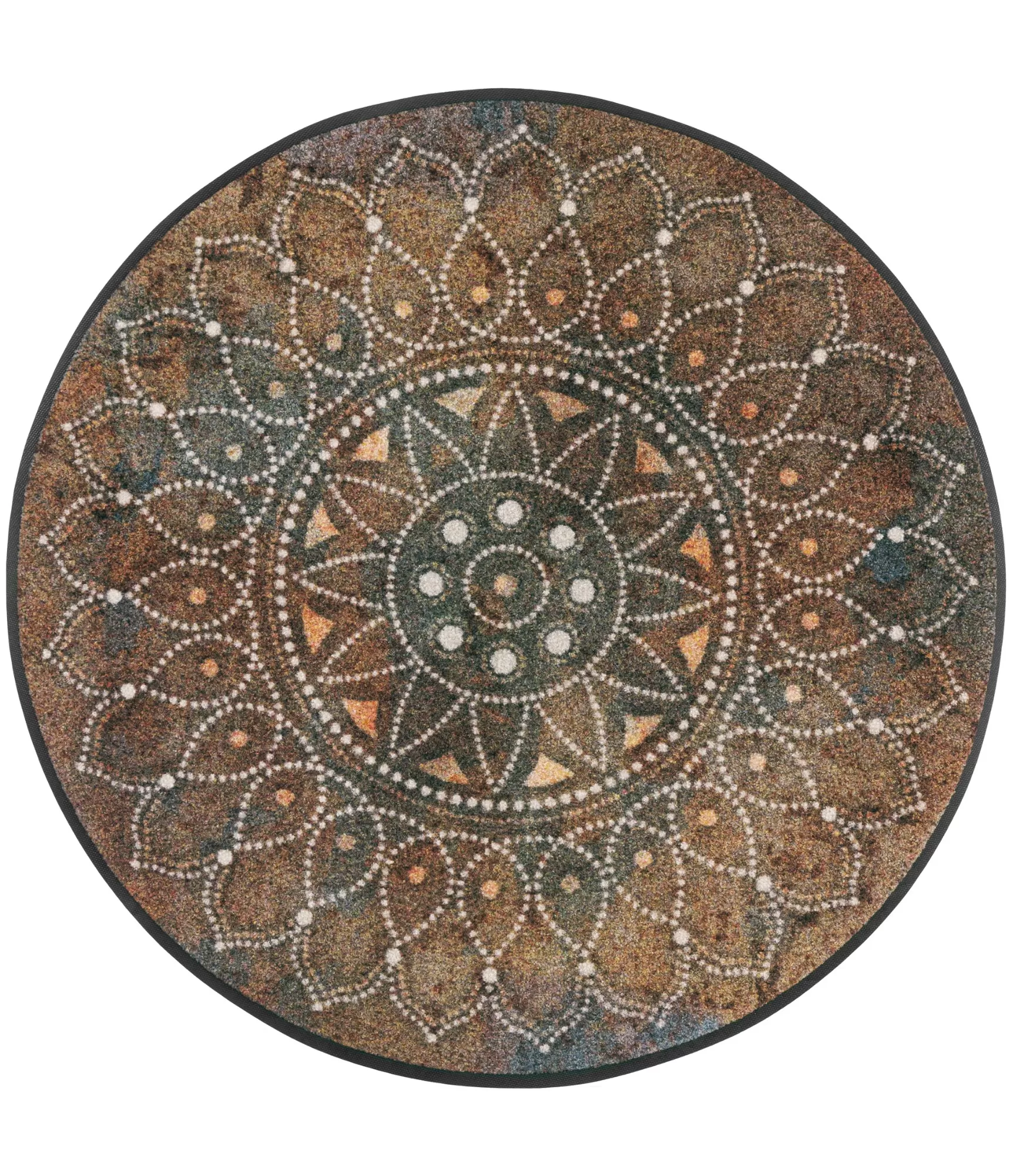 Viens no populārākajiem mūsu paklāju dizainiem tagad pieejams arī apļa formā. Paklājā dominē silti brūnie toņi, kas piešķir interjeram omulību un siltumu. Uz paklāja attēlots smalks "dzīvības zieda" raksts, kas piešķir eleganci un saskaņotu vizuālo akcentu jebkurai telpai.