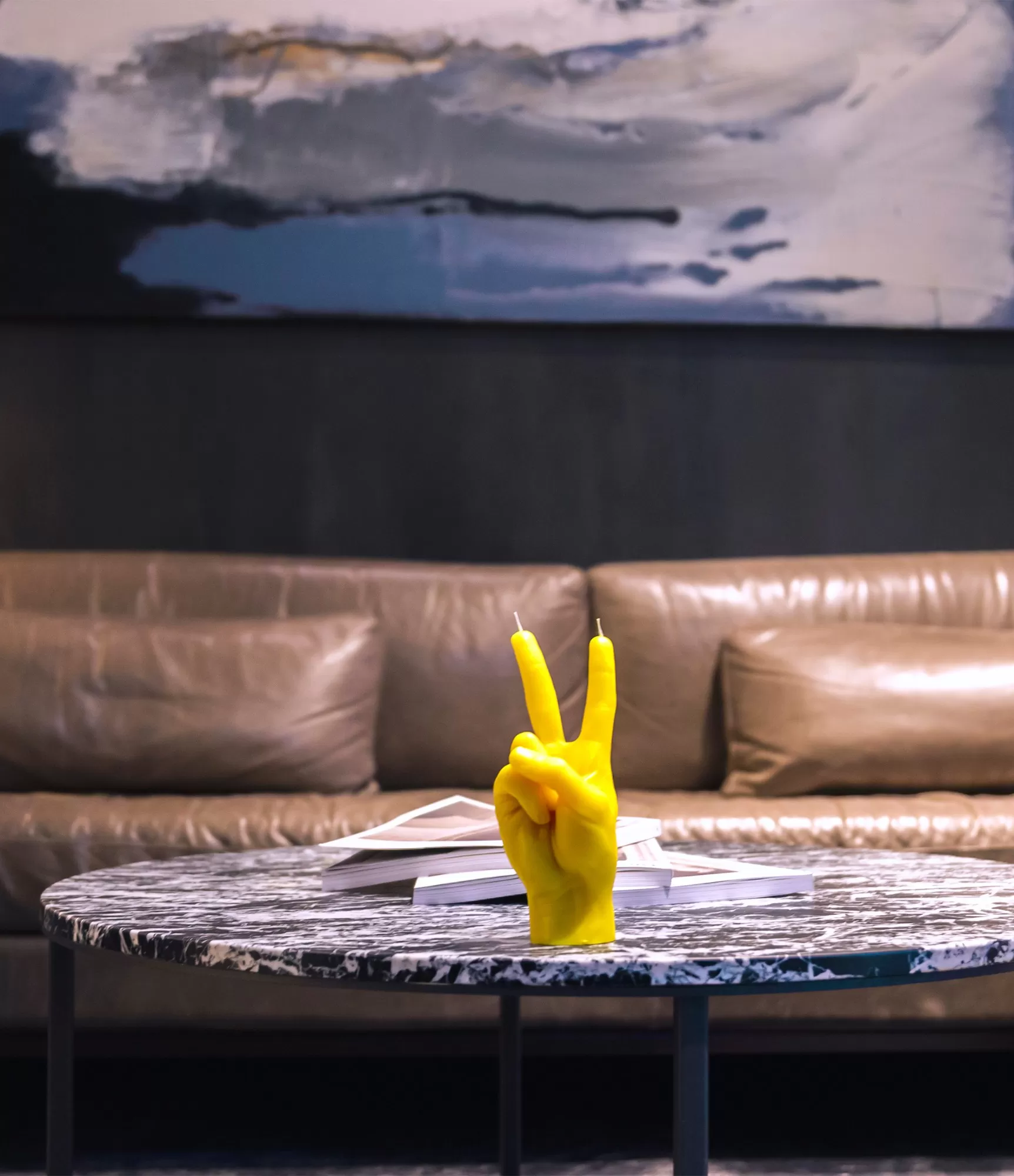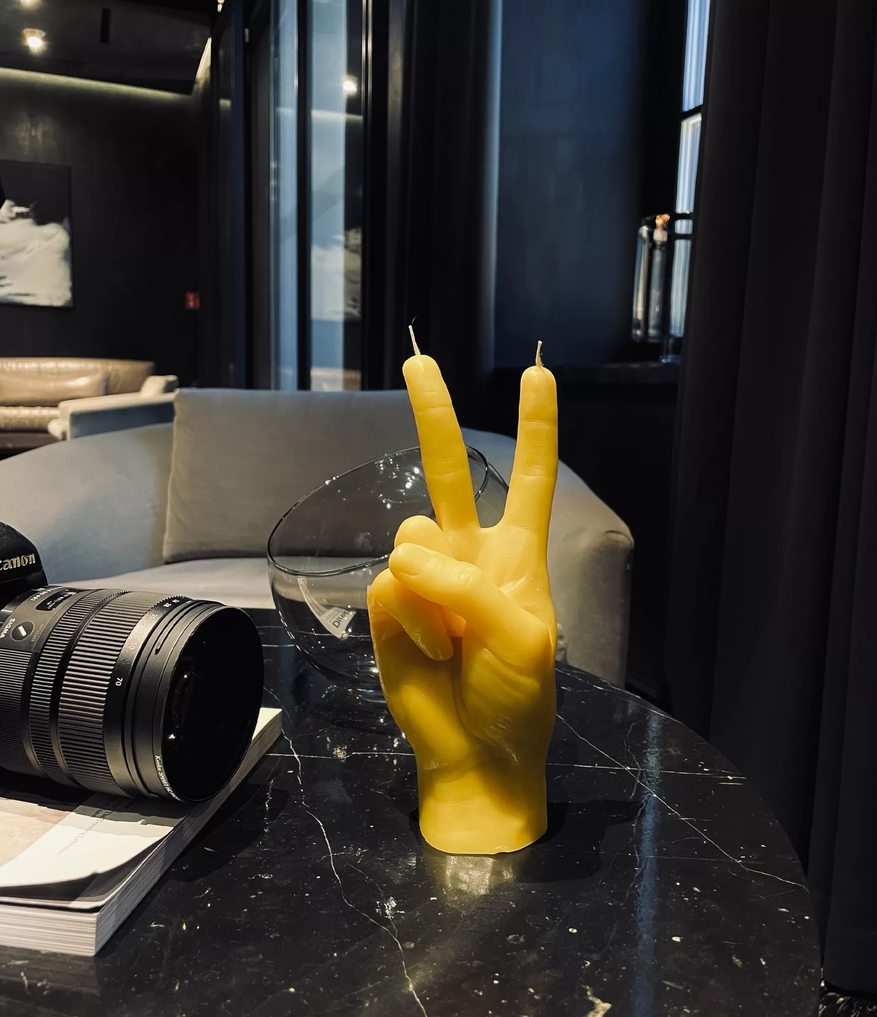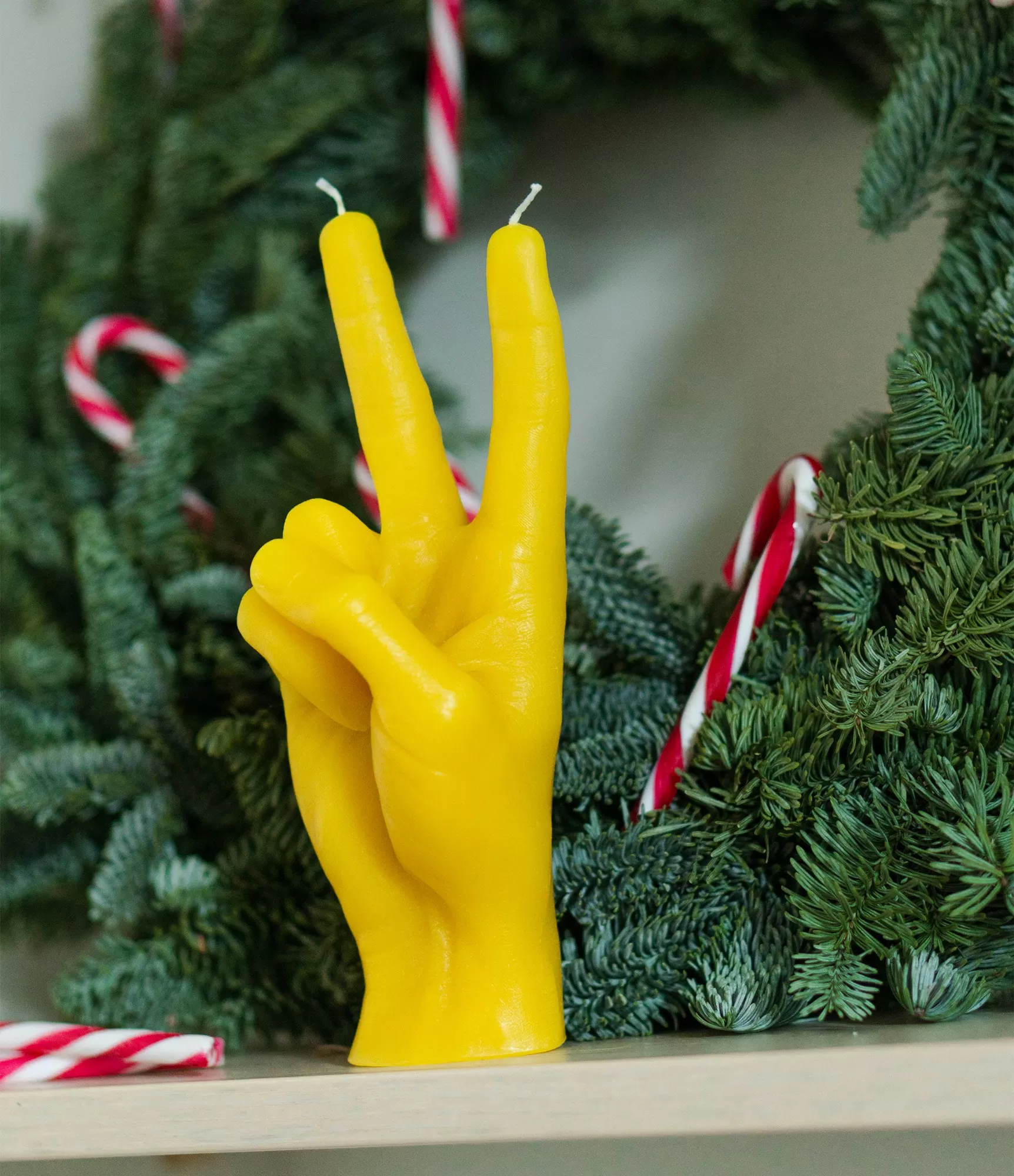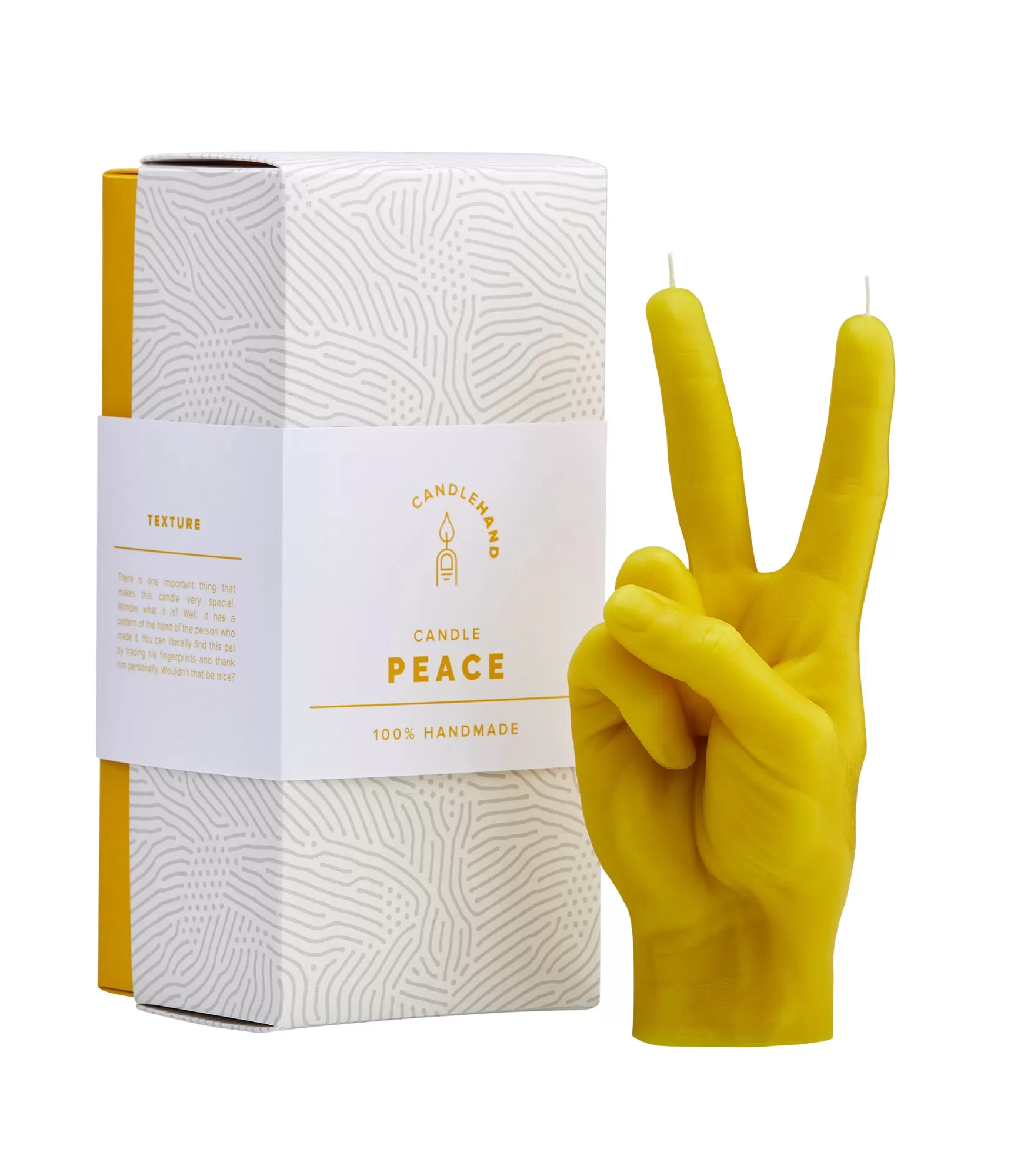 Ar rokām darināta svece Peace Yellow – išdāvanas sveces ar unikālu dizainu un formu katram gadījumam.