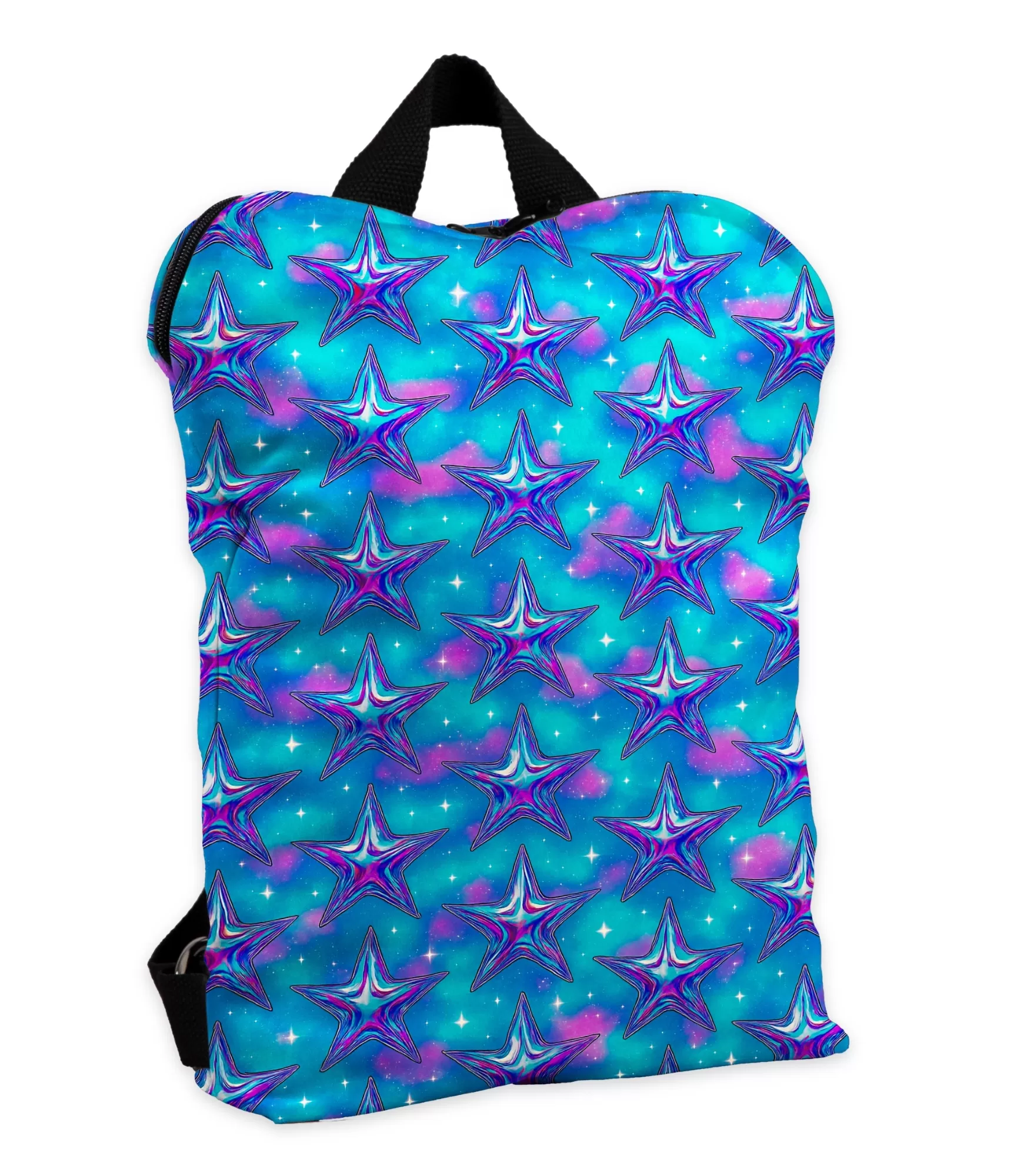 Iedomājieties debesis, kuras visas nakts garumā krāso neona sapņu zvaigznes – ši mugursoma realizē šo attēlu. Spilgts uz zila fona, it kā iš galaktikas dziļākie slāņi un purpursarkanas, rozā un baltas zvaigznes atklājas, katrs – it kā roka būtu atstāta. Katra forma šķiet dzīva – Nedaudz nekārtīga, izteiksmīga, pulsējoša enerģija, it kā tas nebūtu statisks dizains, bet nepārtrauktas kustības pasaule. Fons atgādina nakts debesis virš fantāzijas pasaule – tā spīd kā svece, kurā saplūst rozā miglāji, debeszili gaismas zibšņi un mirgojošas mazas zvaigznes. Š tēls izstaro rotaļīgumu, bet tajā pašā laikā spēcīgu personību – šī ir mugursoma tiem, kas nebaidās tikt pamanīti.