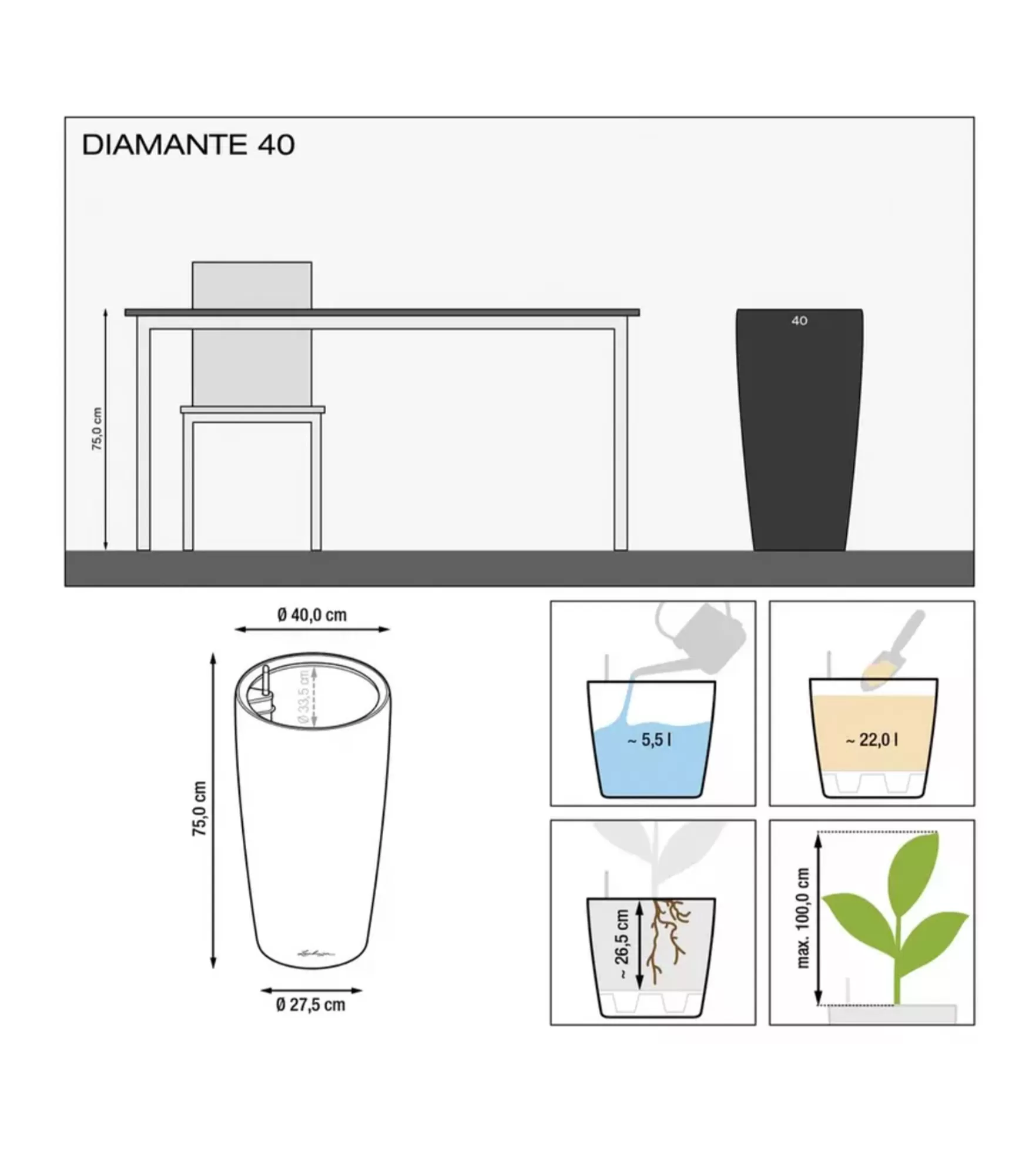 Visi LECHUZA puķu podi ietver ārējo podu un laistīšanas sistēmu, kas nodrošina labāku augu augšanu.