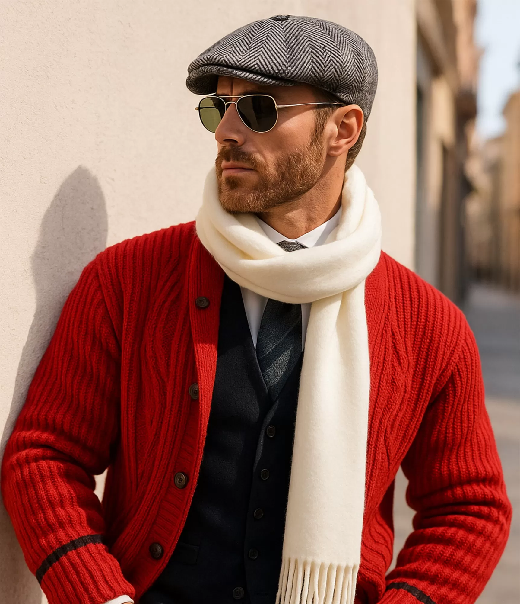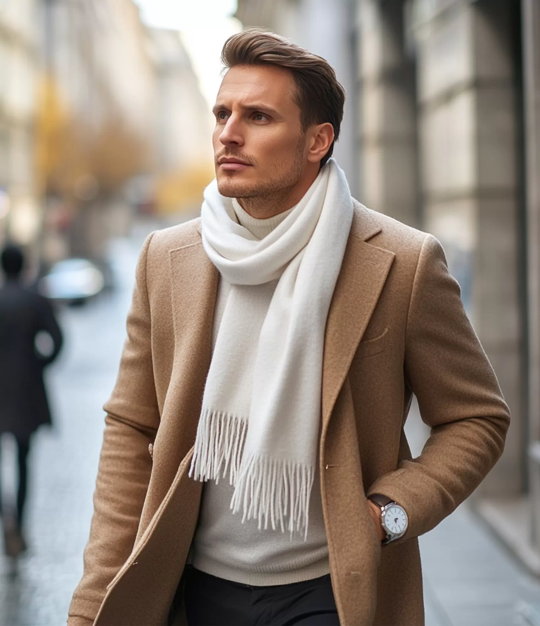 Šī baltā vīriešu šalle ir izsmalcinātas elegances simbols — tā piemērota vīrietim, kurš augstu vērtē tīru, universālu un gaumīgu stilu. Baltā krāsa vienmēr izskatās nevainojami: kombinācijā ar tumšu mēteli tā rada izteiktu, pamanāmu kontrastu, savukārt ar gaišākiem apģērbiem tā saplūst harmoniski, piešķirot izskatam maigumu un kārtību. Minimālistiskais dizains un smalkie pušķi piešķir šallei klasisku raksturu, padarot to piemērotu gan ikdienas, gan svinīgiem tērpiem.