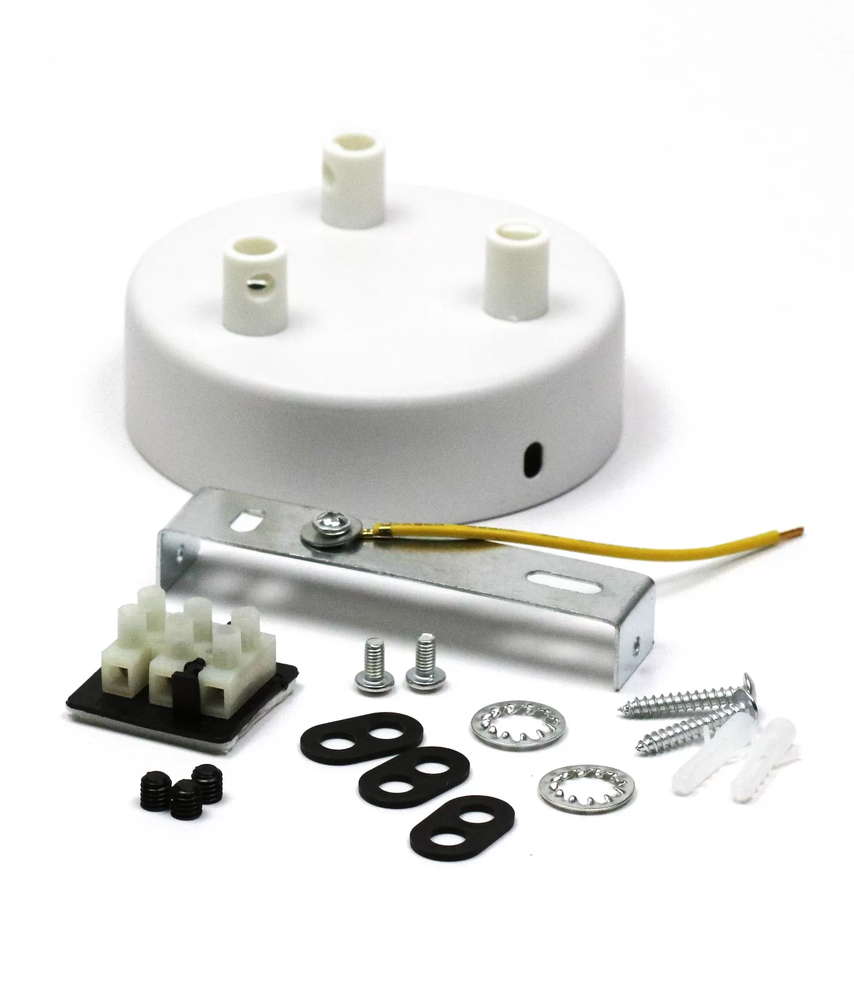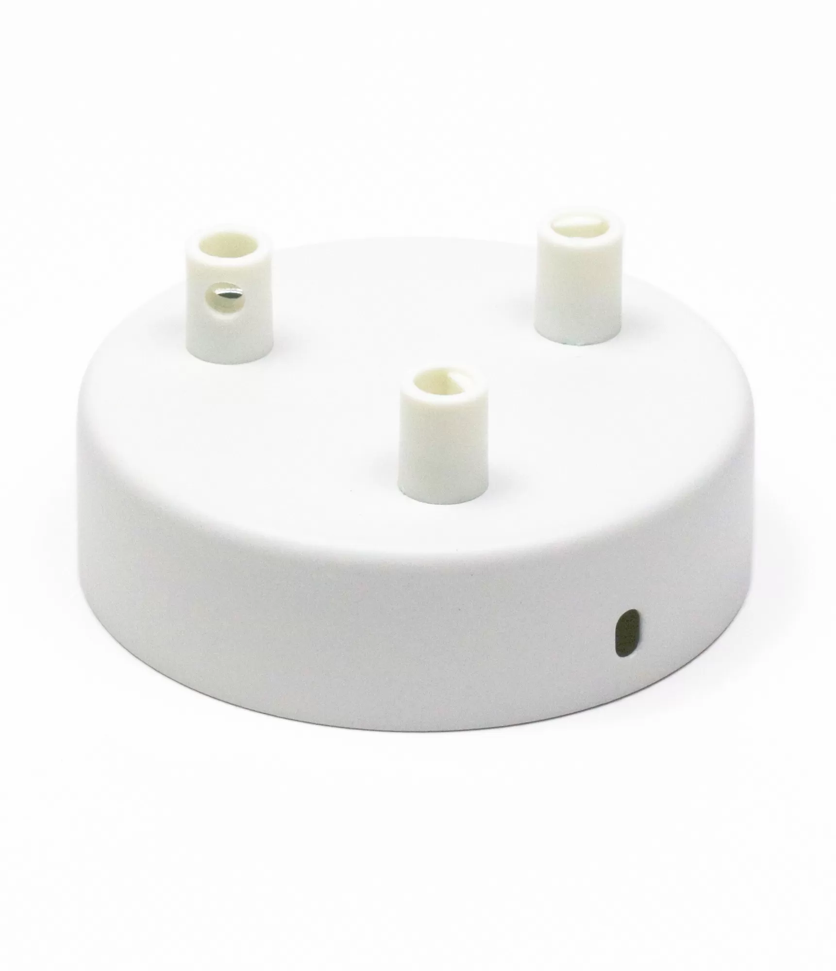 Metāla plafons gaismeklim. Diametrs – 10 cm, augstums – 3 cm, attālums starp vadu pievienošanas atverēm – ~ 4,2 cm. Balts. 3 caurumi.