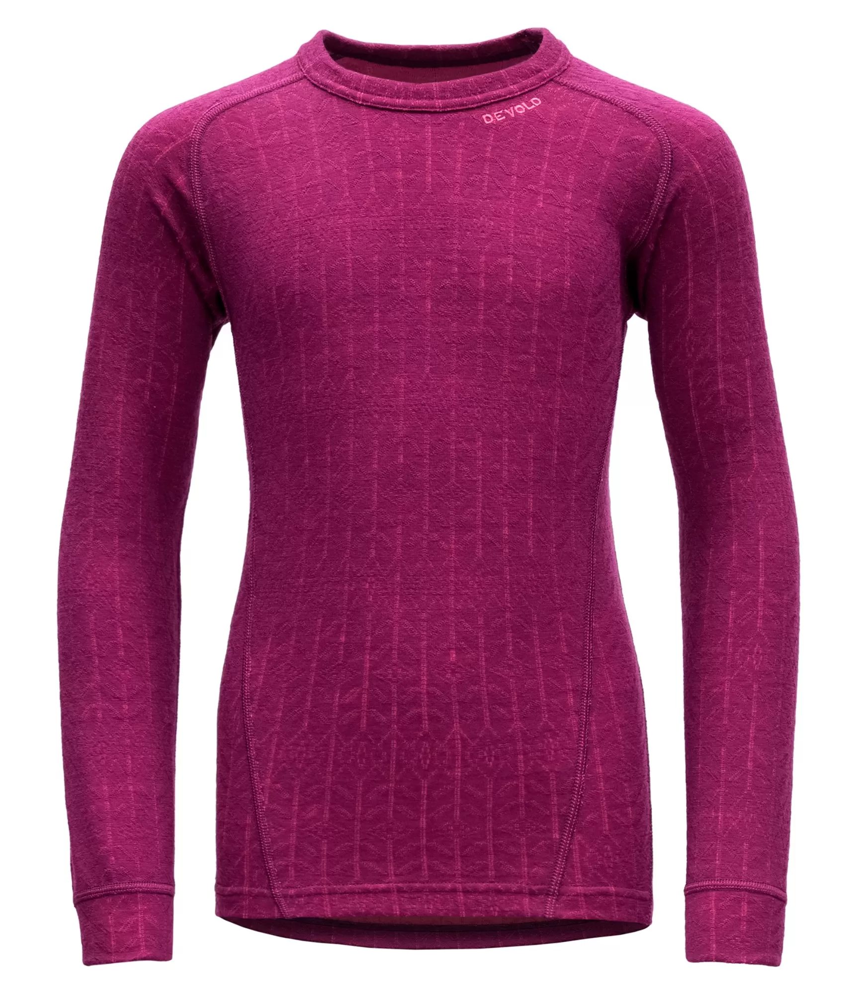 DEVOLD Duo Active termokrekli bērniem un pusaudžiem vecumā no 10 līdz 16 gadiem ar garām piedurknēm un apaļu kakla izgriezumu, bagātīgā rozā krāsā. Tie ir dubultā slāņa termokrekli ar iekšējo ThermoLite šķiedru, kas maksimāli palielina liekā mitruma iztvaikošanu. Audumam ir teksturēts izskats ar smalku ģeometrisku rakstu. Termotops ir mīksts, ļoti elpojošs un tam ir plakanās šuves, kas nodrošina komfortu un izturību.