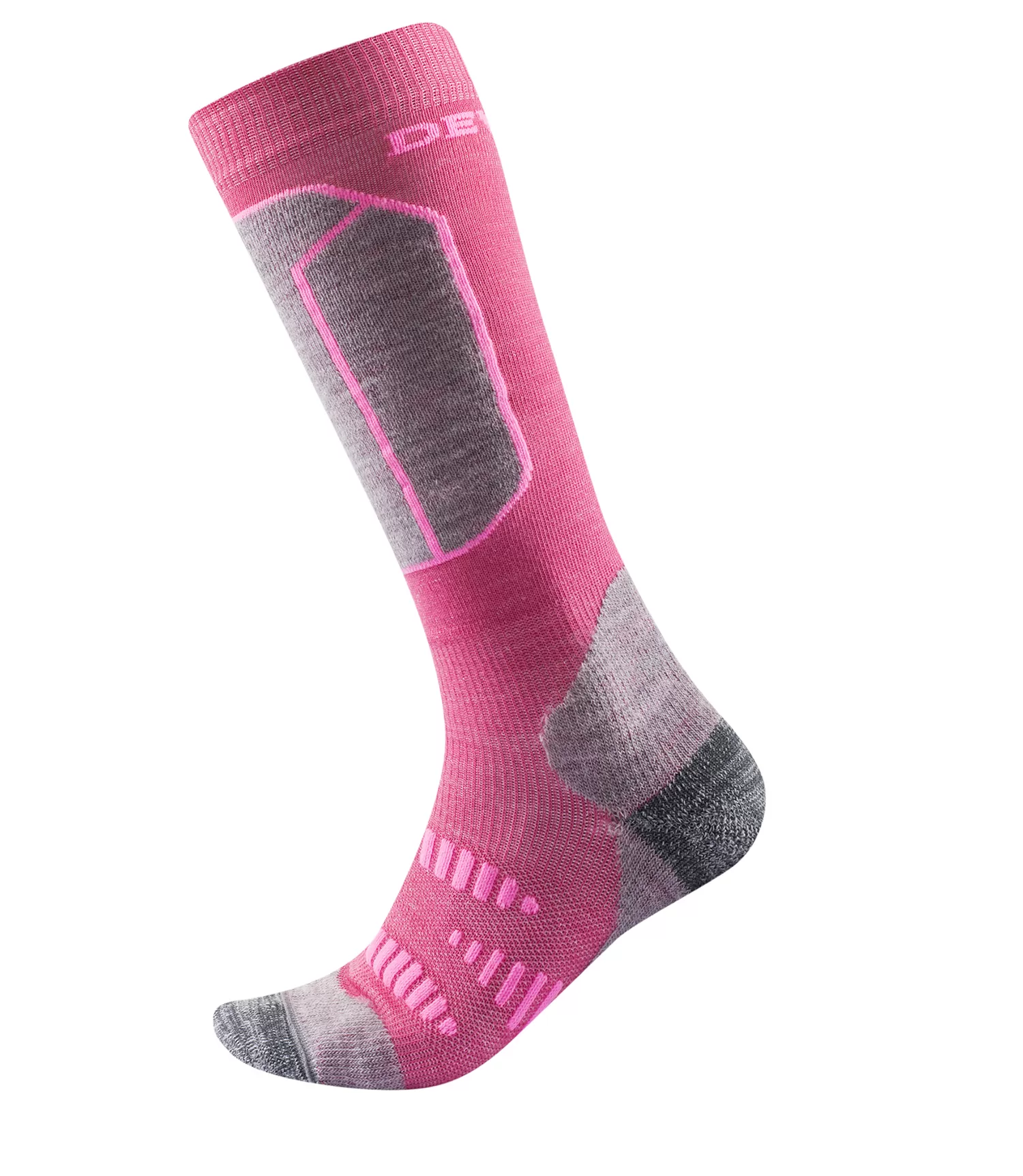 Zeķēm ir pārdomāts sporta dizains, kas nodrošina izcilu kājas atbalstu un komfortu aktīvas slēpošanas vai citu sporta aktivitāšu laikā. Neon rozā DEVOLD zīmola logo ir redzams pie augšējās malas.