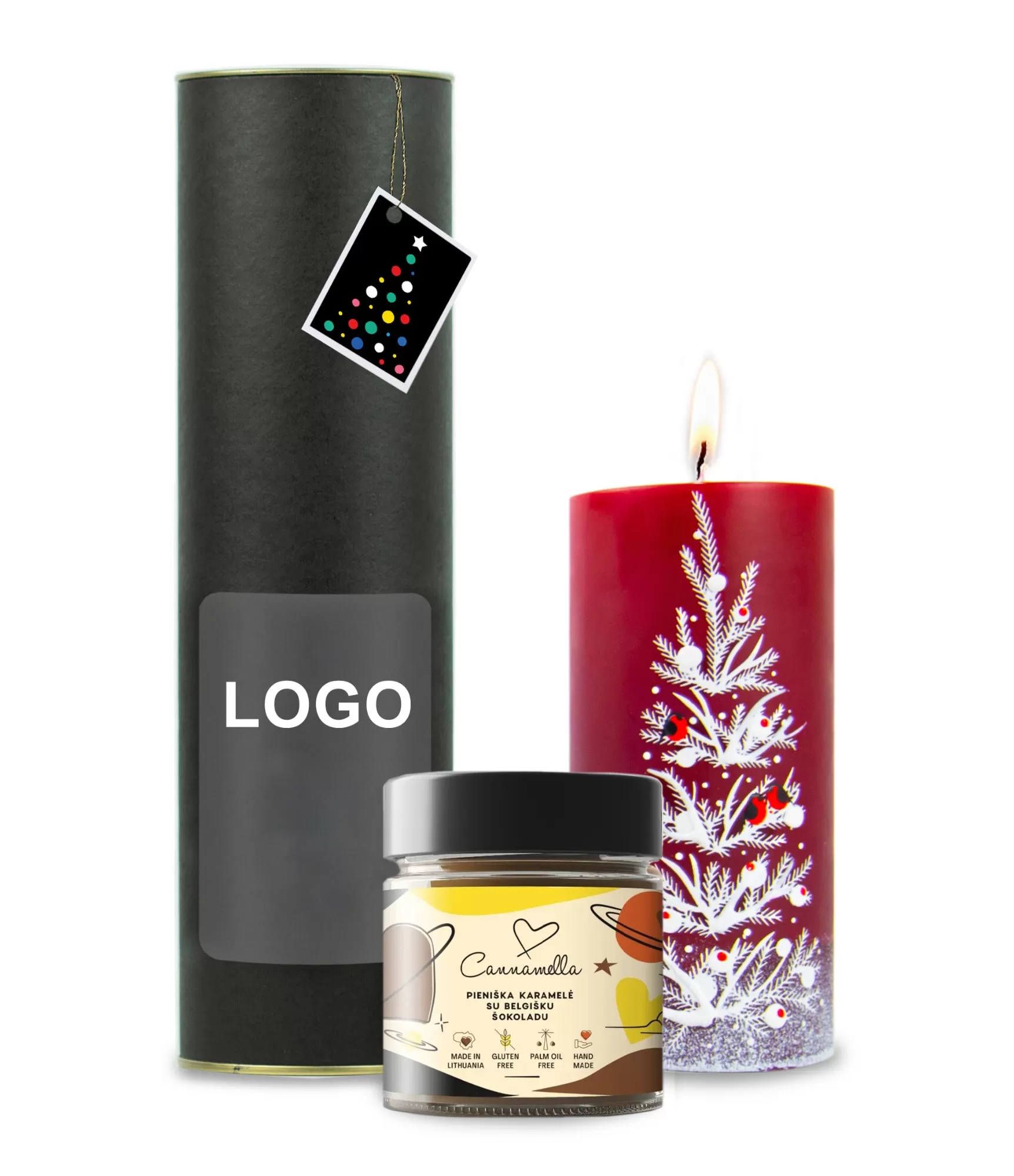 Ziemassvētku biznesa dāvanu komplekts - ar rokām darināta dekorēta Ziemassvētku svece un piena karamele ar beļģu šokolādi, ko īpaši mīl saldummīļi. Tas viss ir iepakots Ziemassvētku izrotātā iepakojumā.