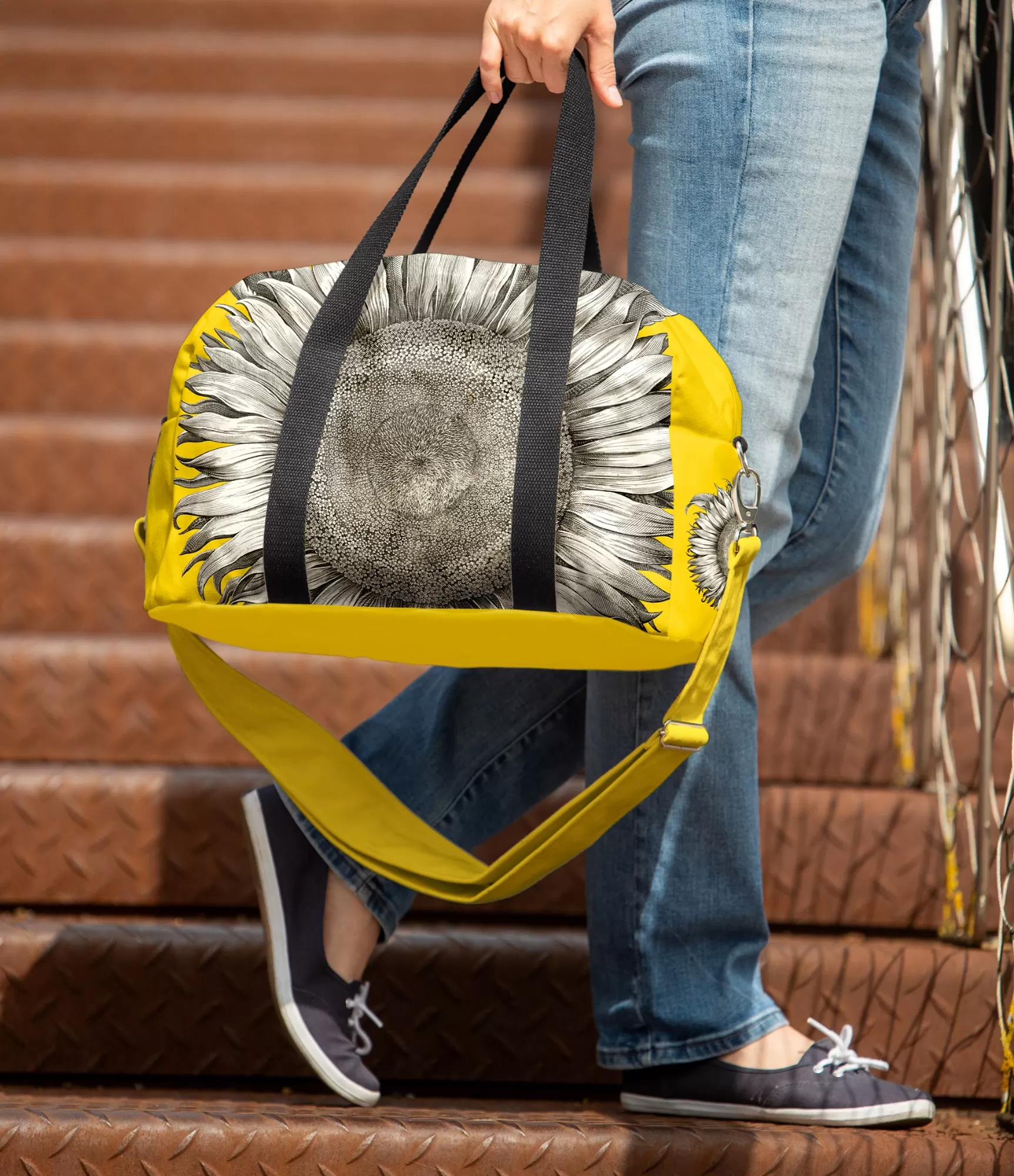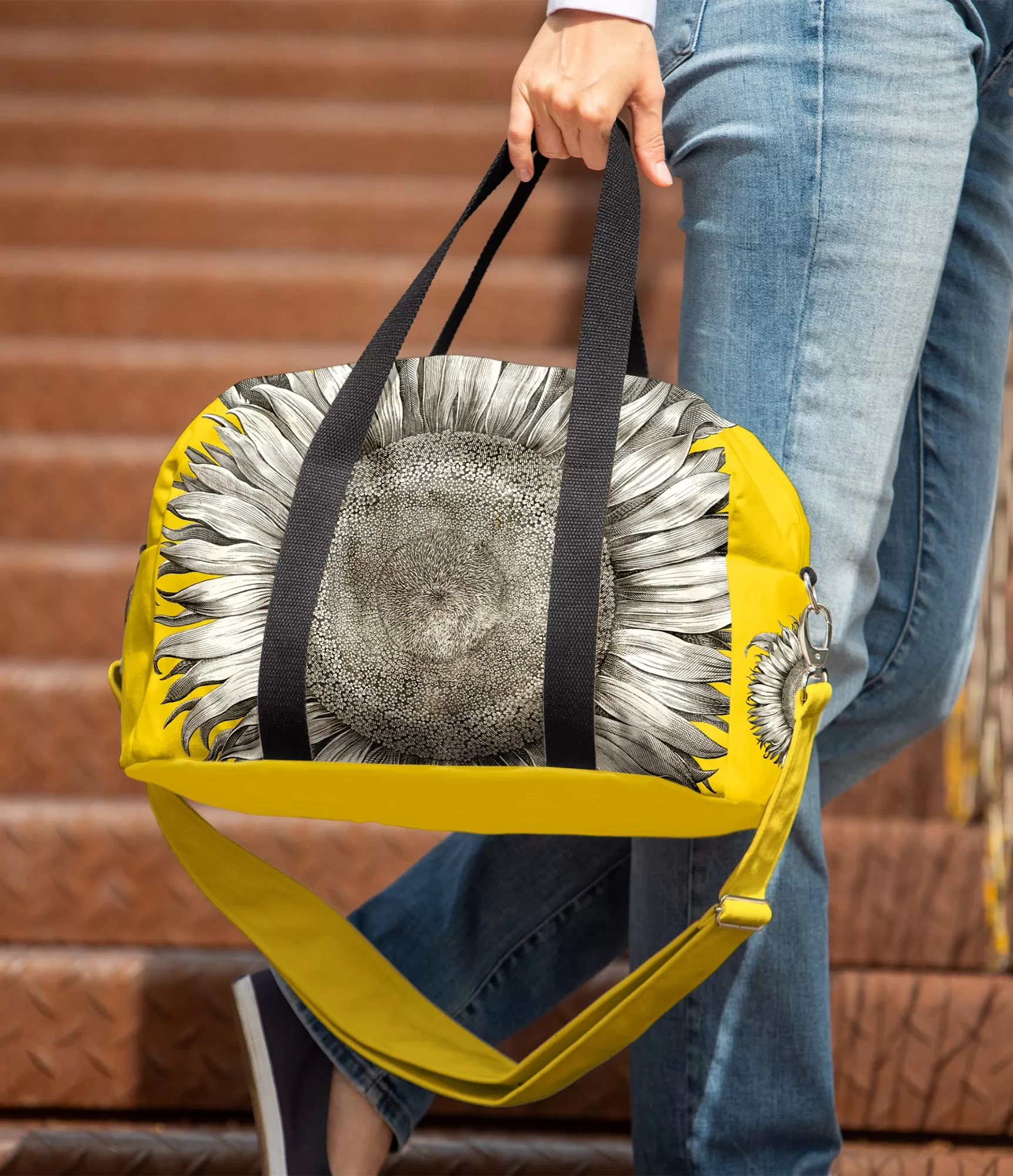 Ietilpīga ceļojumu sporta vai sporta soma ar regulējamu siksnu dzeltenā un saulespuķu rakstā ir lieliska izvēle. Tas ir izturīgs un ilgmūžīgs, tāpēc kalpos daudzus gadus. Praktisks un stilīgs risinājums, īpaši ērts, jo krepu var mazgāt veļas mašīnā.