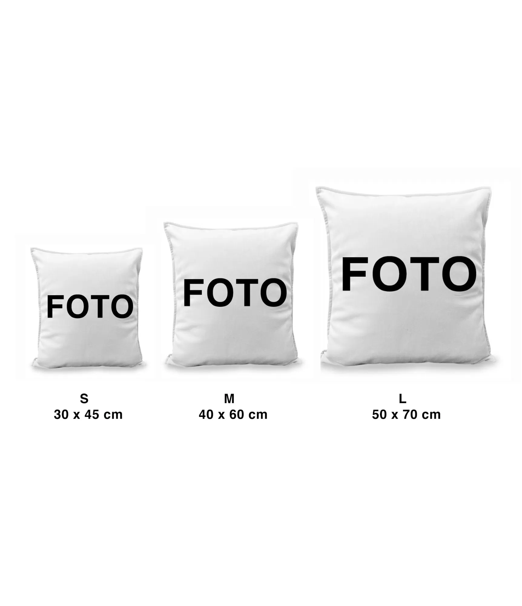 Personalizēti spilveni ir pieejami trīs izmēros – 35 cm, 45 cm un 70 cm, lai jūs varētu izvēlēties piemērotāko variantu atbilstoši fotoattēla veidam un kompozīcijai.