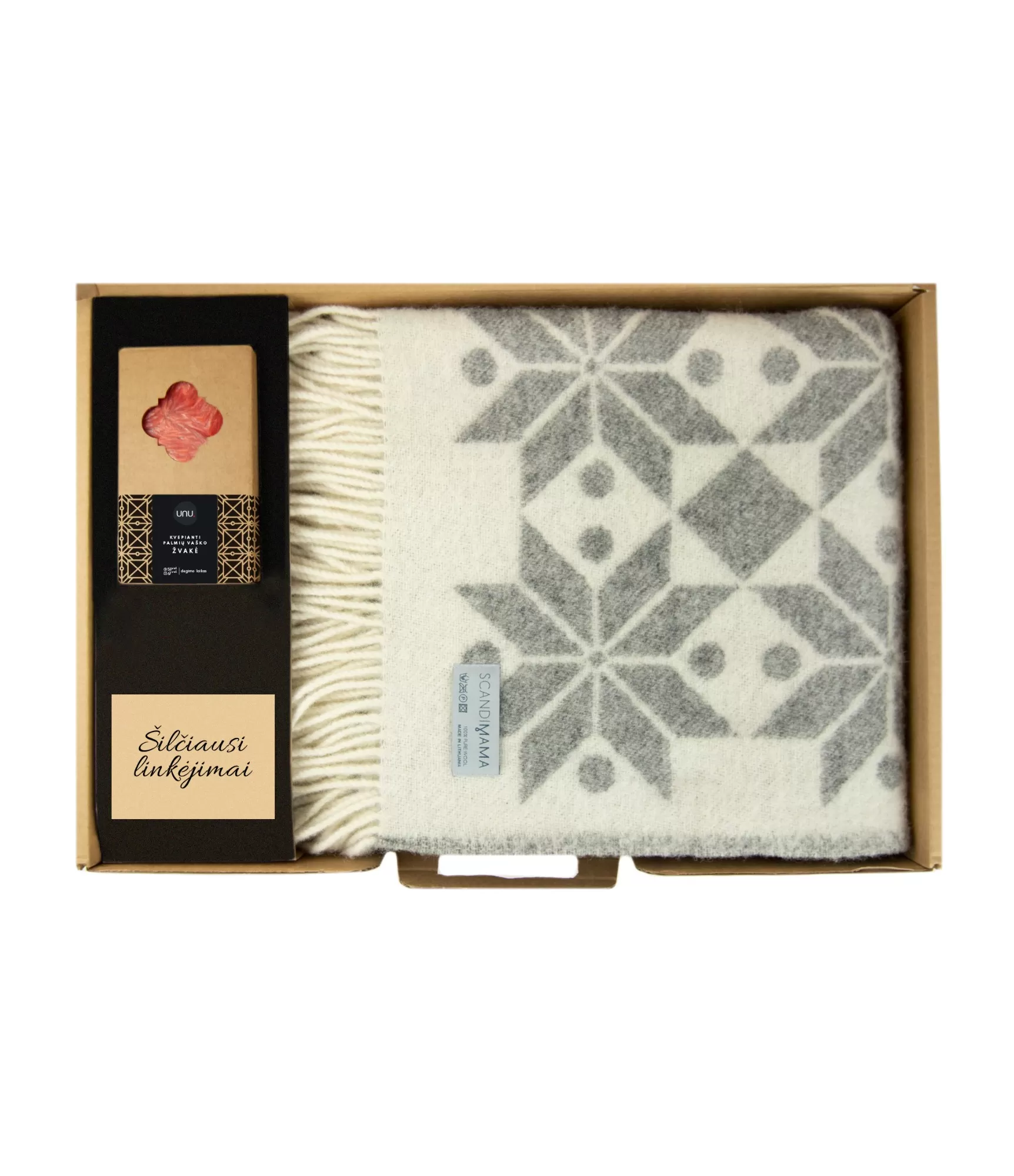 Vilnas pleda un smaržojošās sveces komplekts ir mājīga, silta un vienmēr noderīga dāvana, kas piešķir nozīmi dāvanai.