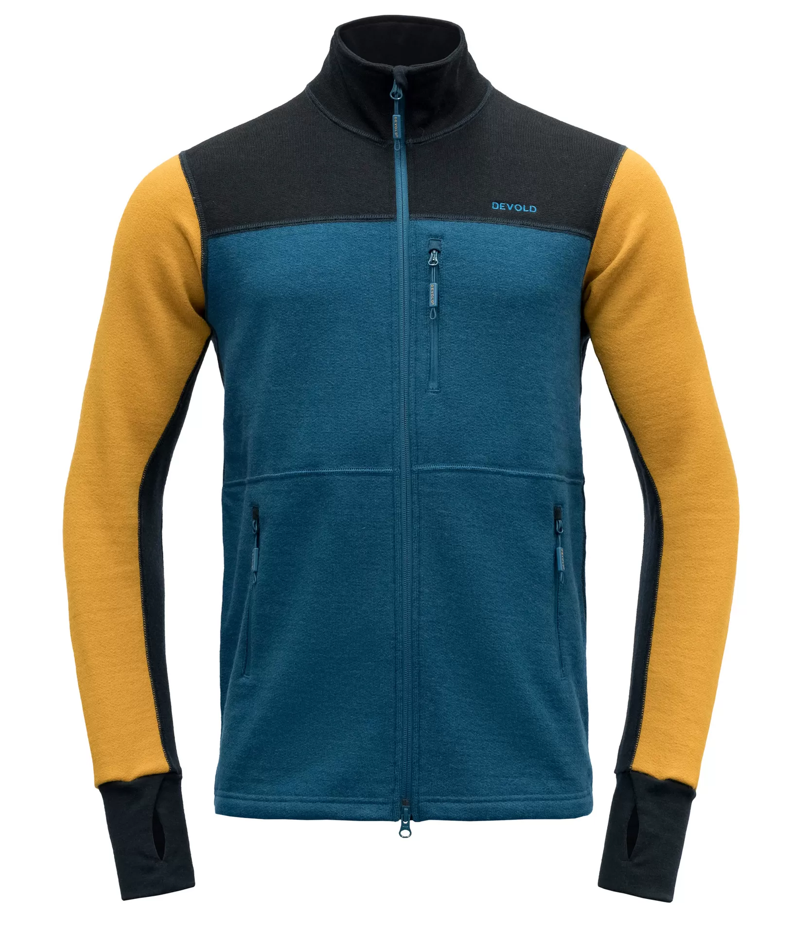 Devold menš termopulovers ar rāvējslēdzēju, divas rāvējslēdzēja kabatas džempera apakšdaļā un viena kabata ar rāvējslēdzēju krūšu rajonā un pagarinātas piedurknes ar plašu īkšķu atstarpi.