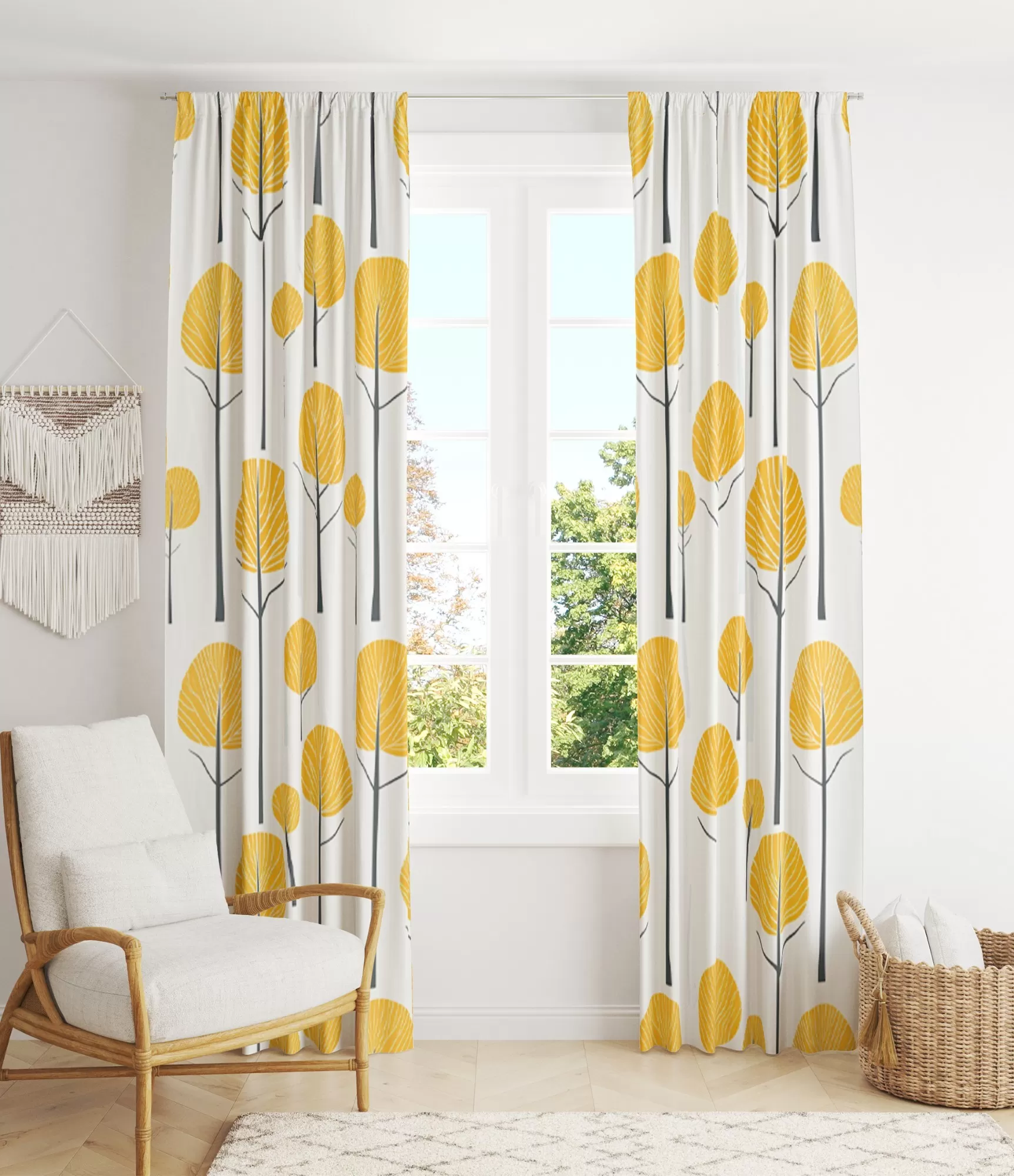 Šie dienas aizkari, dekorēti ar zīmējuma stila dzeltenajiem koku motīviem uz tīra baltā fona, piešķirs jūsu telpai vasarīgu svaigumu un dabisku šarmu. Smalkā dzelteno toņu spēle radīs saulainu un siltu atmosfēru, kas aicina izbaudīt dabas iedvesmoto skaistumu. Minimalistisks un vienlaikus izteiksmīgs dizains harmoniski iederēsies dažādos interjera risinājumos – no mūsdienīgiem līdz klasiskā stila.
