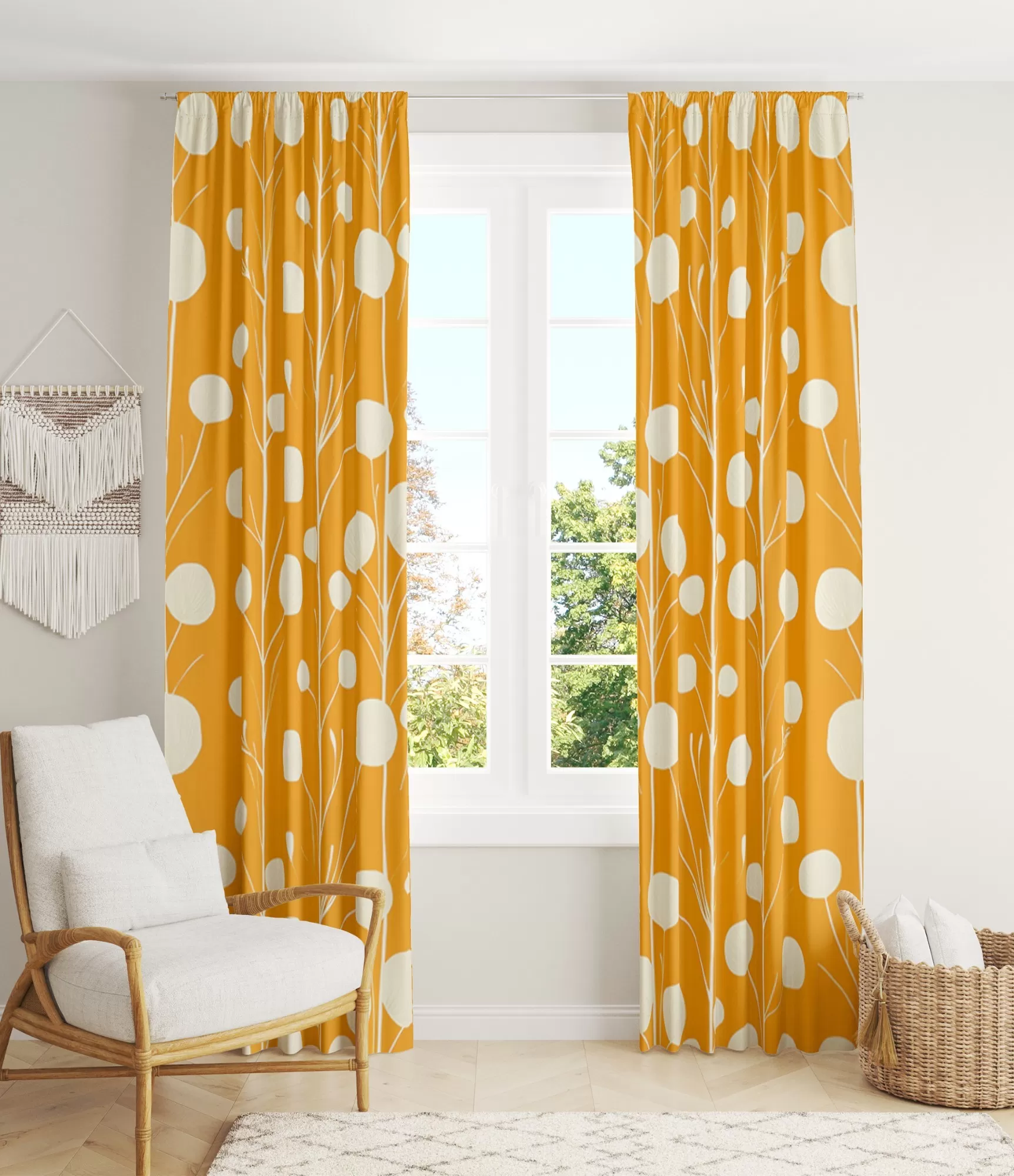 Spilgtais dzeltenais fons atgādina saulainu dienu, tāpēc šie aizkari lieliski iederēsies vasaras mājās, lauku mājā vai atpūtas vietā, kur vēlaties radīt vieglu un gaišu atmosfēru. Šis dizains ļaus jums katru dienu baudīt gaišu un siltu interjeru neatkarīgi no sezonas.