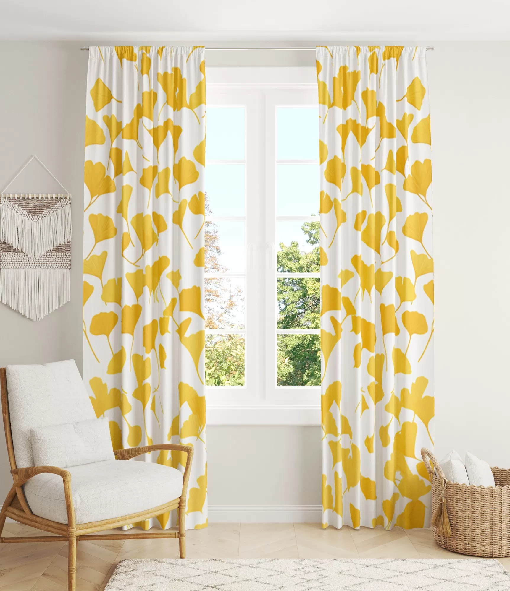 Dienas aizkari ar dzeltenām ginka lapām uz balta fona.