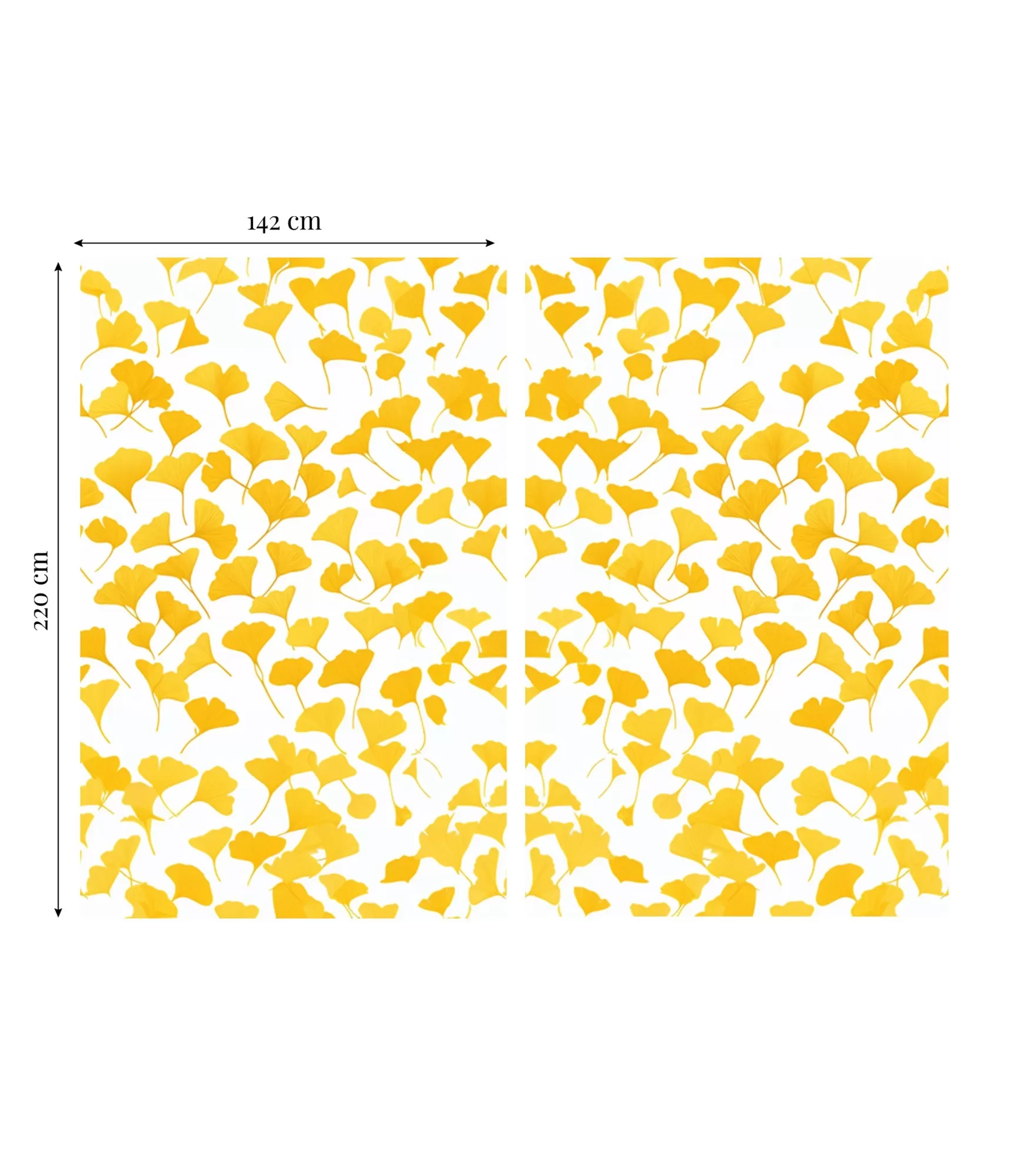 Šie elegantie dienas aizkari ar dzeltenām ginka (Ginkgo biloba) lapām uz gaiši balta fona jūsu telpai piešķirs dabisku šarmu un smalku greznību. Viegls, plūstošs audums rada gaišu un gaisīgu atmosfēru, savukārt izsmalcinātais lapu raksts iedvesmo harmoniju un dabas sajūtu. Tas ir universāls risinājums, kas lieliski piemērots gan moderniem, gan klasiskā stila interjeriem.