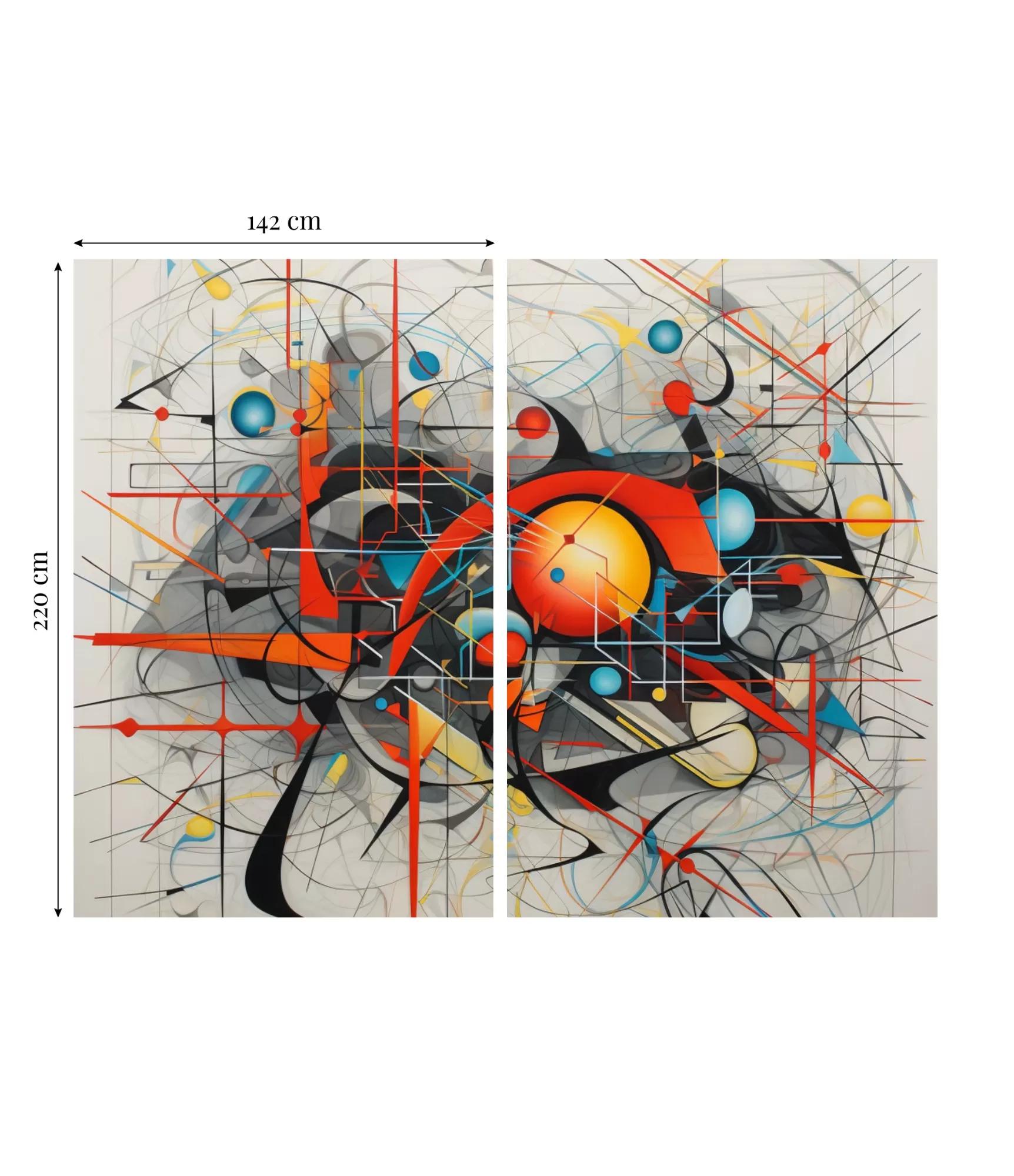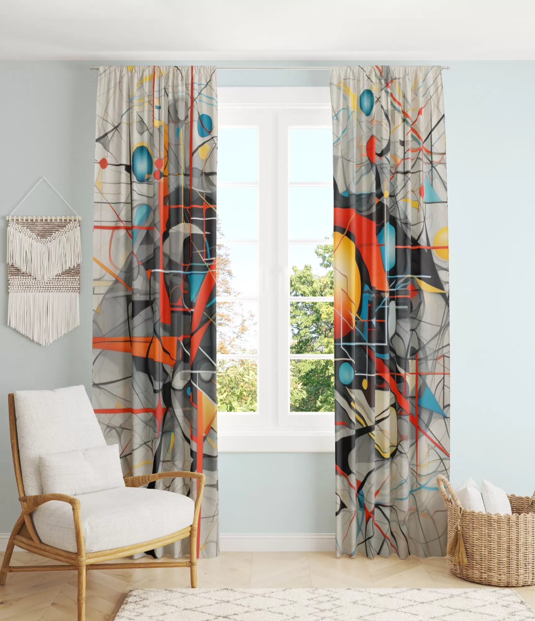 Šie aizkari izstaro enerģiju un kustību, un, lai gan motīvi šķiet nejauši, tie aicina skatītāju atklāt sarežģītas detaļas un interpretēt šo abstrakto, tomēr iedvesmojošo mākslas darbu. Tie ir ideāls risinājums tiem, kas novērtē unikālu un moderno stilu un vēlas radīt atmosfēru, kas ir pilna dzīvotspējas.