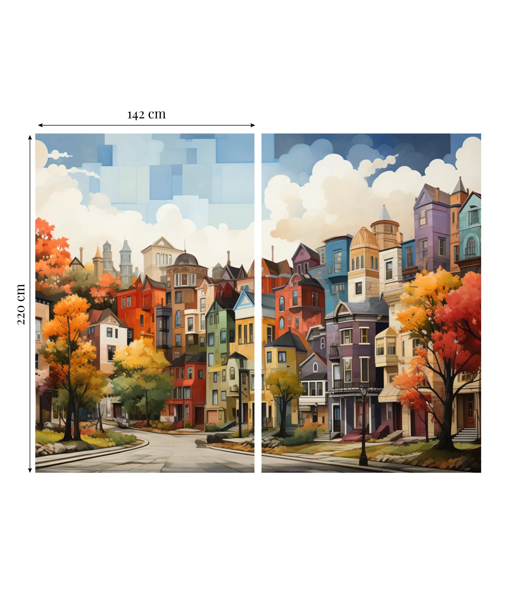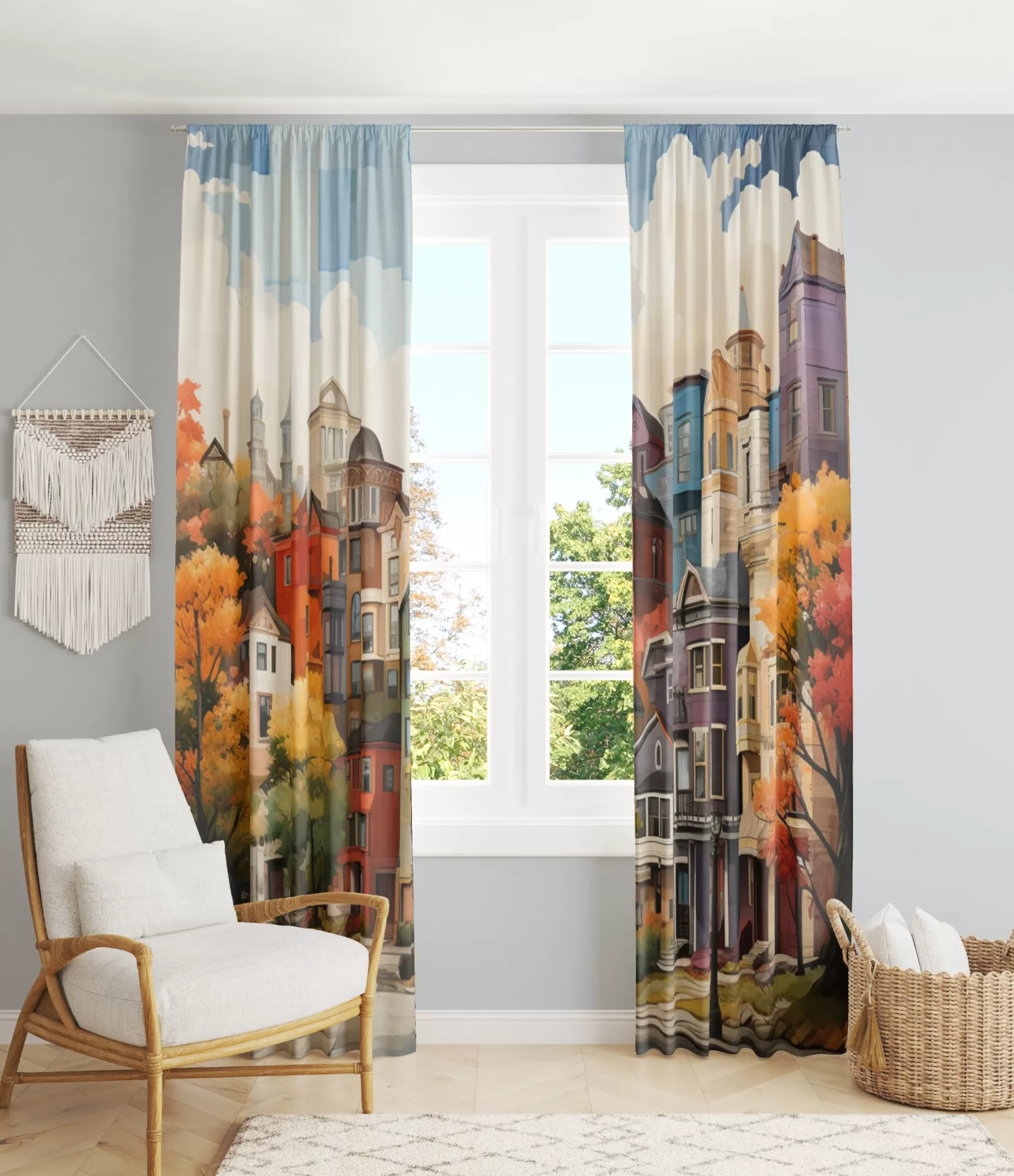Aizkari atspoguļo daudzkrāsainu pilsētas ainavu, kur dažādu augstumu un stilu mājas ir savienotas ar vienotu harmonisku krāsu paleti. Izteiksmīgas sarkanas, oranžas, zaļas, zilas, violetas un dzeltenas krāsas piešķir aizkariem dzīvotspēju, atgādinot fantastisku pilsētas ainavu ar rudens krāsām. Spilgti lapas un svaigs gaiss tikai pastiprina šo mājīgu un dabisko atmosfēru.