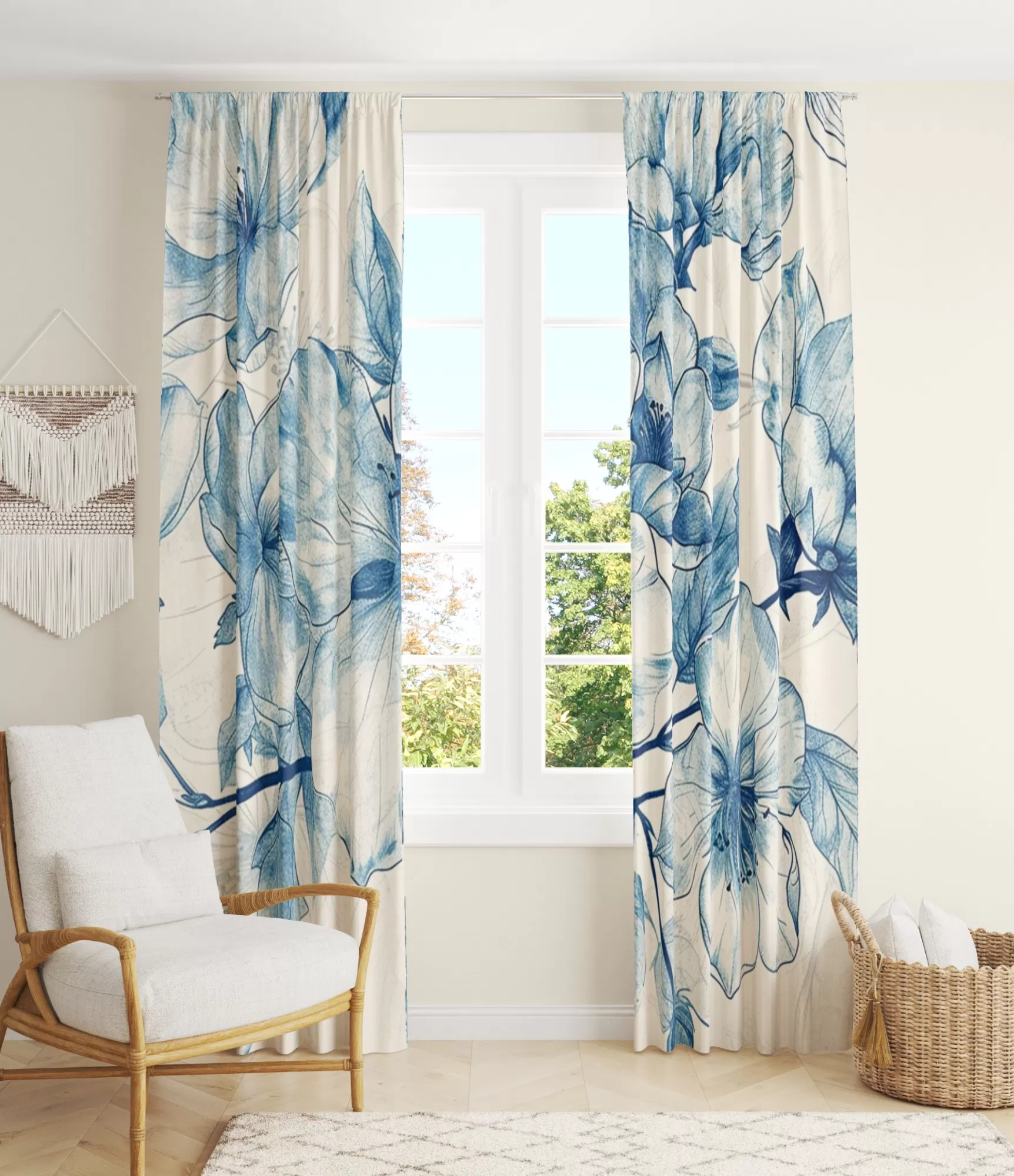 Dienas aizkari ar gaišu fonu un zilām ziedu puķēm piešķirs jūsu telpai smalku skaistuma akcentu un maiguma sajūtu. Šis dizains rada gaišu un mājīgu atmosfēru, ideāli saskaņojoties ar dabisko gaismas plūsmu. Šādi aizkari ne tikai rotās jūsu logus, bet arī radīs nomierinošu un patīkamu istabas interjeru.