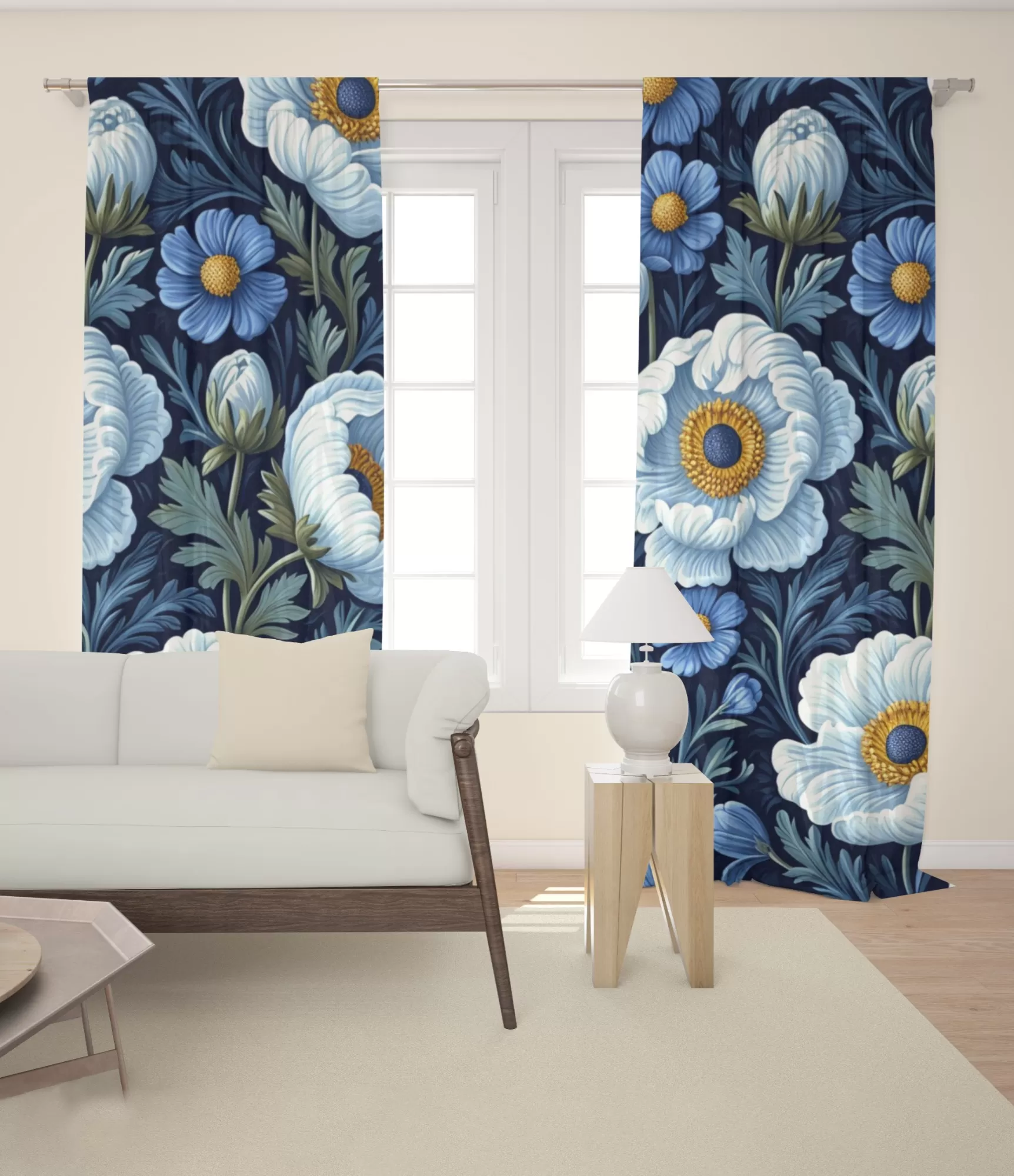 Dienas aizkari zilganā tonī piešķir telpai maigu un mierpilnu atmosfēru. To rotājums – zilie peoniju ziedi – pievieno eleganci un smalkus krāsu salikumus. Šie aizkari ir lieliska izvēle, lai radītu harmoniju un mājīgumu mājās.