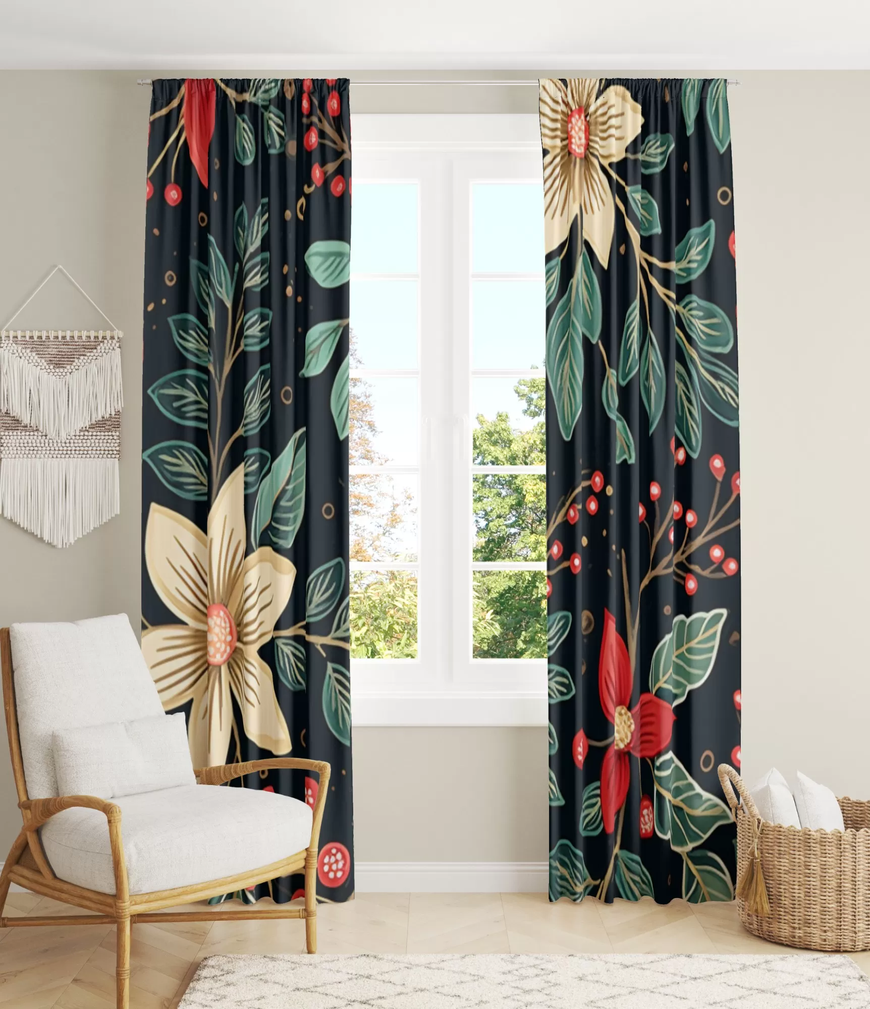 Dienas aizkari ar tumšāku fonu un spilgtiem ziedu ziediem, kas izceļas ar spilgti sarkanu un dzeltenu krāsu, piešķir telpai dramatiska un dzīvīga akcenta sajūtu. Šis dizains ne tikai piesaista uzmanību, bet arī ienes telpā dzīvīgumu un enerģiju. Turklāt šie aizkari ir praktiska izvēle, kas ļauj baudīt izteiksmīgu dizainu bez lielām pūlēm.