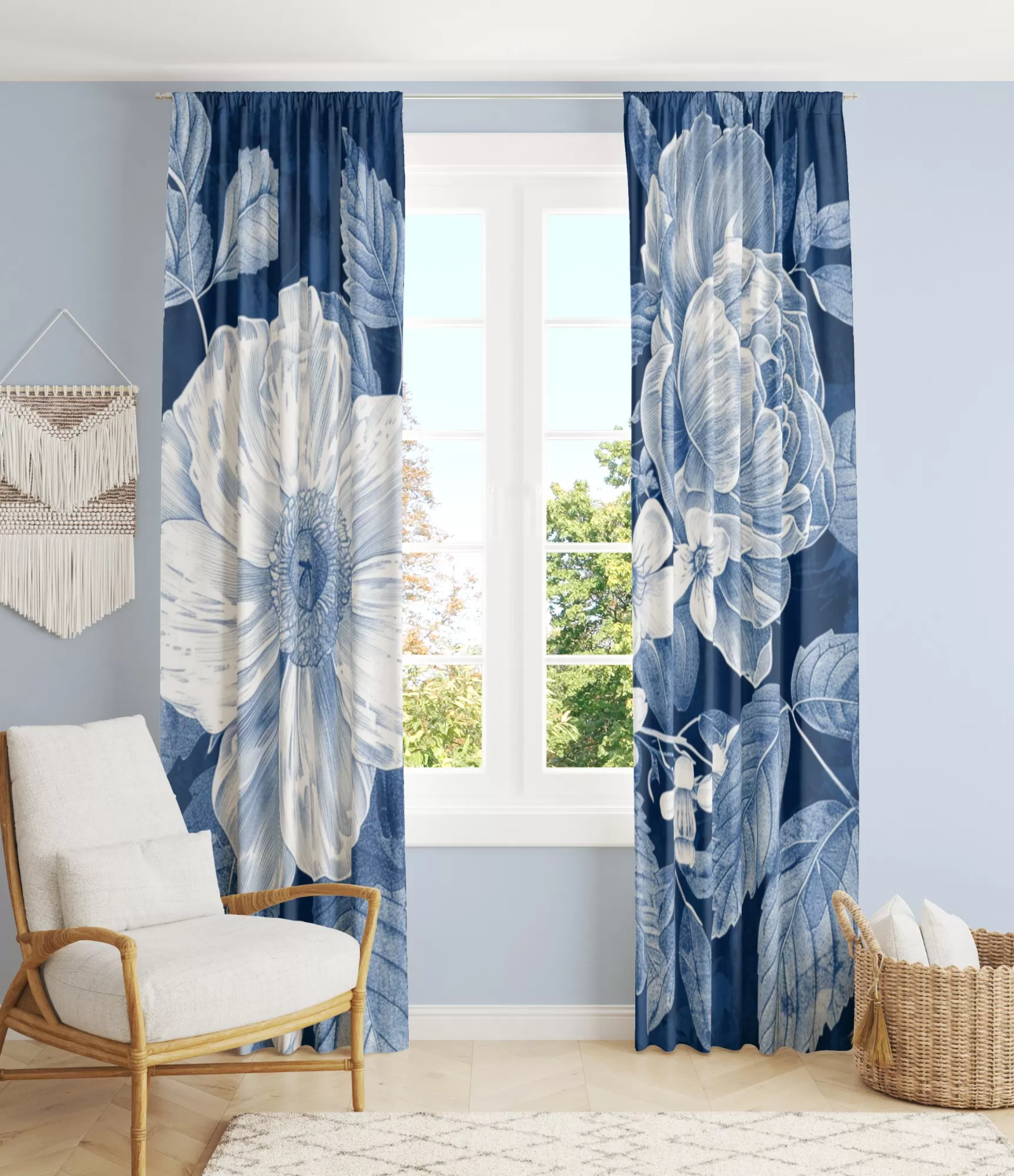 Dienas aizkari zilganā tonī ar lieliem ziedu ziediem piešķir telpai svaigumu un eleganci. To maigi toņi un spilgtie raksti lieliski sader kopā, radot mājīgu un stilīgu vidi. Šie aizkari ir lieliska izvēle, lai ieviestu dabas skaistumu un smalku estētiku mājās.
