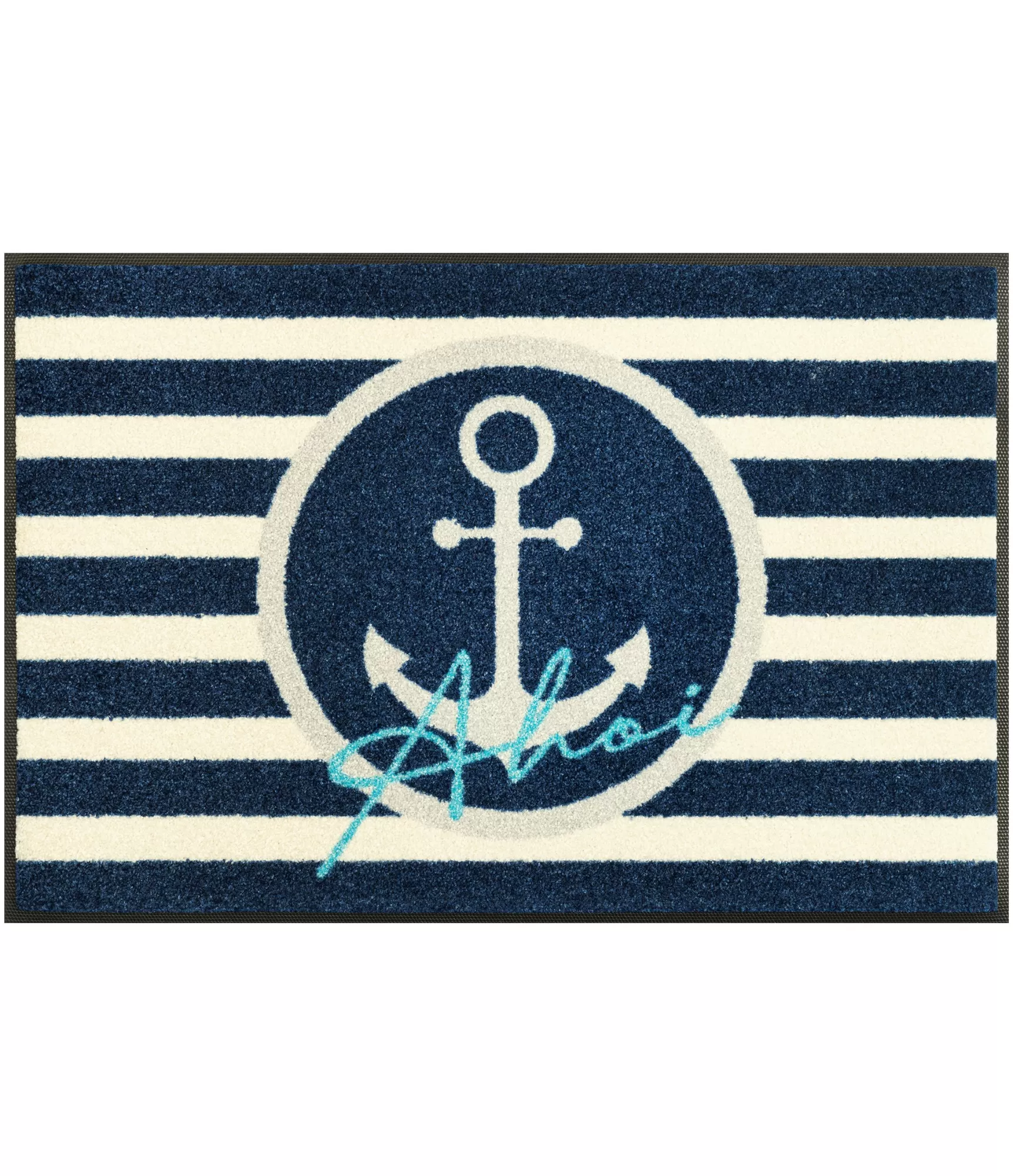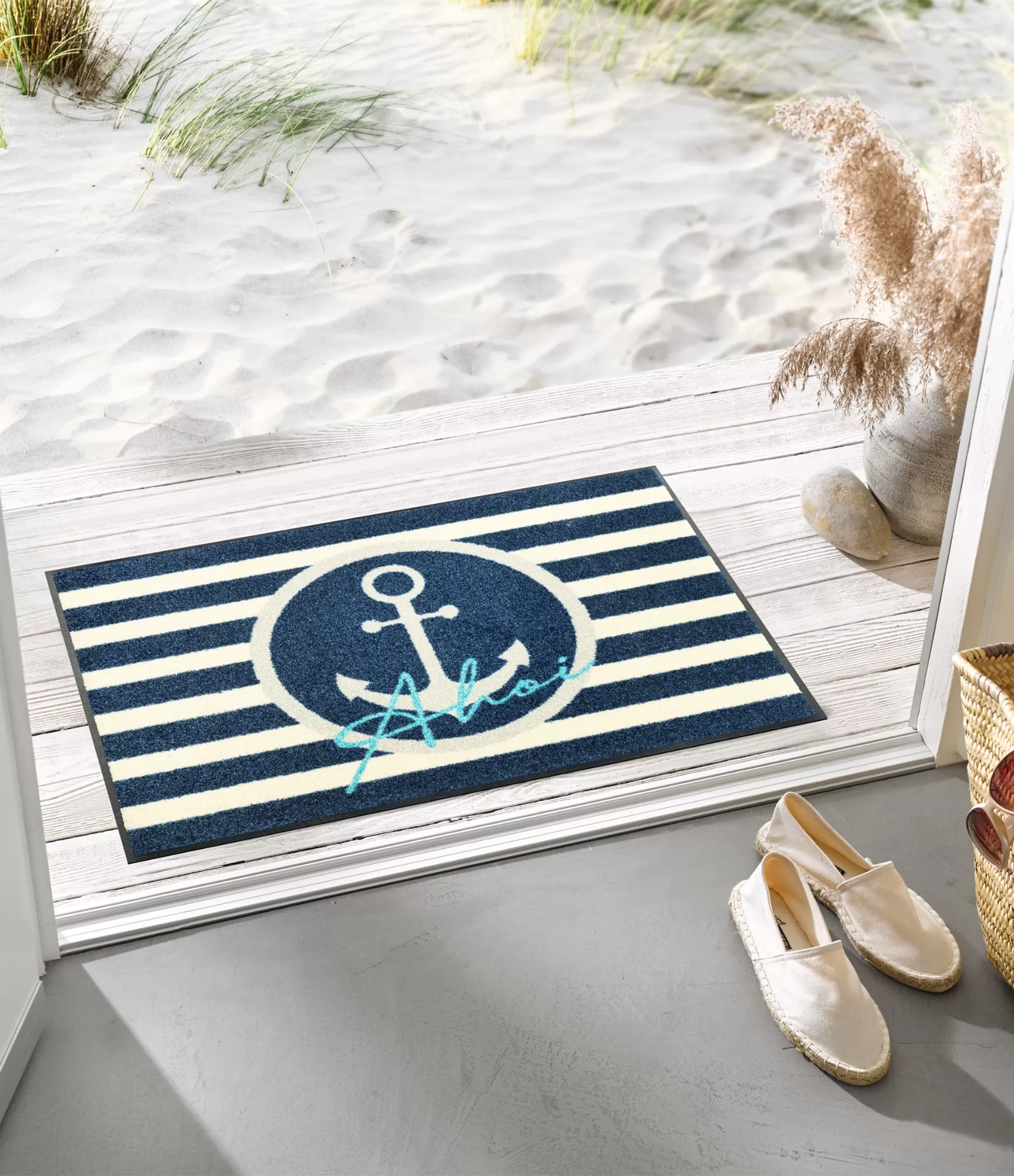 Durvju paklājs "Anchor Port" ir iedvesmots no jūras estētikas un miera, ko sniedz ūdens un ceļojumu motīvi. Tumši zilās un baltās svītras kopā ar enkura simbolu rada kārtīgu, svaigu un izteiksmīgu kopskatu. Šāds dizains lieliski piemērots gan modernām, gan klasiskām mājām, īpaši, ja vēlaties smalku, bet raksturīgu akcentu.