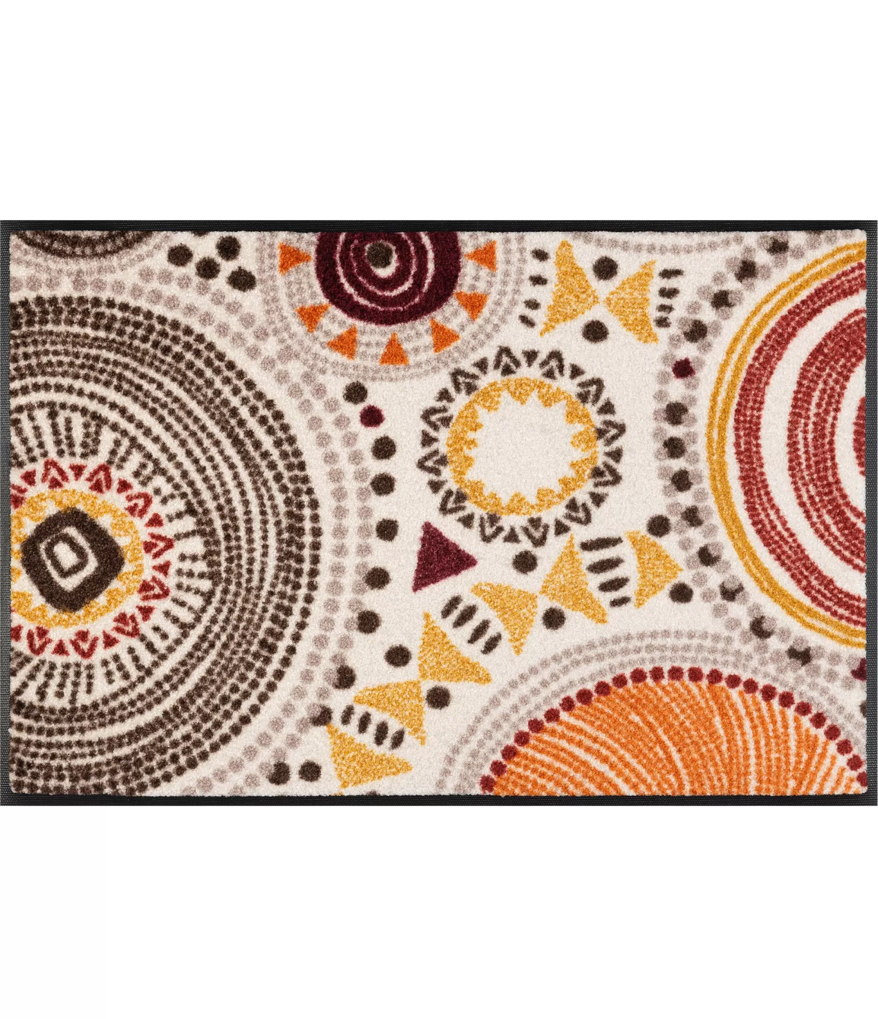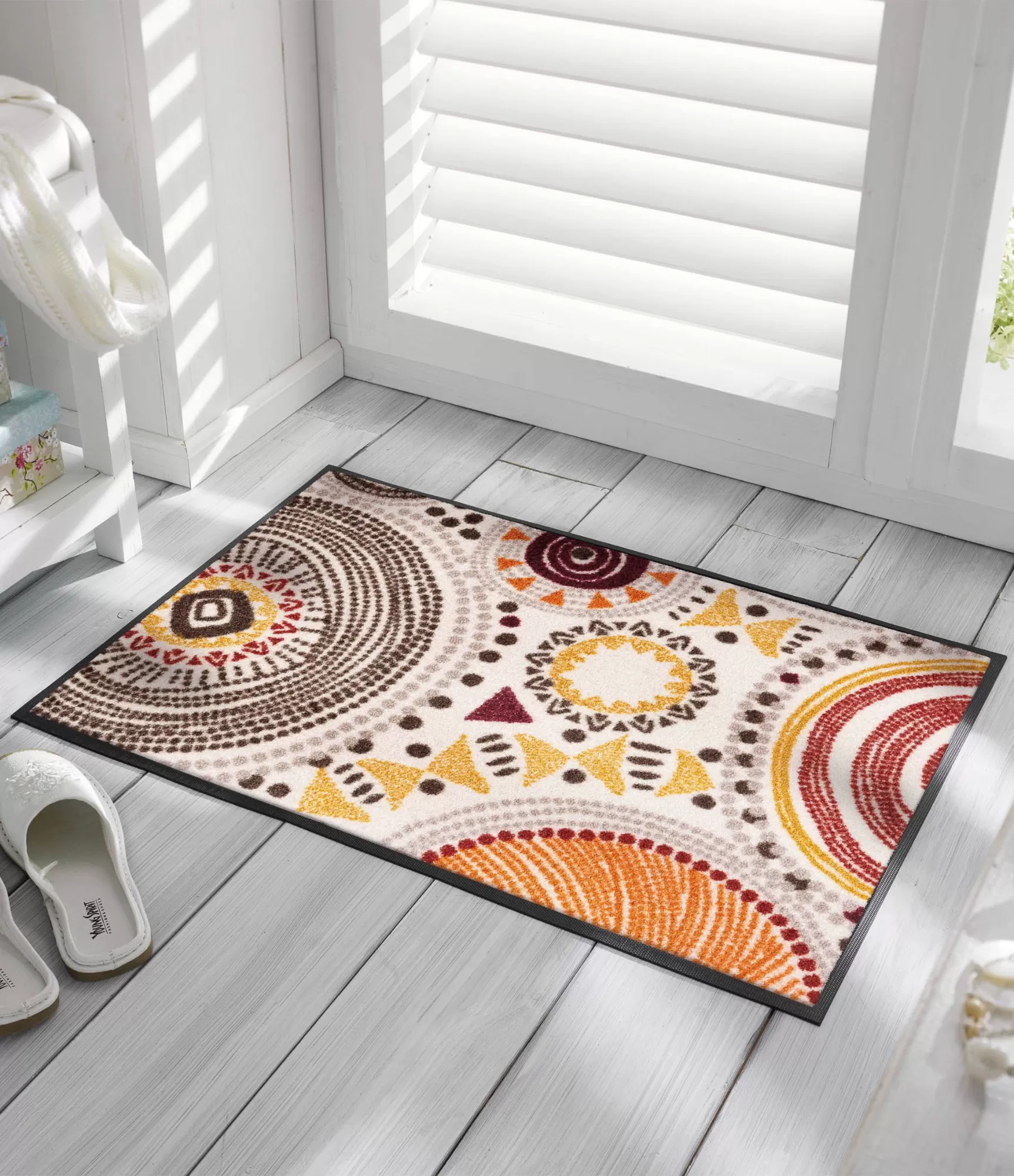 Durvju paklājs „Boho Style“ izceļas ar rotaļīgu, dekoratīvu rakstu, kas uzreiz piesaista uzmanību un piešķir telpai dzīvīgumu. Virsmā dominē apļu, punktu un ģeometrisku elementu kompozīcija, kas atgādina bohēmisko stilu un roku darba ornamentiku. Siltu toņu – brūnā, oranžā, sinepju un bordo – kombinācija rada mājīguma sajūtu, tāpēc šis modelis lieliski piemērots mājām, kur tiek novērtēts izteikts raksturs un individualitāte.
