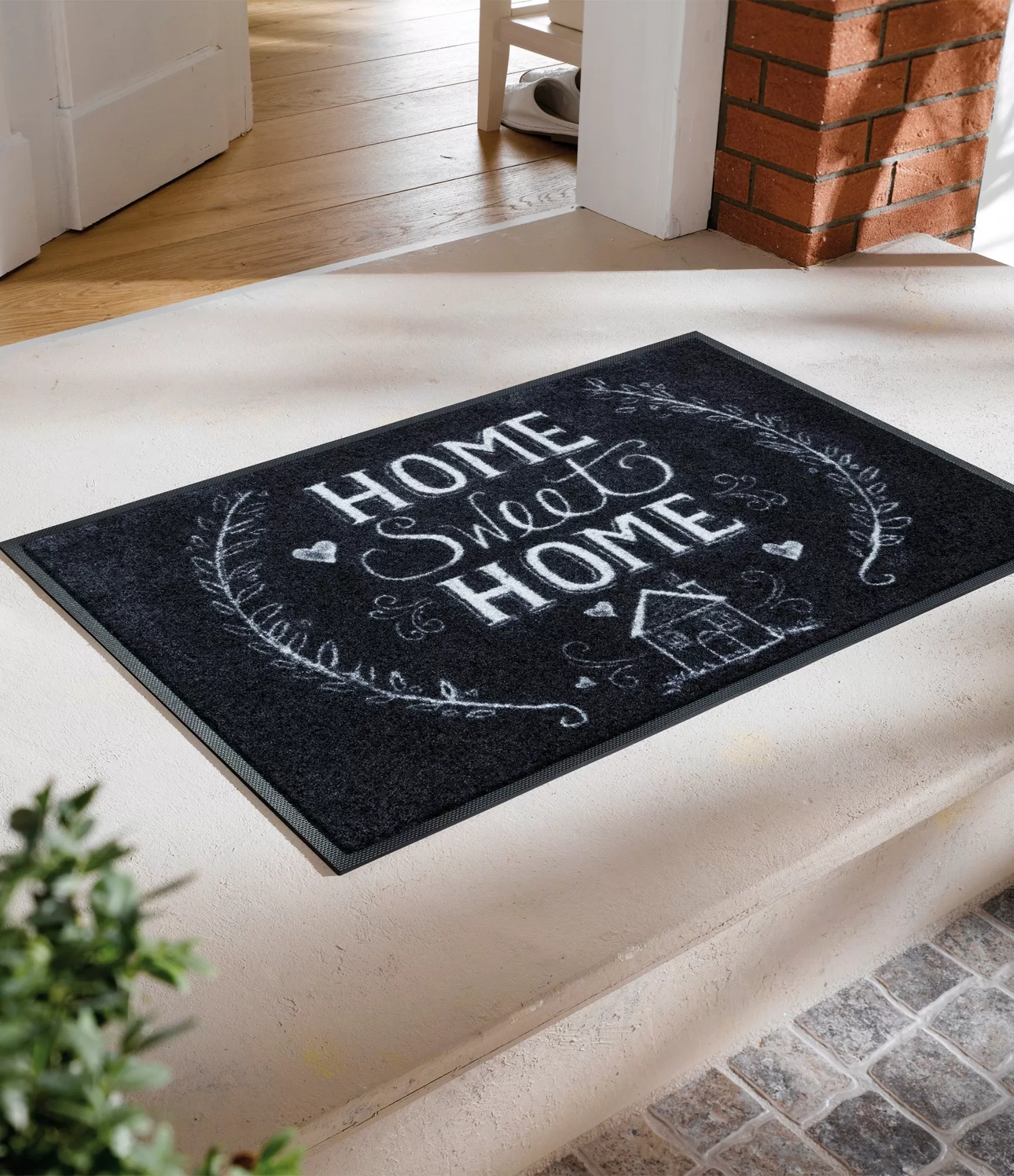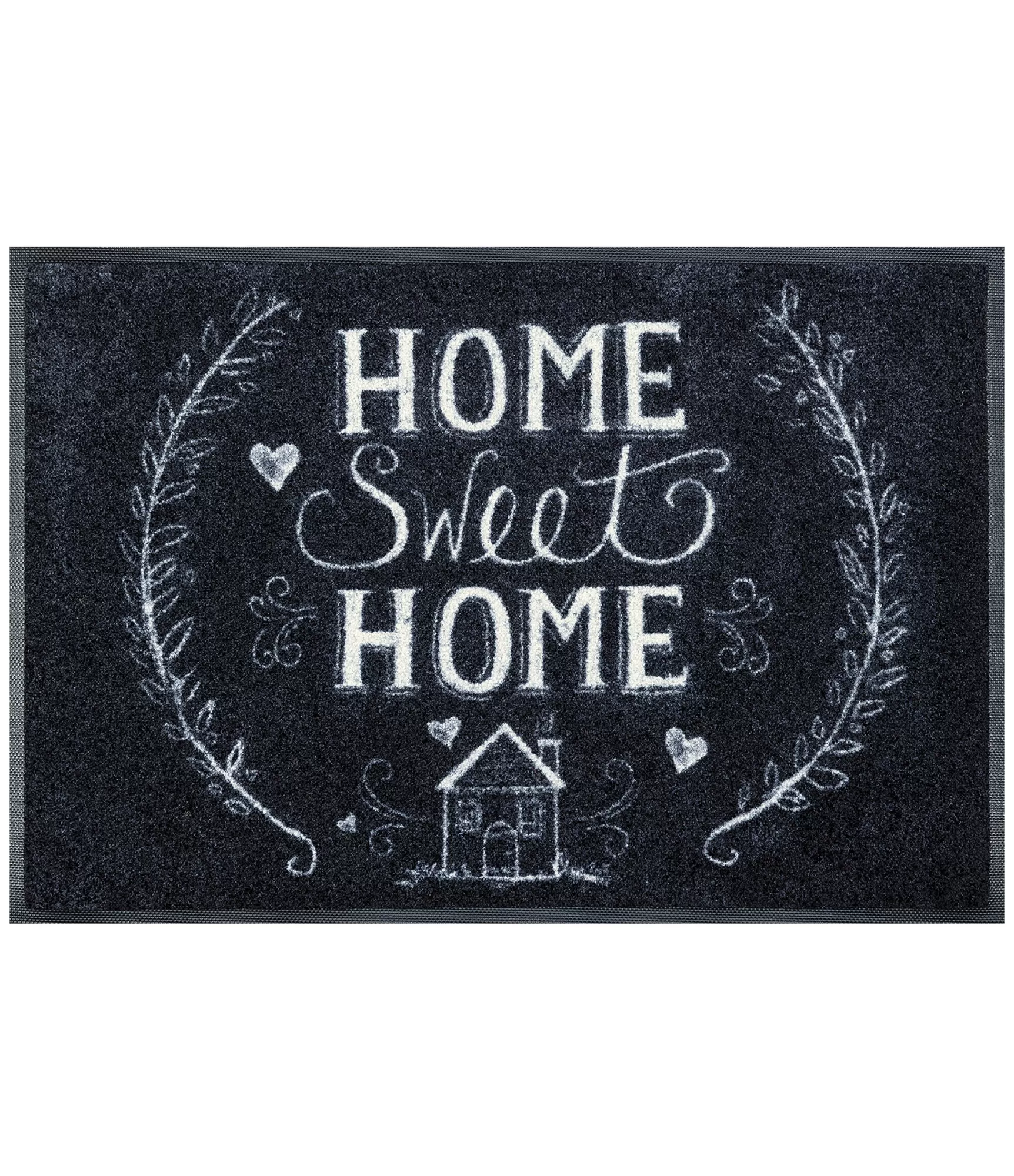 Durvju paklājs „Chalky home“ jau pirms ieiešanas mājās rada siltu, aicinošu atmosfēru. Krītam līdzīgais zīmējuma stils, dekoratīvie zariņi, sirsniņas un uzraksts „Home Sweet Home“ nodod vienkāršu, bet ļoti spēcīgu vēstījumu – šī ir vieta, kur vienmēr ir patīkami atgriezties.