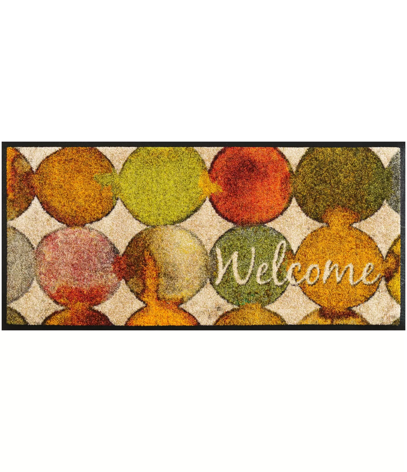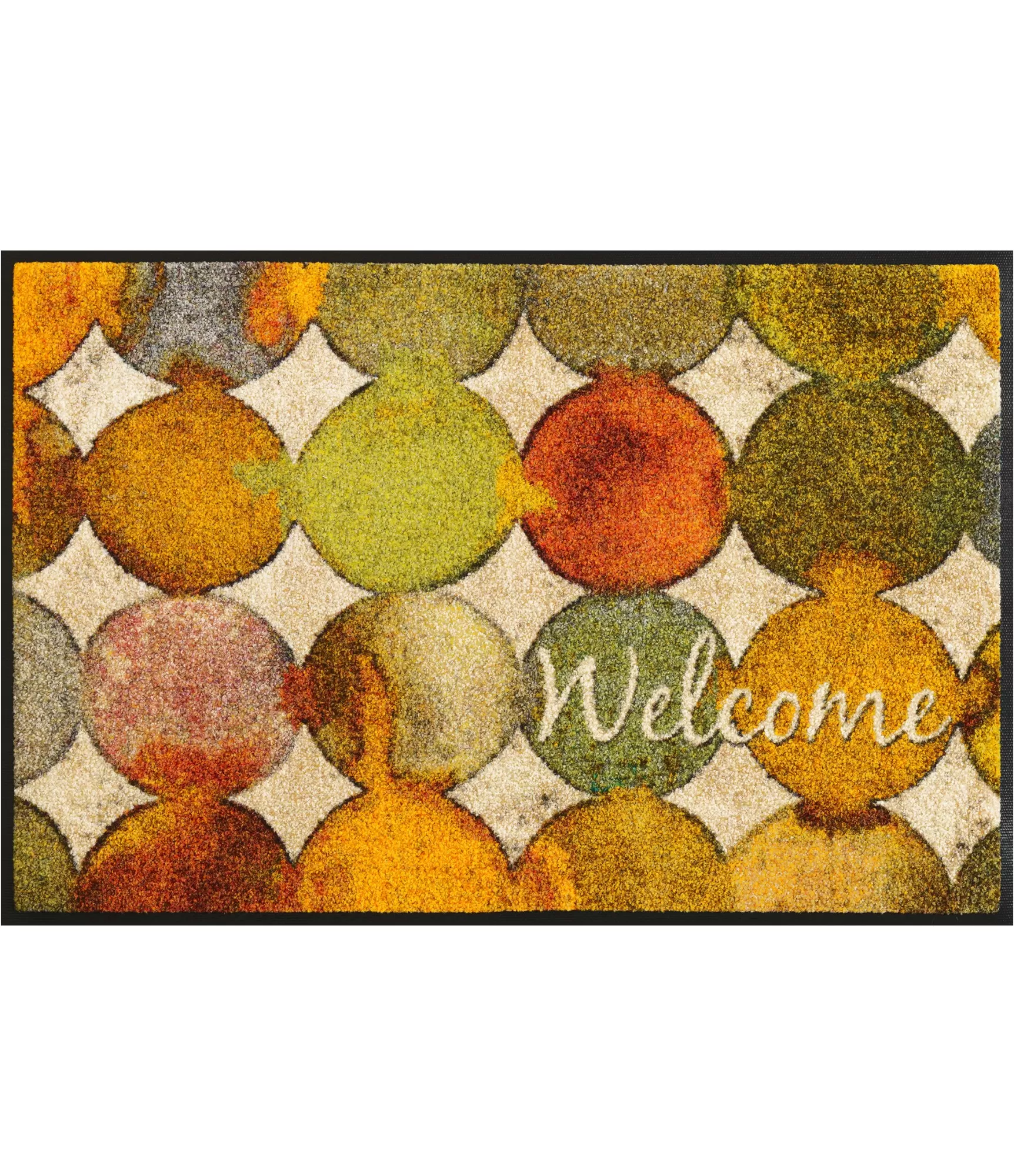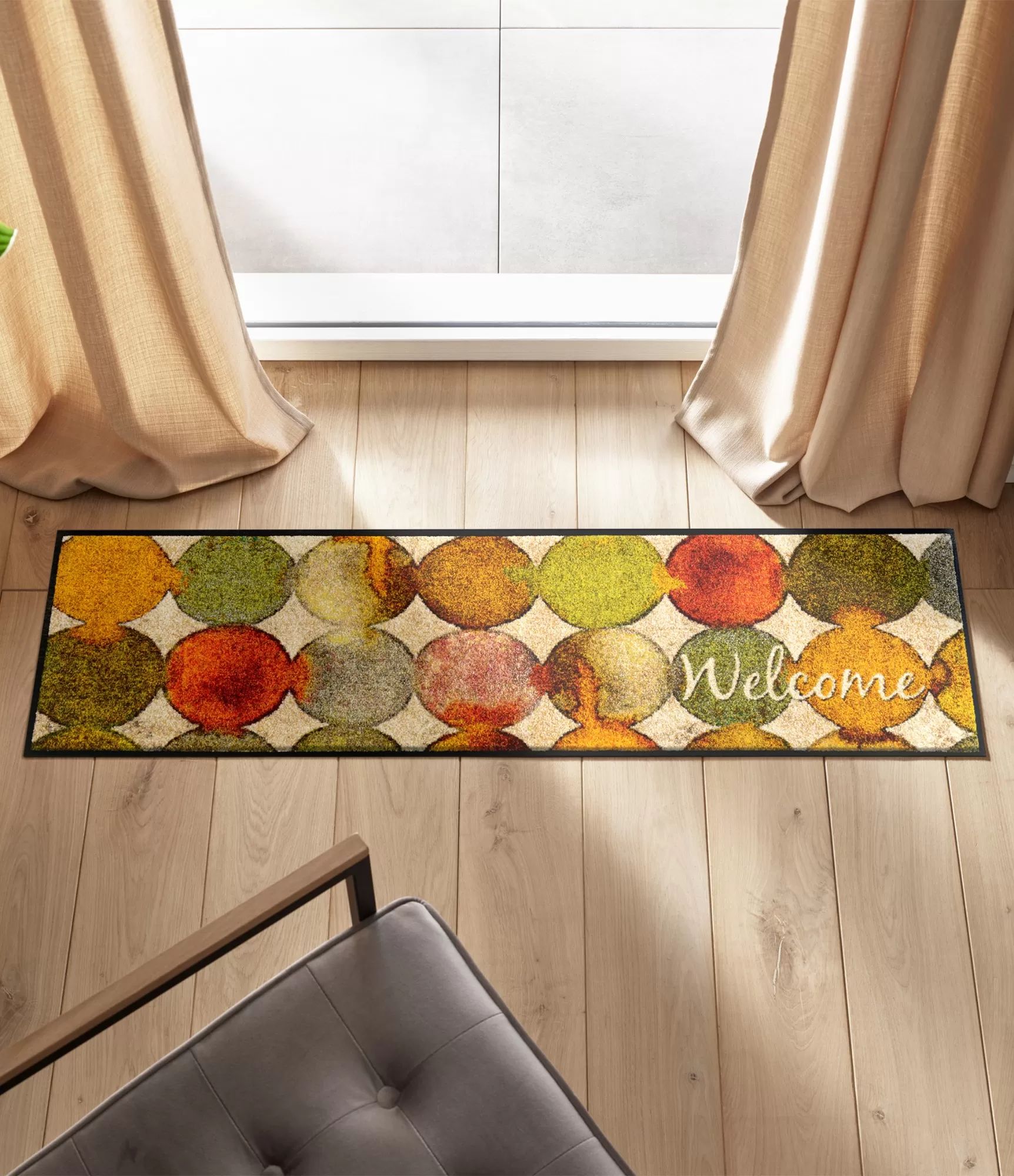 Durvju paklājs „Charming Path“ uzreiz rada siltu un aicinošu noskaņu. Krāsainie, apaļie raksti ar rudens toņiem – dzeltenu, oranžu, zaļganu un brūnganu – piešķir dzīvīgumu un kļūst par izteiksmīgu akcentu pie ieejas. Papildu „Welcome“ uzraksts vēl vairāk pastiprina viesmīlības sajūtu, tāpēc šis durvju paklājs ir ne tikai praktisks, bet arī dekoratīvs.