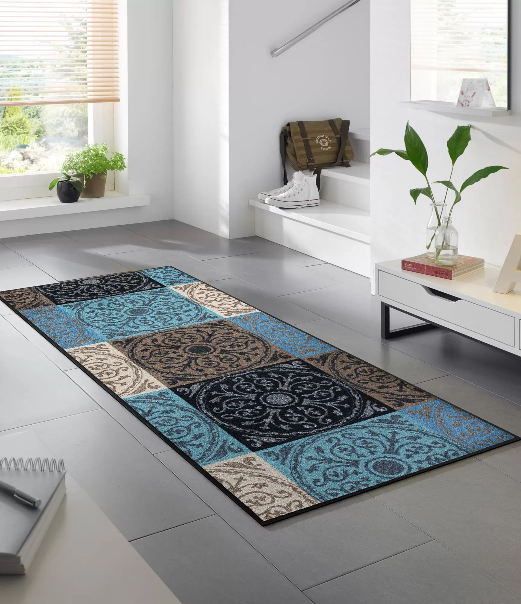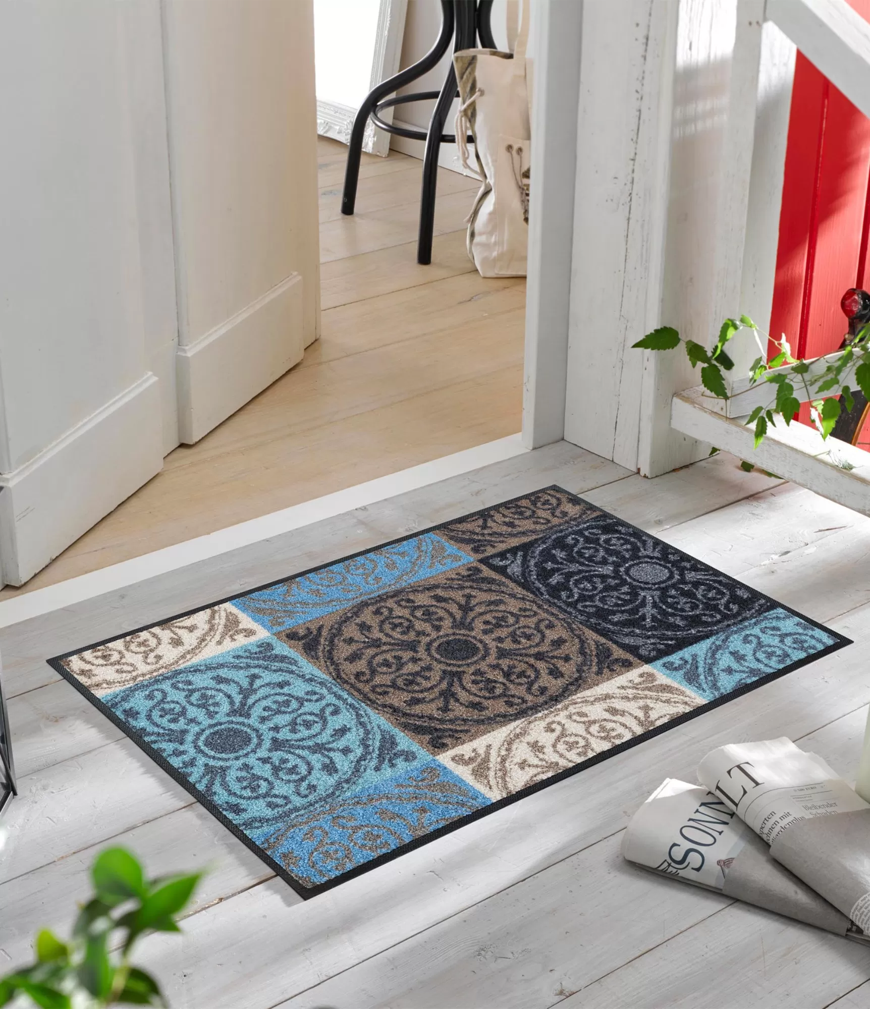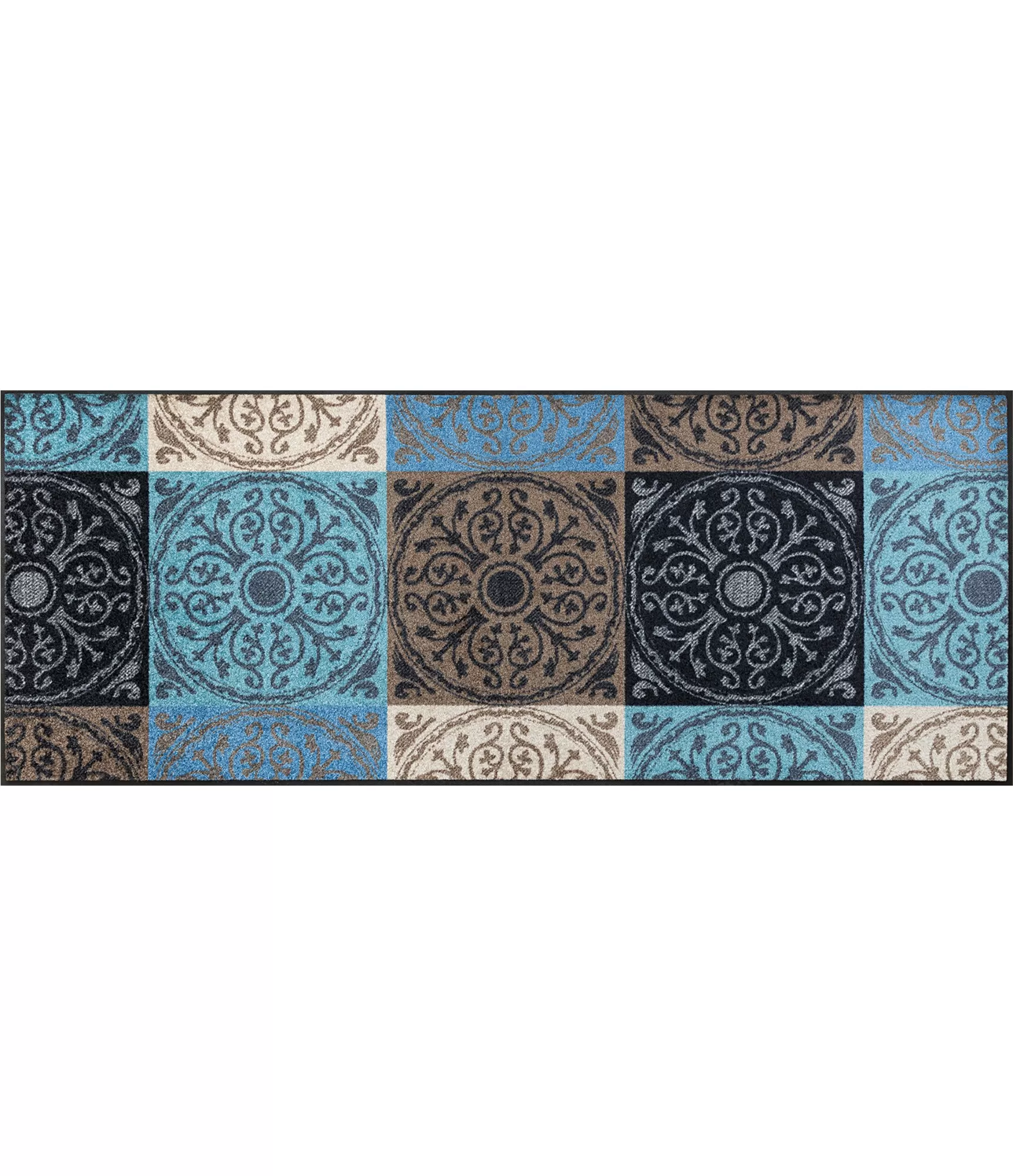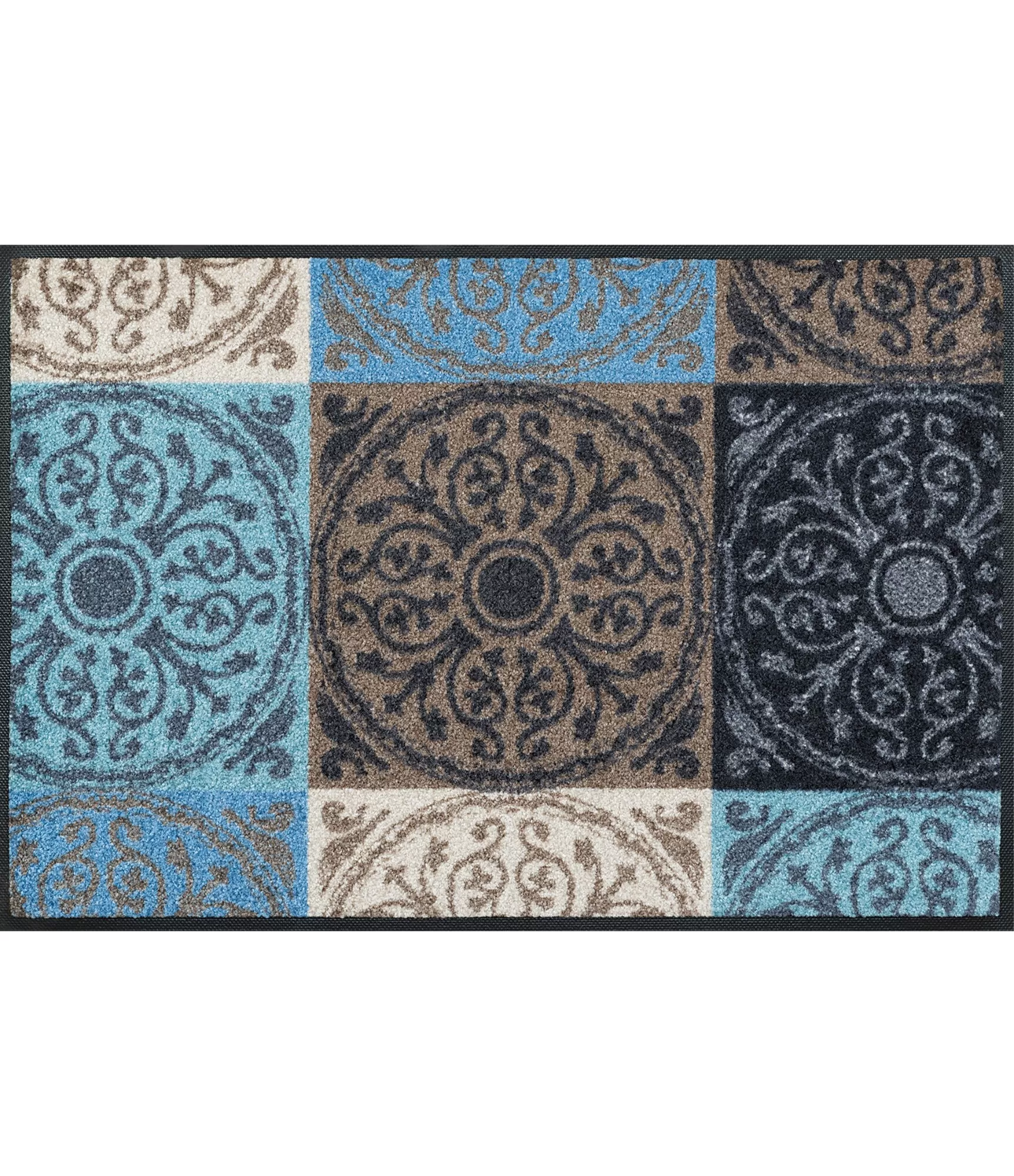 Durvju paklājs "Da Capo" izceļas ar elegantu, ornamentālu dizainu, kas atgādina smalkas dekoratīvās flīzes un piešķir telpai raksturu. Šis risinājums apvieno dažādus krāsu segmentus – maigus smilškrāsas, piesātinātākus brūnus, pelēkus un zilganus toņus, kas kopā veido sabalansētu un acīm patīkamu kopskatu. Šāds raksts ne tikai izskatās estētiski, bet arī ļauj viegli pieskaņot izstrādājumu dažādiem interjera stiliem.