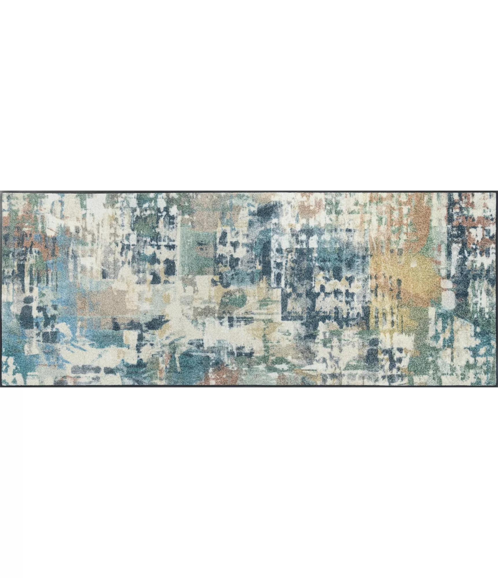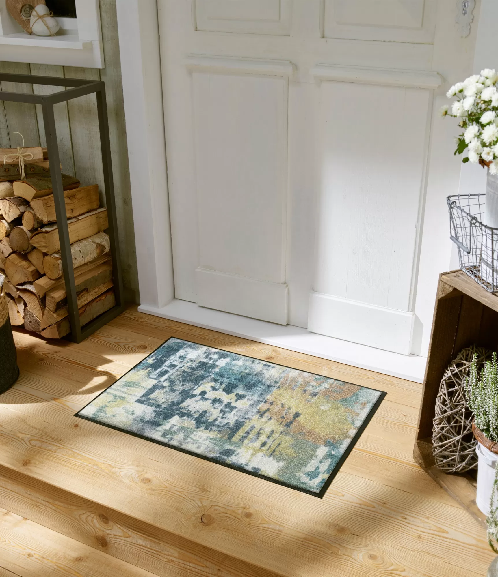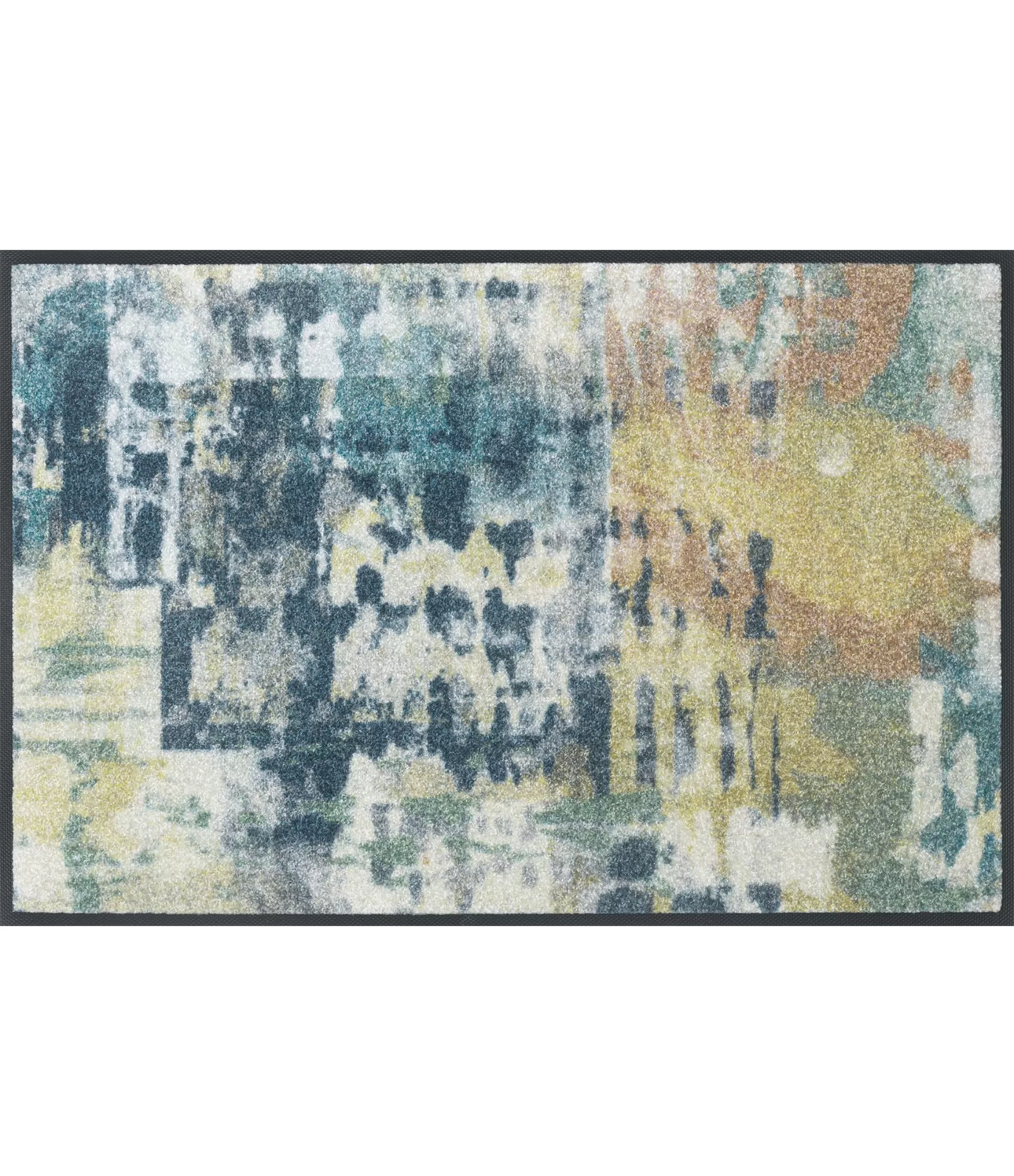 Mazgājams durvju paklājs „Euphony“ izceļas ar abstraktu, it kā viegli izplūdušu rakstu, kurā saplūst pelēcīgi, zaļgani un silti dzeltenīgi toņi. Šis dizains rada kustības un dzīvīguma iespaidu, tāpēc lieliski piemērots moderniem interjeriem, kuros vēlas smalku akcentu bez pārāk spilgta kontrasta. Raksts ir ne tikai dekoratīvs – tas ir arī praktisks, jo palīdz mazāk pamanīt ikdienas netīrumus.