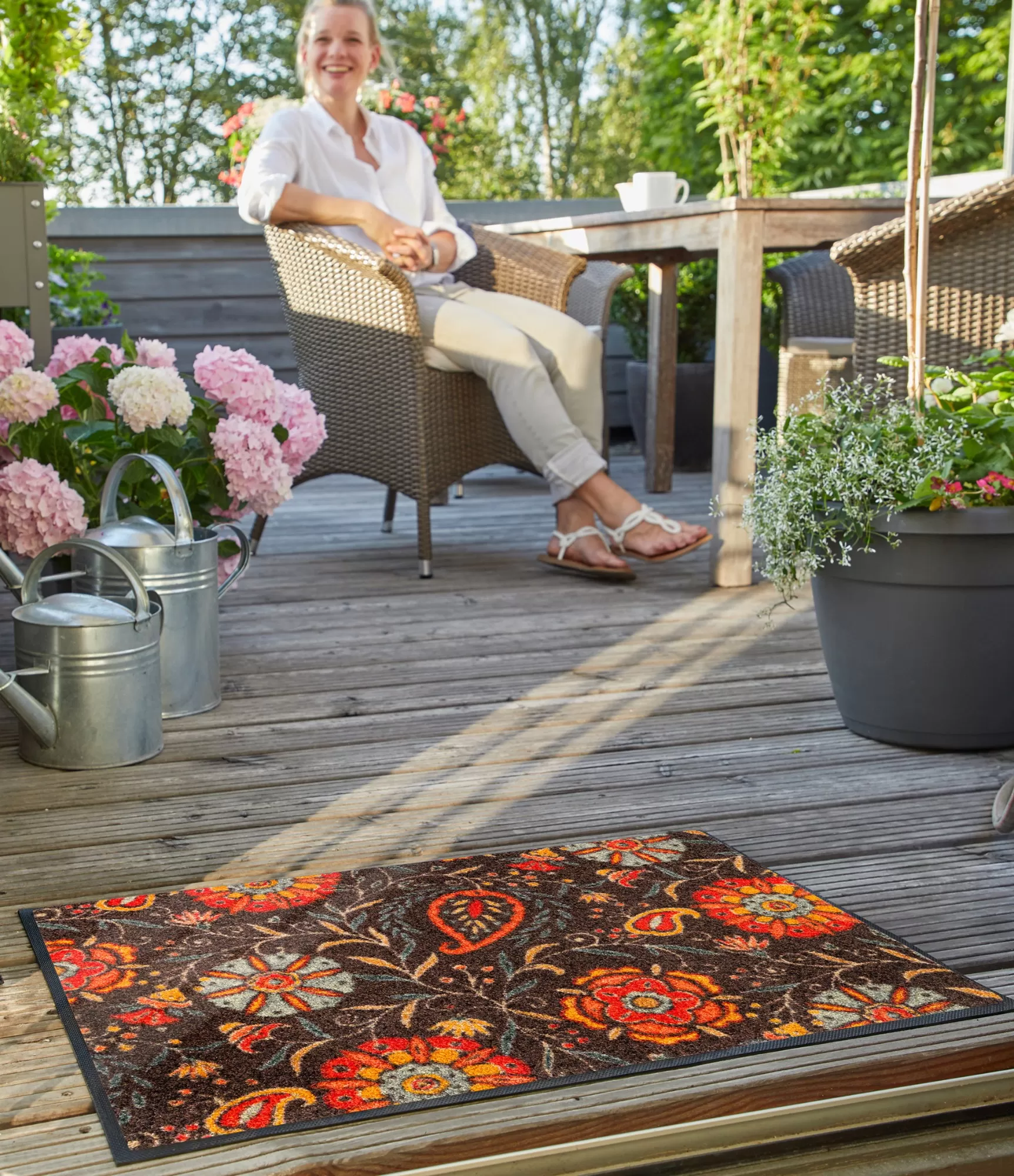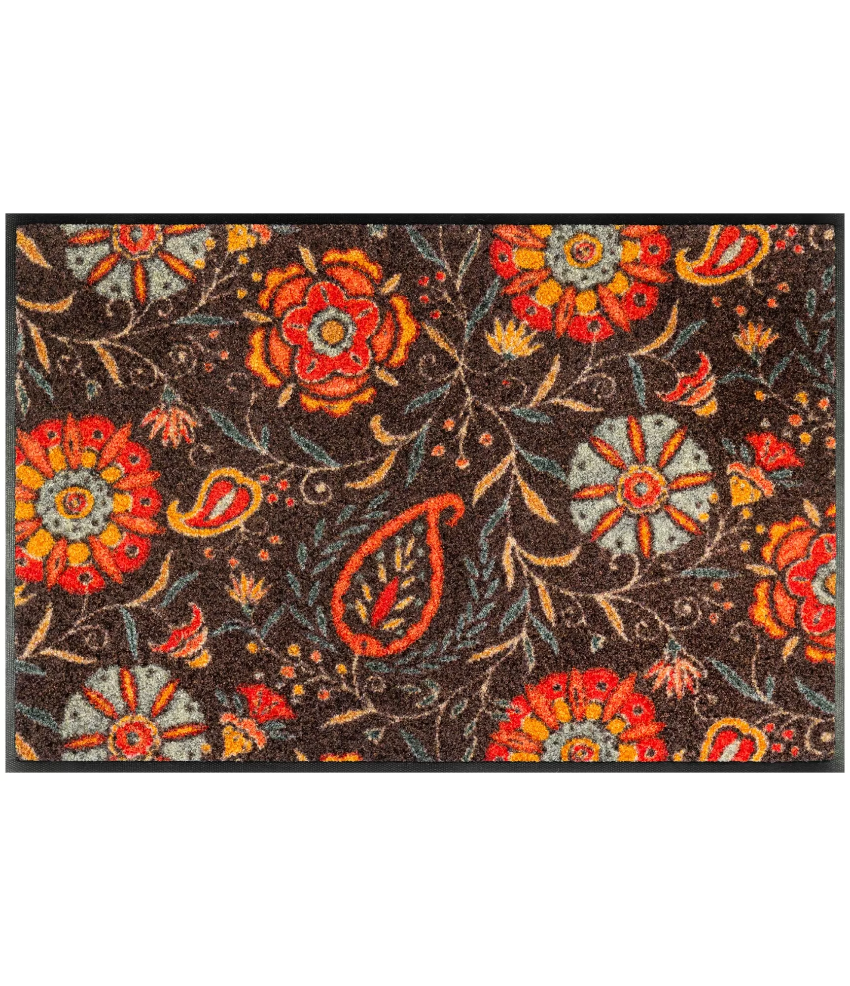 Mazgājamais durvju paklājs „Everlasting“ izceļas ar piesātinātu, dekoratīvu rakstu, kurā apvienoti ziedu motīvi un smalki ornamenti. Tumšais fons izceļ siltu krāsu detaļas – oranžos, sarkanos un brūnganos toņus, kas piešķir dzīvīgumu un veido mājīgu, līdzsvarotu kopskatu. Raksts ir skaidrs, viegli pamanāms, bet nepārslogots, tāpēc tiek saglabāts līdzsvars starp izteiksmīgumu un praktiskumu.