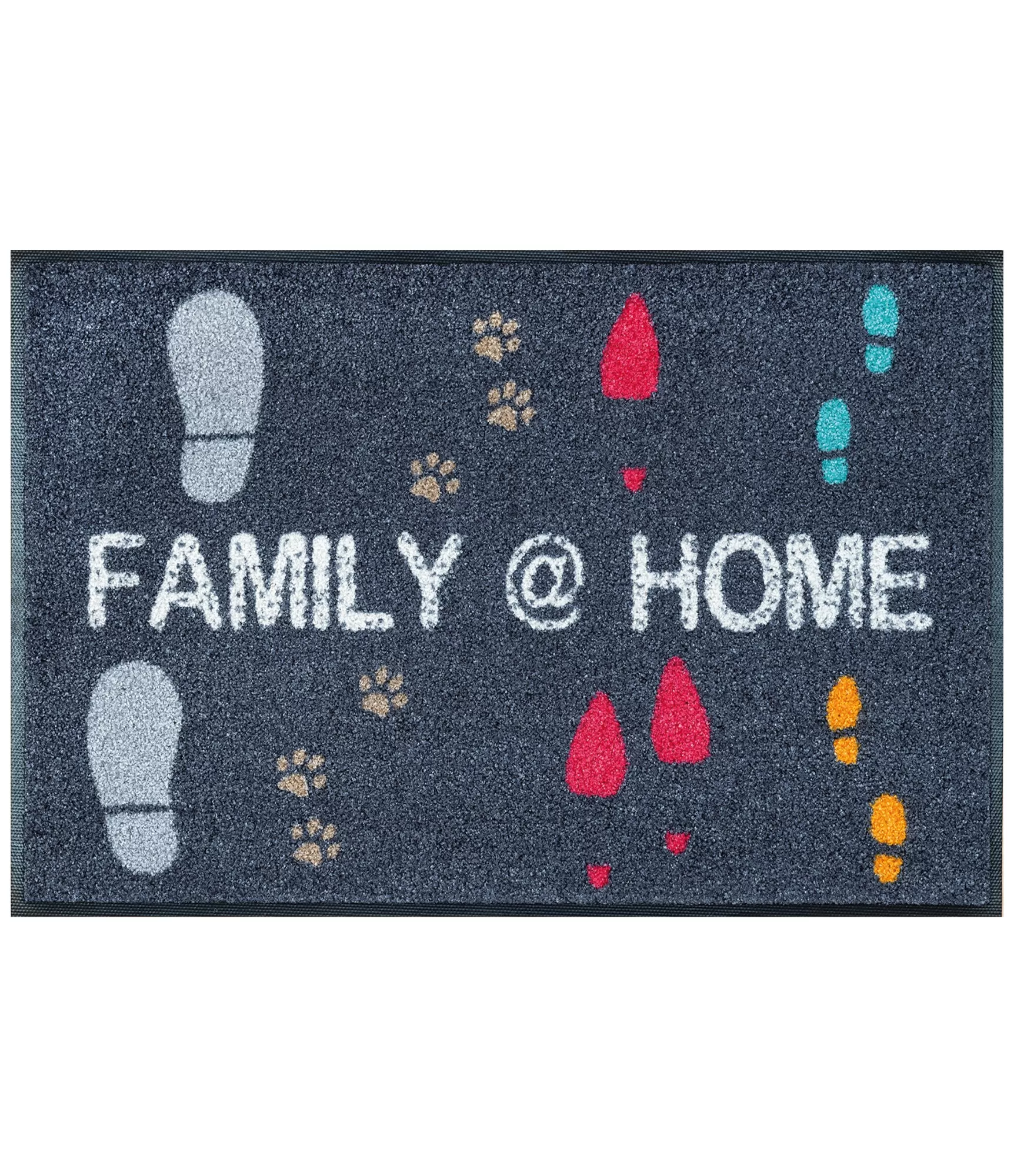 Durvju paklājs „Family@Home“ radīts mājīgām mājām, kurās dzīvo visa ģimene – gan cilvēki, gan mājdzīvnieki. Uz tumša fona attēlotas dažādu krāsu pēdas – no apaviem līdz ķepiņām – kopā ar uzrakstu „Family@Home“ rada siltu, dzīvīgu un viesmīlīgu iespaidu. Tā ir lieliska izvēle tiem, kuri vēlas, lai pie ieejas būtu ne tikai kārtība, bet arī noskaņu veidojošs akcents.