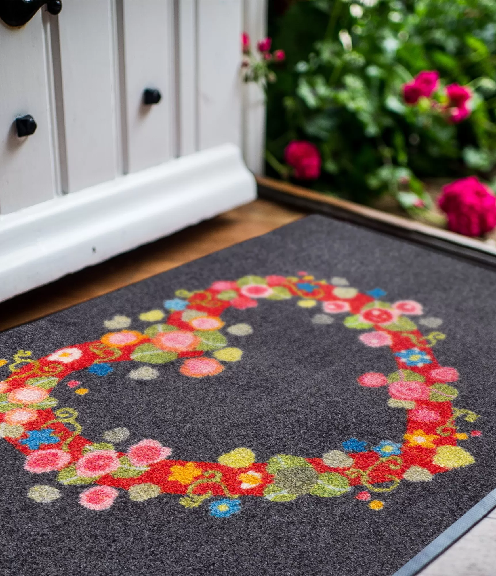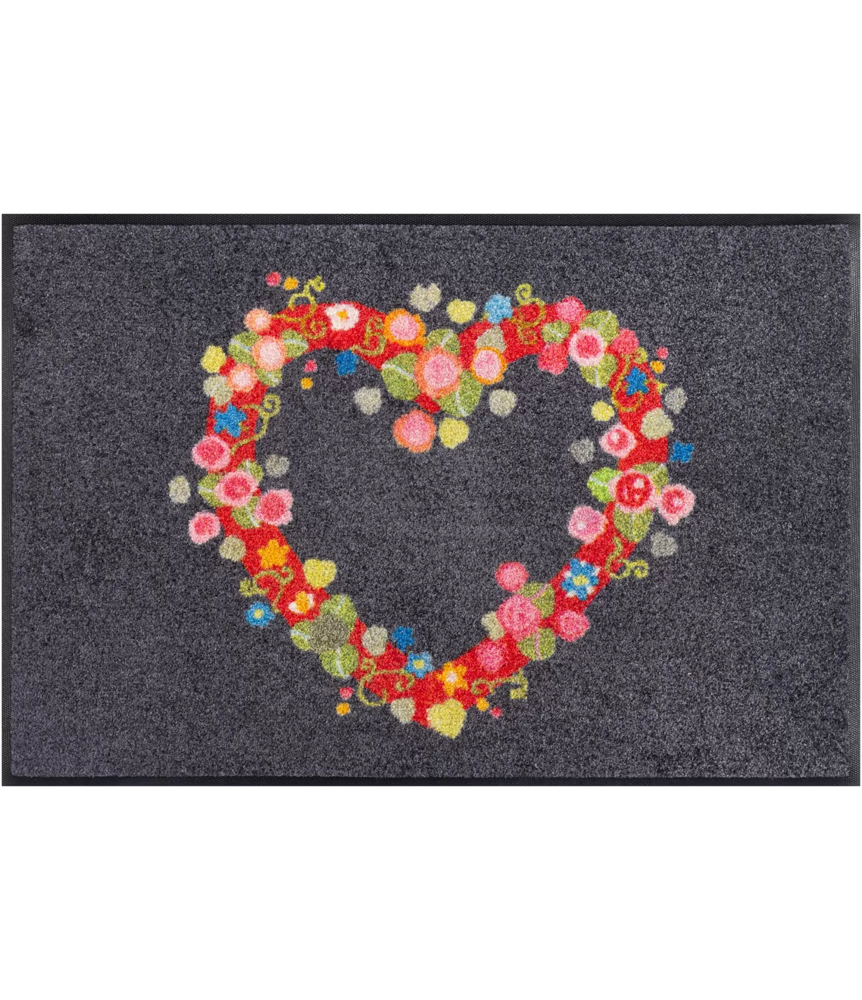 "Floral Romance" durvju paklājs uzreiz piesaista uzmanību ar savu rotaļīgo un silto dizainu, kurā dominē no krāsainiem ziediem veidota sirds. Šis risinājums smalki izceļas uz tumšāka fona, tāpēc lieliski sader gan modernos, gan mājīgākos, klasiskos interjeros. Spilgtās sarkanās, rozā, zaļās un dzeltenās krāsas piešķir dzīvīgumu, taču saglabājas estētiski sabalansētas un nepārslogo kopējo skatu.