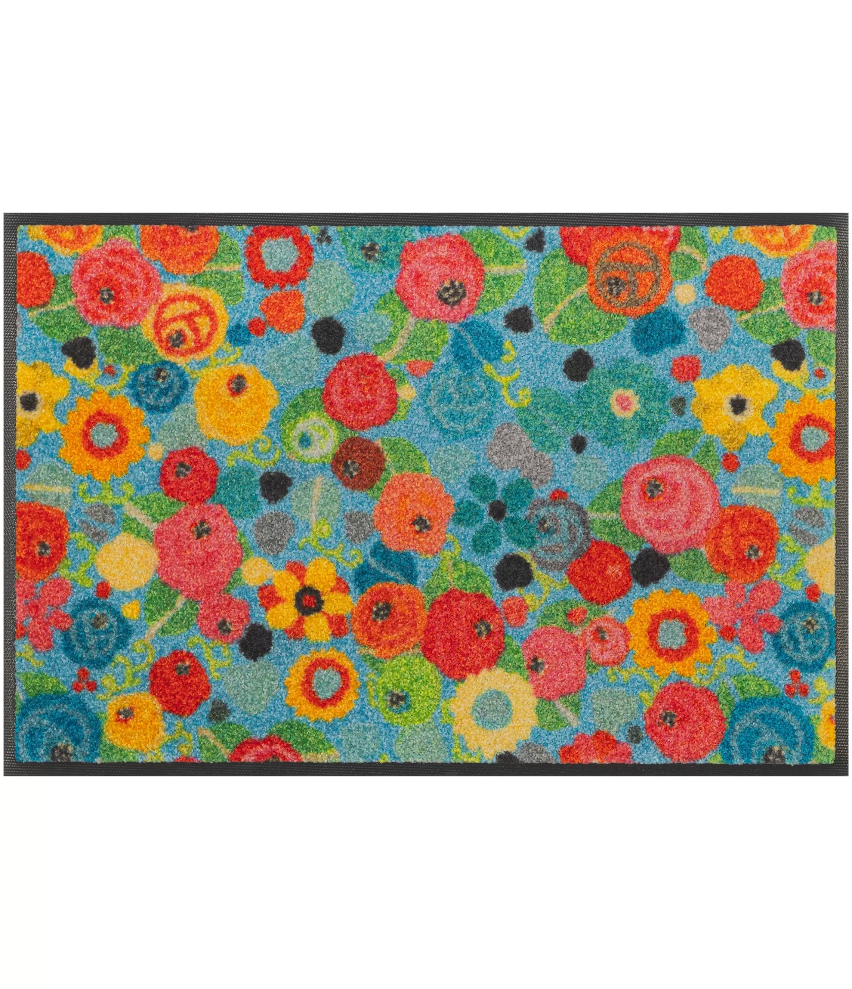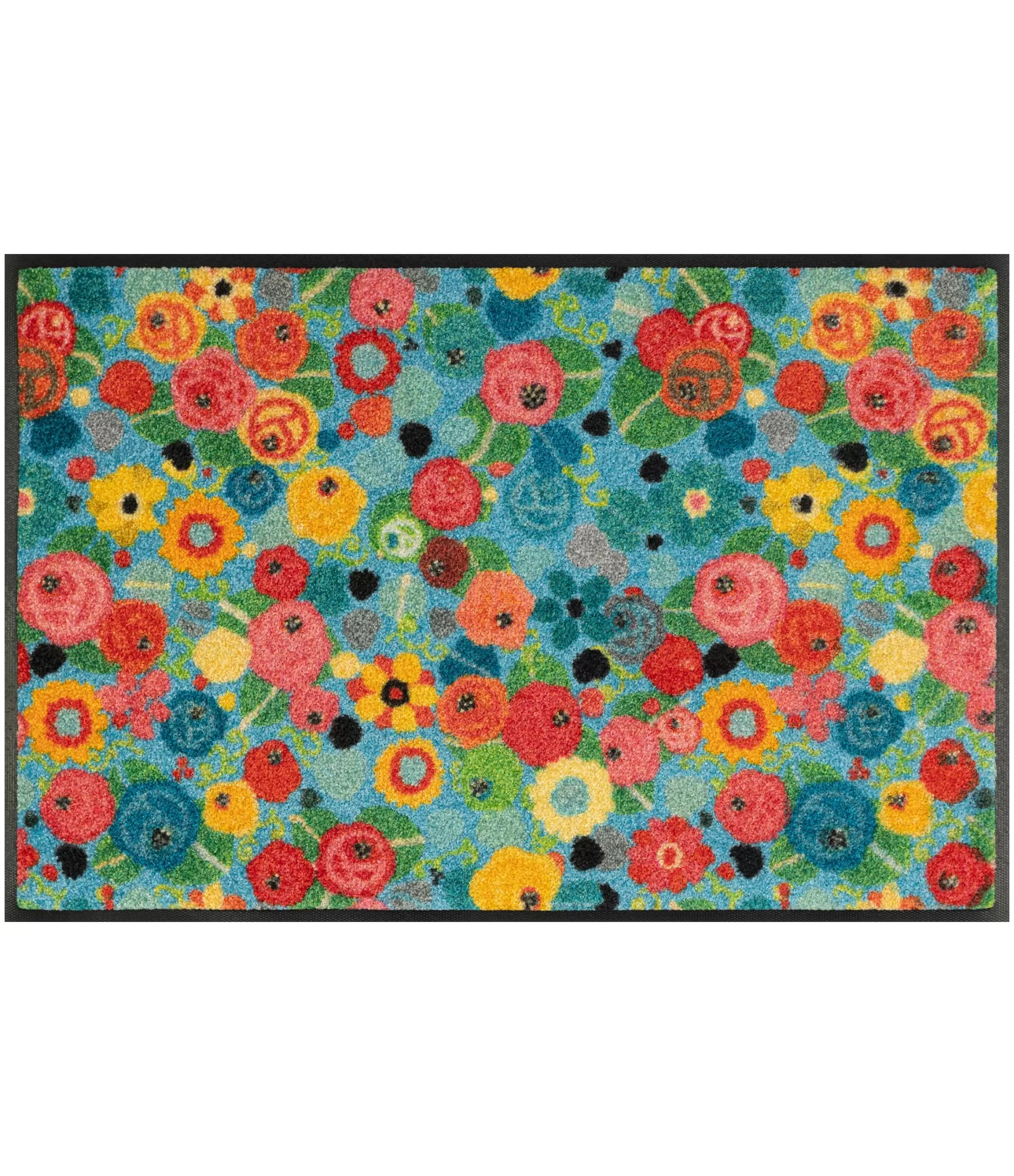 Stilīgs durvju paklājs "Flower Power" izceļas ar īpaši krāsainu un enerģisku dizainu, kurā ir daudz dažādu formu un krāsu ziedu motīvu. Šis risinājums raksturojas ar spilgtu raksturu – šeit sader zilie, sarkanie, dzeltenie un zaļie toņi, kas rada dzīvīgu un noskaņām bagātu kopskatu. Šāds dizains ne tikai atdzīvina telpu, bet arī piešķir tai izteiksmīgumu, tāpēc kļūst par īstu akcentu pie ieejas.