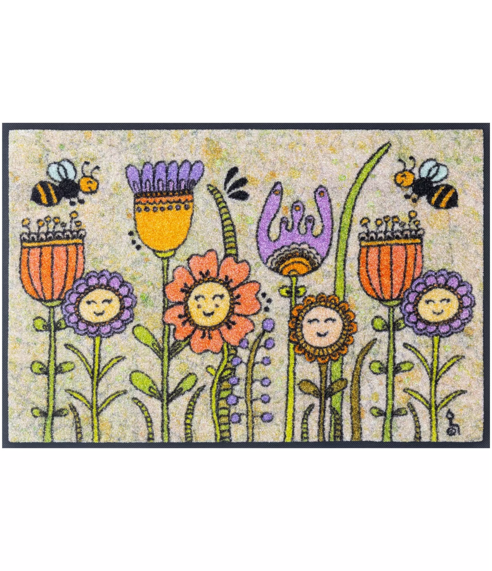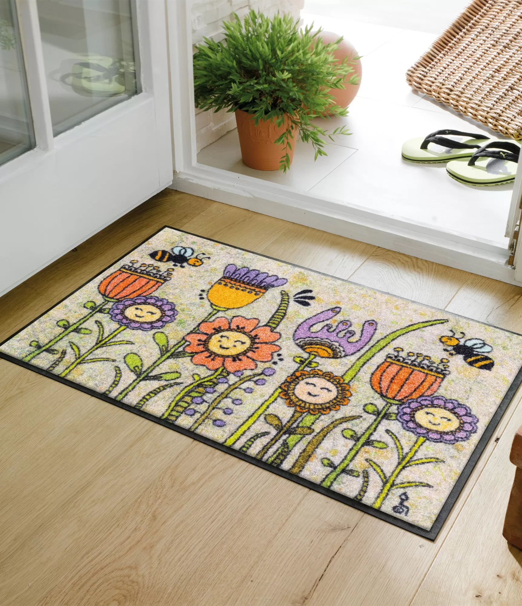 Mazgājamais durvju paklājs Friendly Flowers izceļas ar savu priecīgo un siltu dizainu, kas uzreiz rada mājīgu noskaņu, tiklīdz ienākat mājās. Krāsainie ziedi ar smalkām sejiņu detaļām un lidojošās bitītes piešķir paklājam dzīvīgumu un viegluma sajūtu. Maigs fons ar spilgtākiem akcentiem ļauj šim paklājam viegli iekļauties dažādos interjeros – gan gaišos, gan krāsainākos.