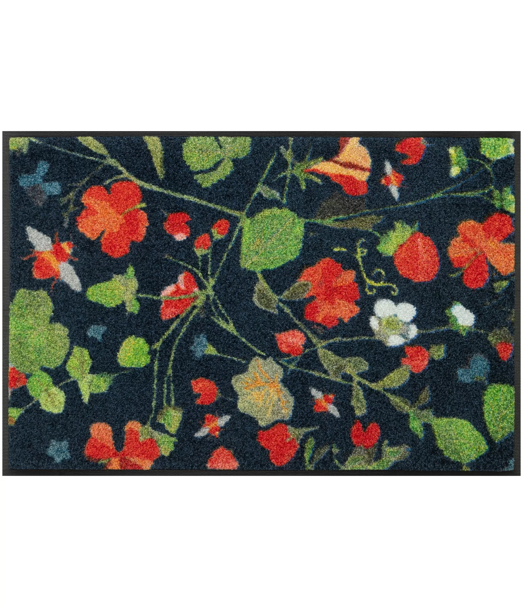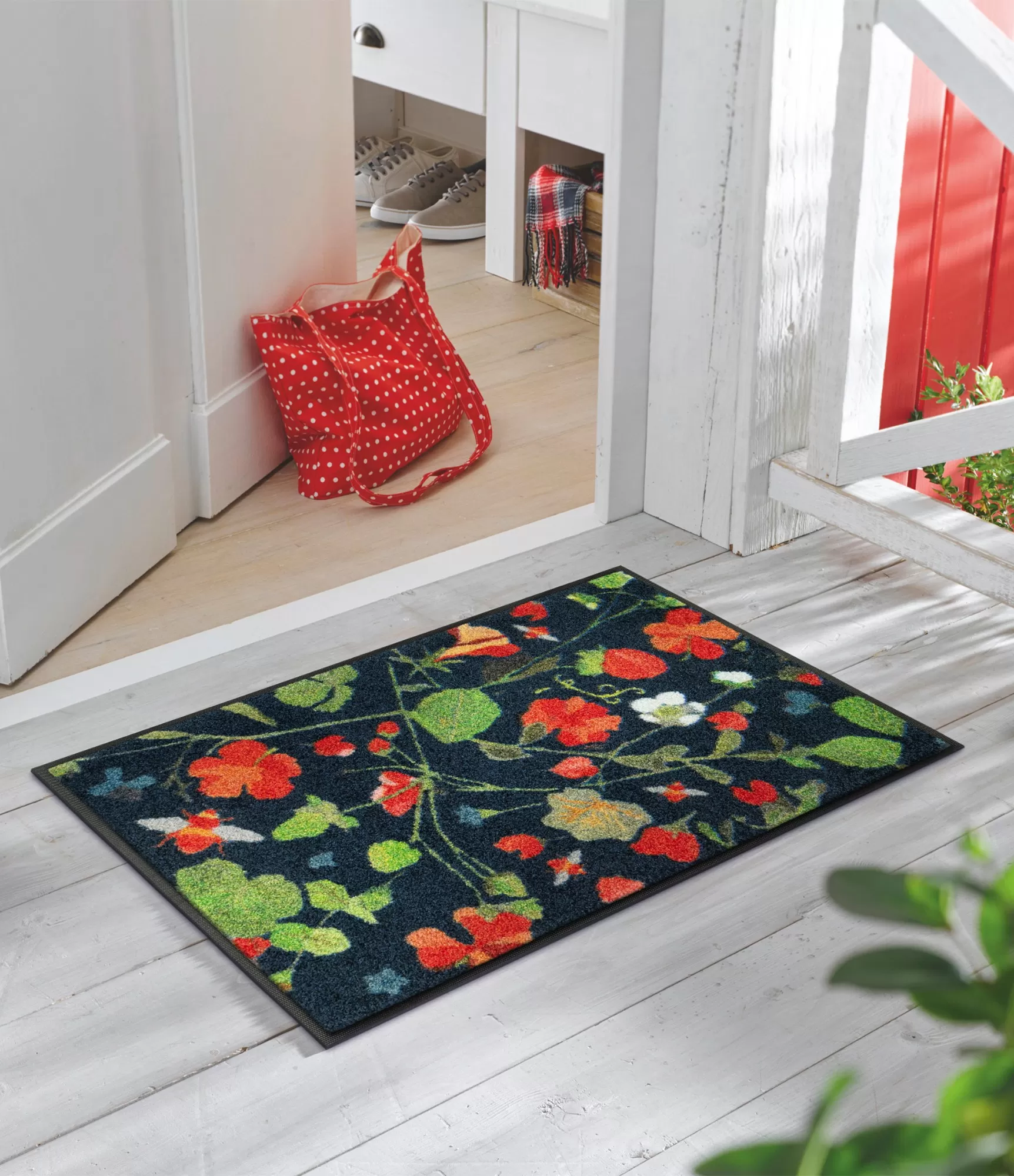 "Garden Bee" durvju paklājs uzreiz rada dzīvīgu pirmo iespaidu sava krāsainā, ar augiem un sīkiem dabas elementiem dekorētā dizaina dēļ. Uz tumšā fona izceļas piesātinātas sarkanās, zaļās un gaišās krāsas, kas piešķir šim risinājumam izteiksmīgumu, taču saglabā estētisko līdzsvaru. Šis dizains atgādina vasarīgu dārzu, tāpēc ieejas telpa kļūst siltāka un mājīgāka.