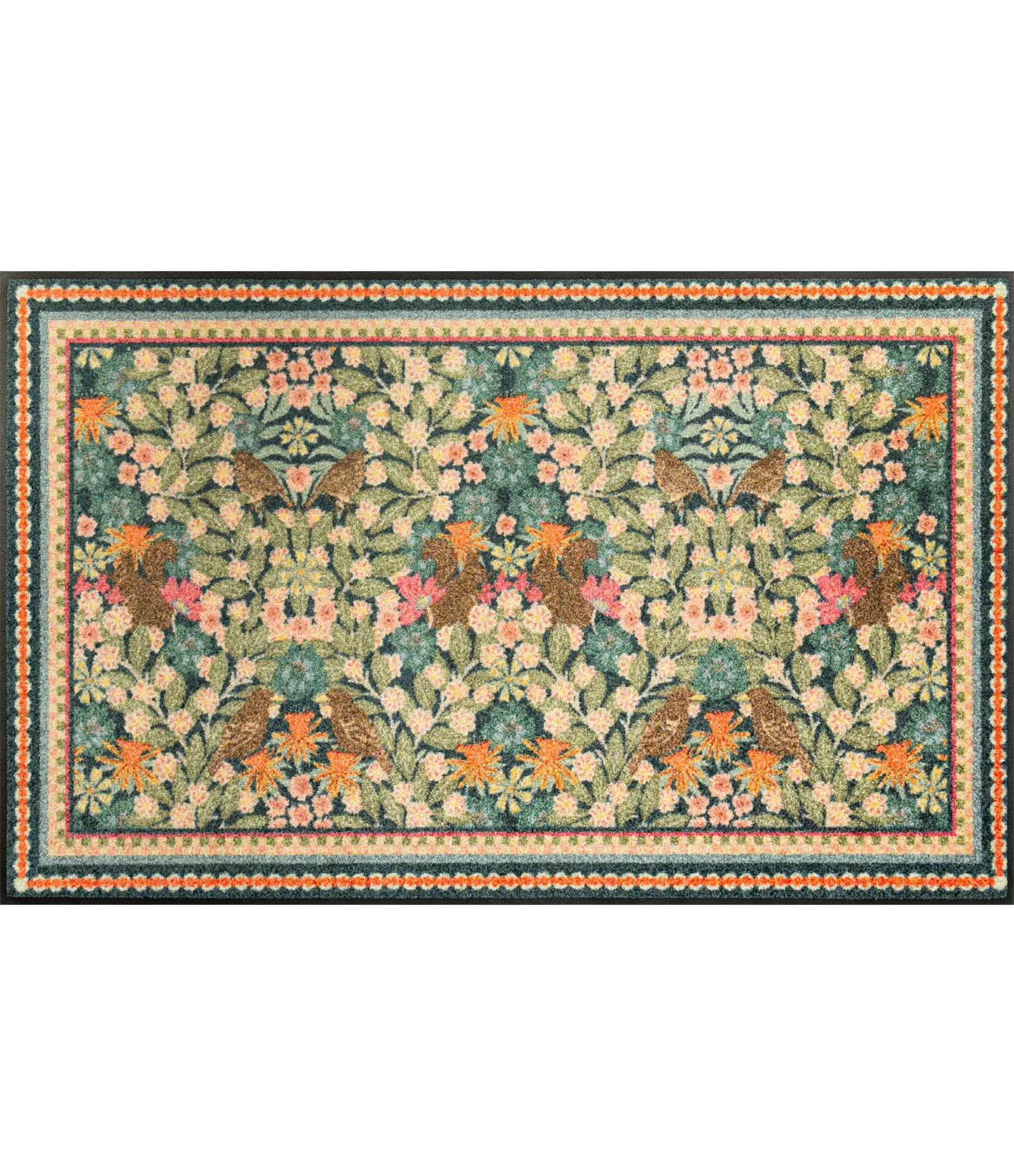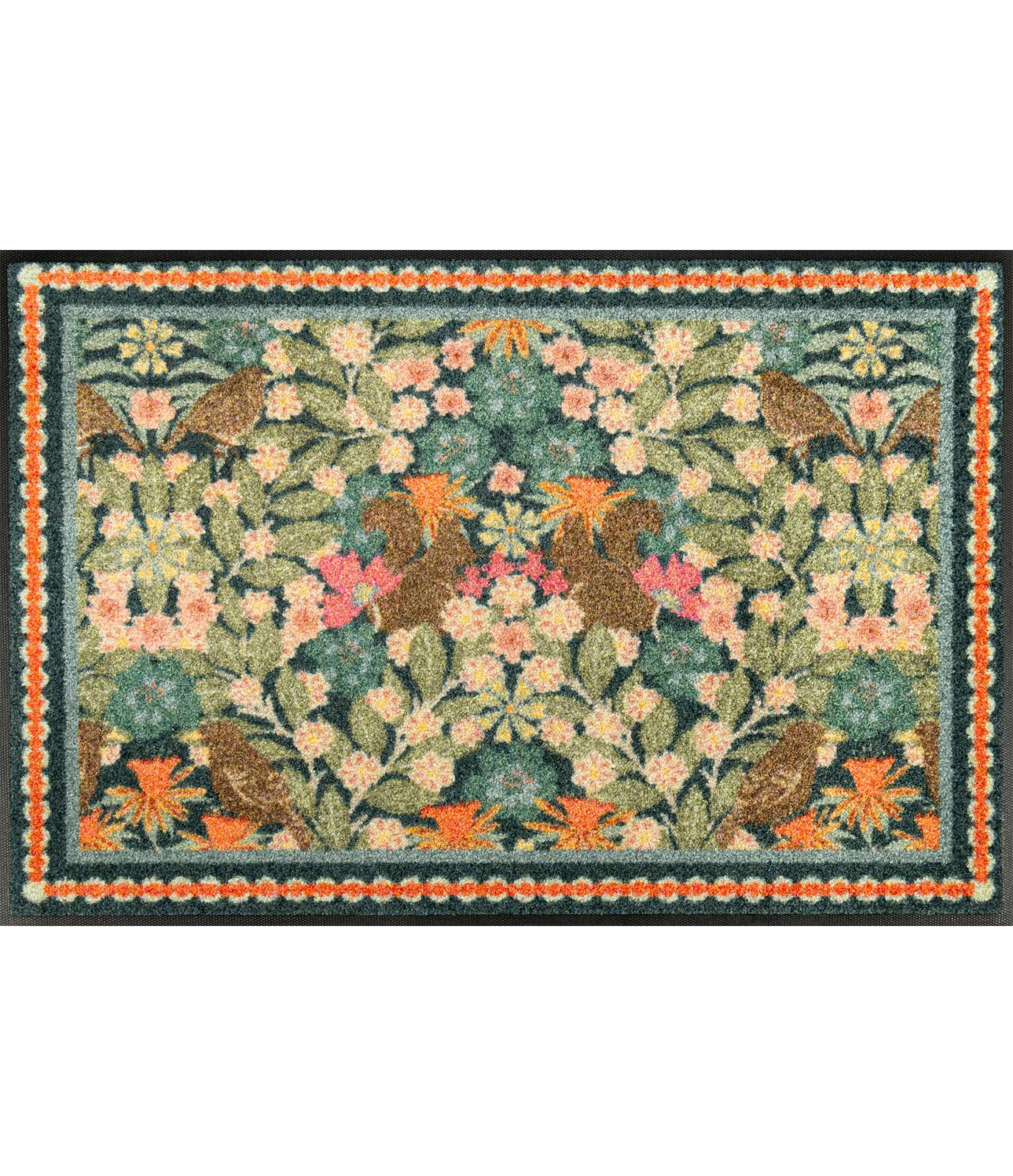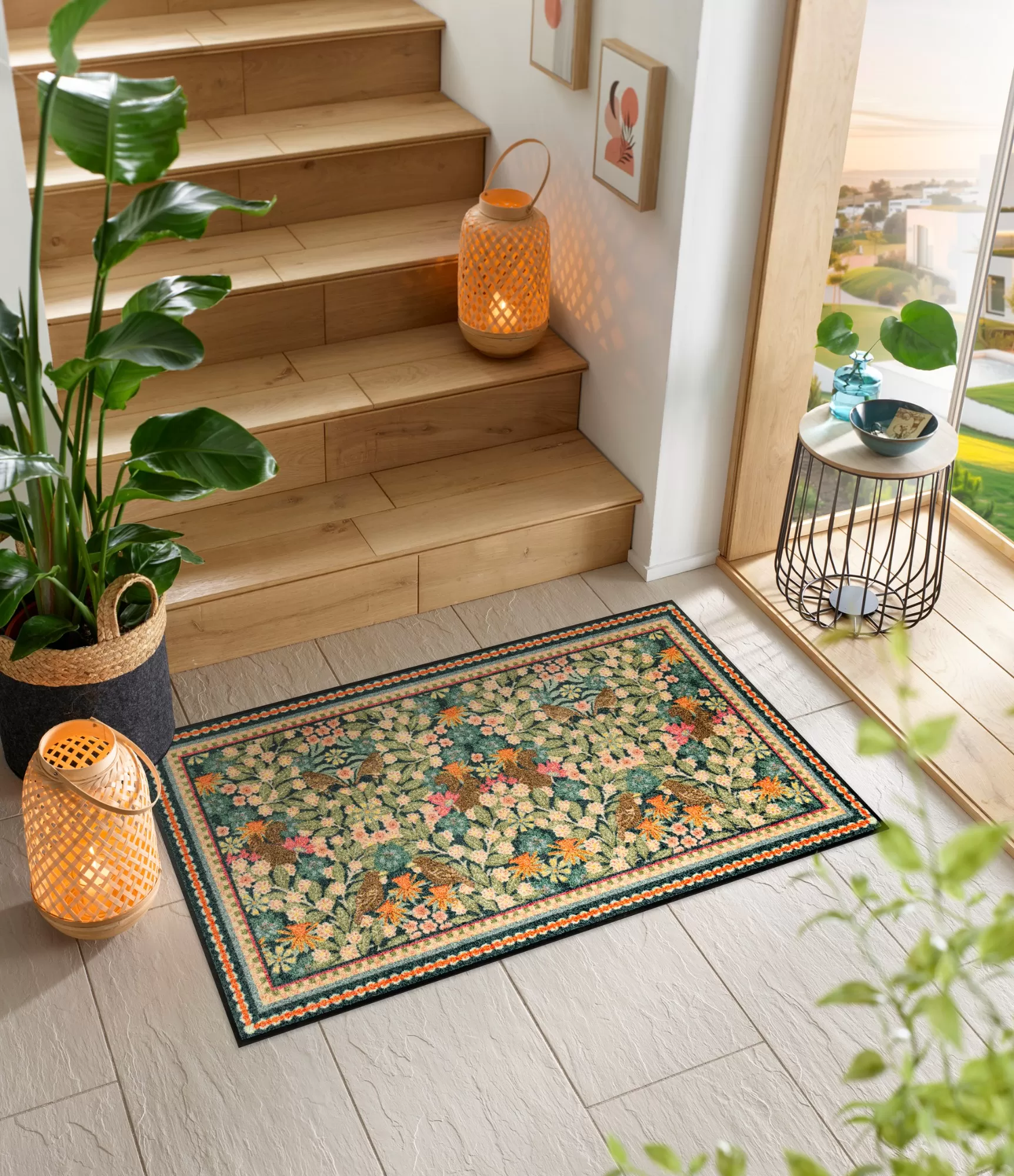 „Garden Luxe Blue“ izceļas ar piesātinātu, detalizētu augu un putnu motīvu, kas atgādina klasisku dekoratīvu audumu. Šis dizains rada mājīguma un izteiksmīguma sajūtu, tāpēc lieliski piemērots telpām, kur vēlas vairāk dzīvīguma un vizuālā dziļuma. Krāsu kombinācija – no maigiem zaļiem līdz siltiem oranžiem akcentiem – viegli sader ar dažādiem interjera stiliem.
