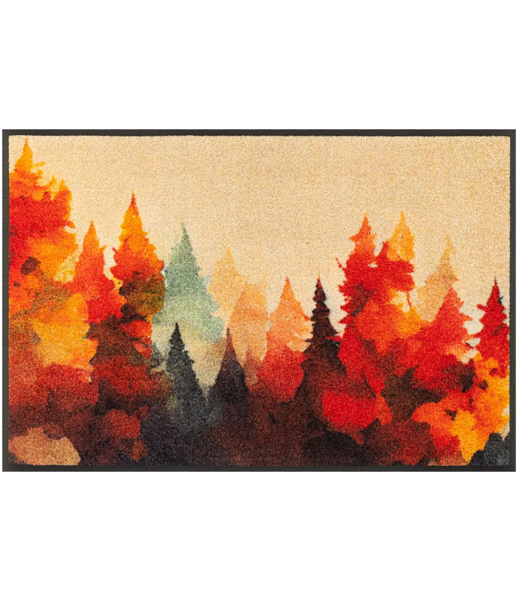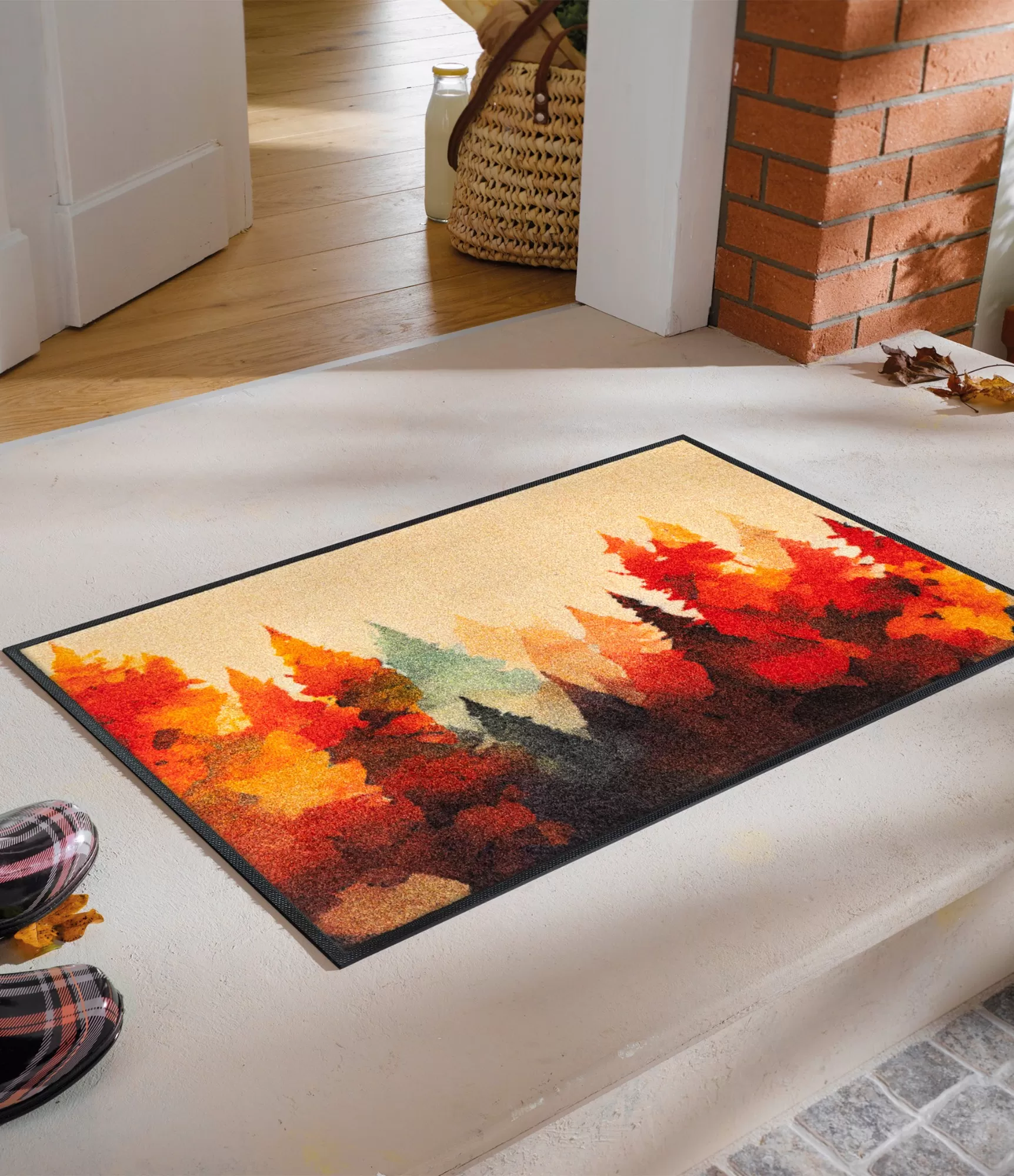 Universāls durvju paklājs „Golden Season“ izceļas ar piesātinātu, rudens iedvesmotu dizainu, kurā saplūst koši oranžie, sarkanie un zemes toņi. Stilizēti koku silueti rada mājīgu, siltu atmosfēru, kas atgādina krāsainu rudens mežu. Šis attēls piešķir ieejas zonai dzīvīgumu un dabiskumu, tāpēc kļūst par patīkamu akcentu katru reizi, atgriežoties mājās.