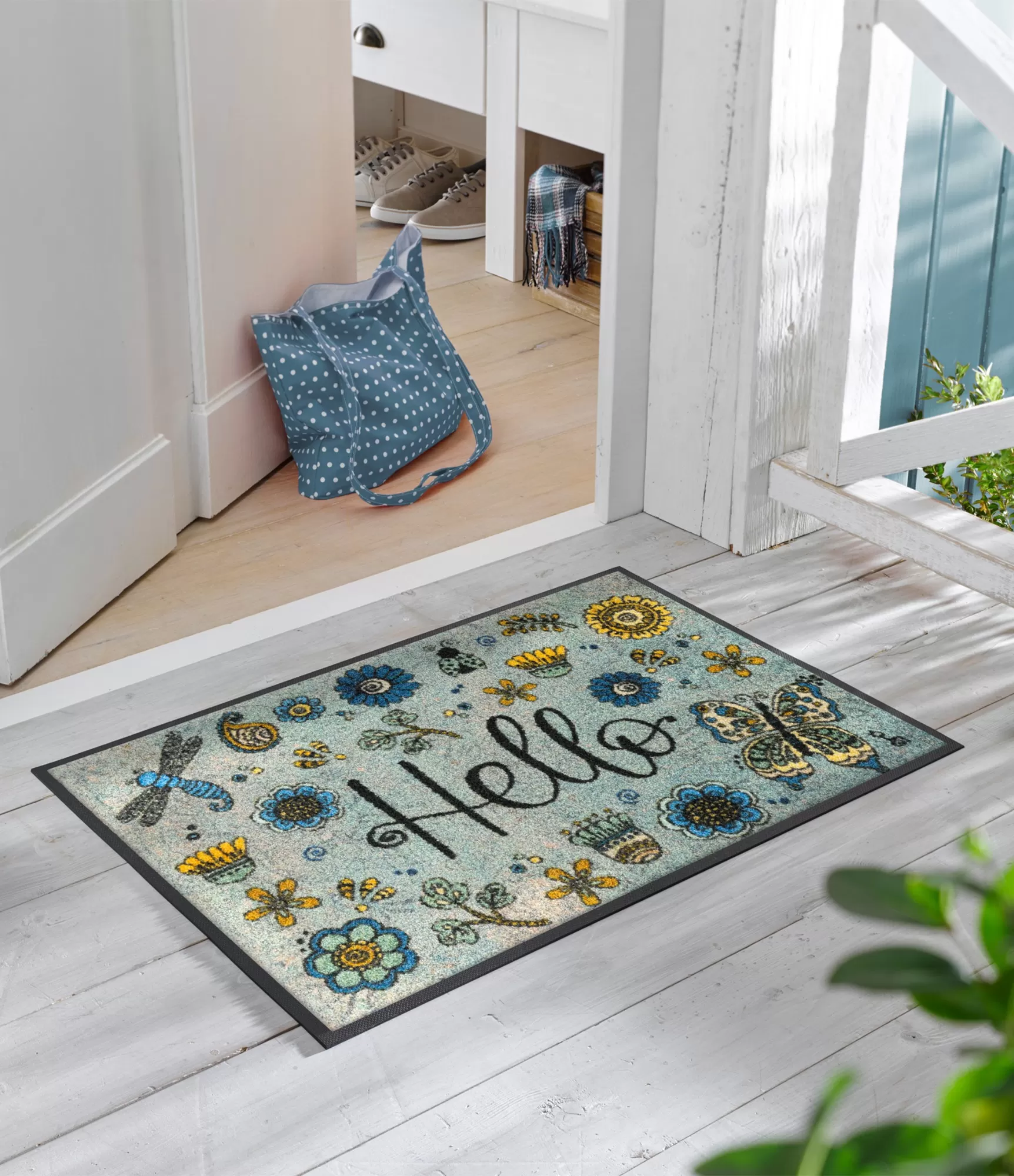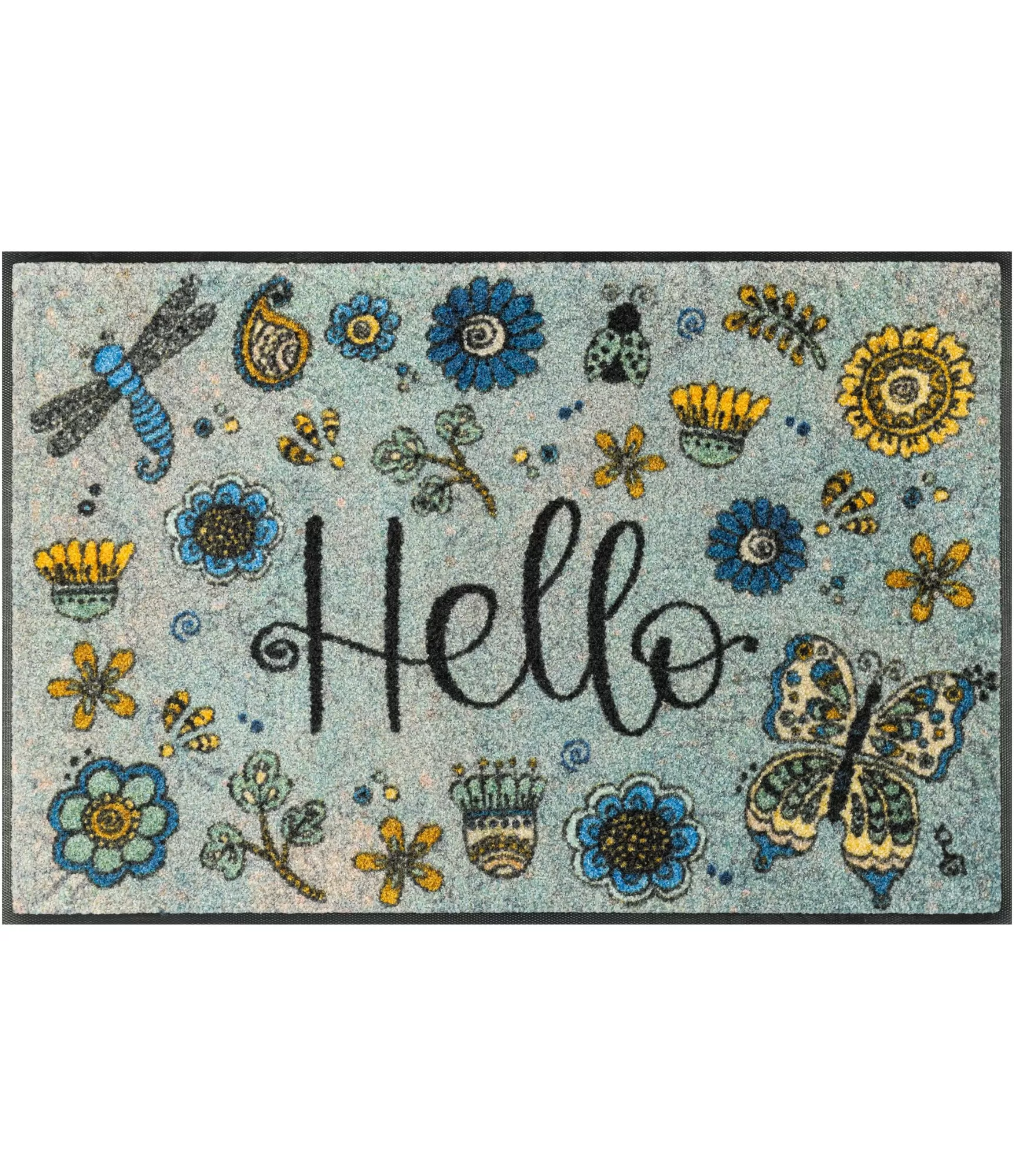 Durvju paklājs „Hello Flowers“ uzreiz rada siltu un draudzīgu pirmo iespaidu. Uz gaiša, maigi zilgana fona izvietoti krāsaini ziedu, kukaiņu un dabas motīvi piešķir vieglumu un dzīvīgumu. Centrā esošais uzraksts „Hello“ ar smaidu aicina ienākt mājās, bet smalkie dzeltenie, zilie un zaļganie toņi veido harmonisku un acīm patīkamu kopskatu.