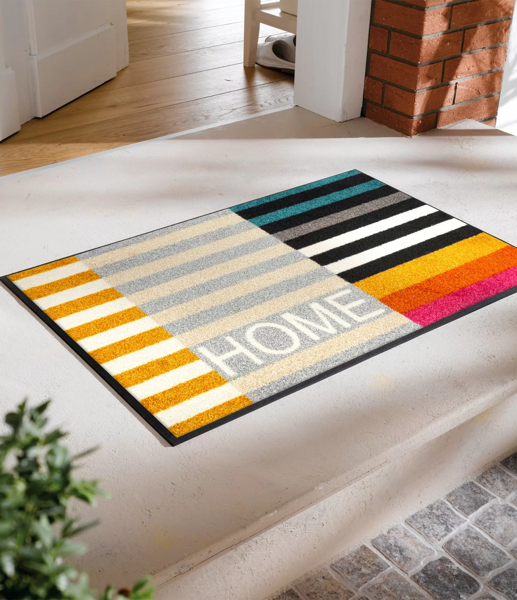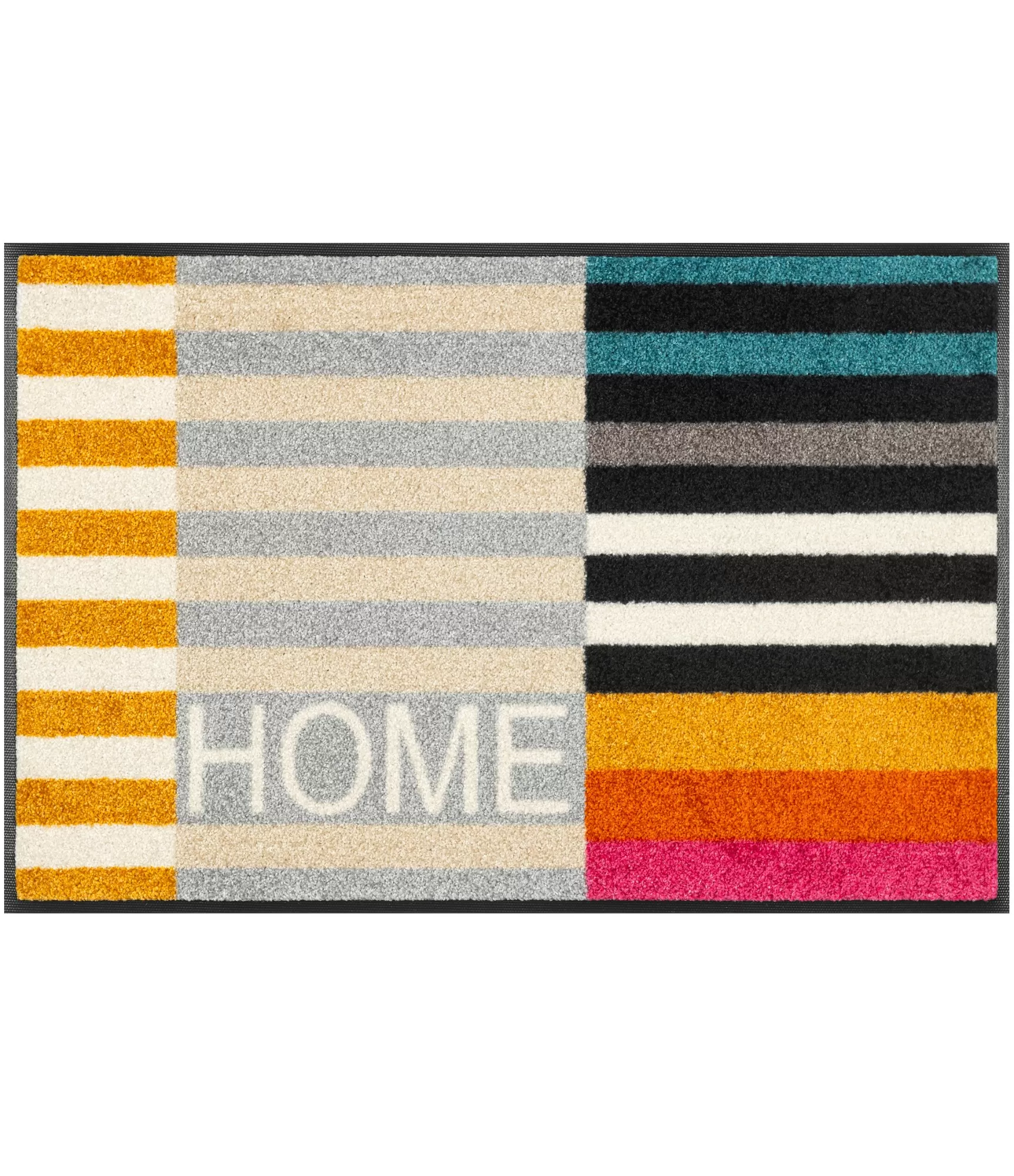 Durvju paklājs „Home Retreat“ izceļas ar dzīvīgu, ritmisku dizainu, kurā savijas dažādu krāsu un līniju spēle. Horizontālās joslas veido vizuālu struktūru, bet kontrastējošie toņi – no siltiem sinepju un oranžiem līdz atsvaidzinoši zilajiem un neitrālajiem pelēkajiem – piešķir interjeram enerģiju un raksturu. Smalki iestrādātais vārds „HOME“ vēl vairāk pastiprina mājīguma un atgriešanās sajūtu.