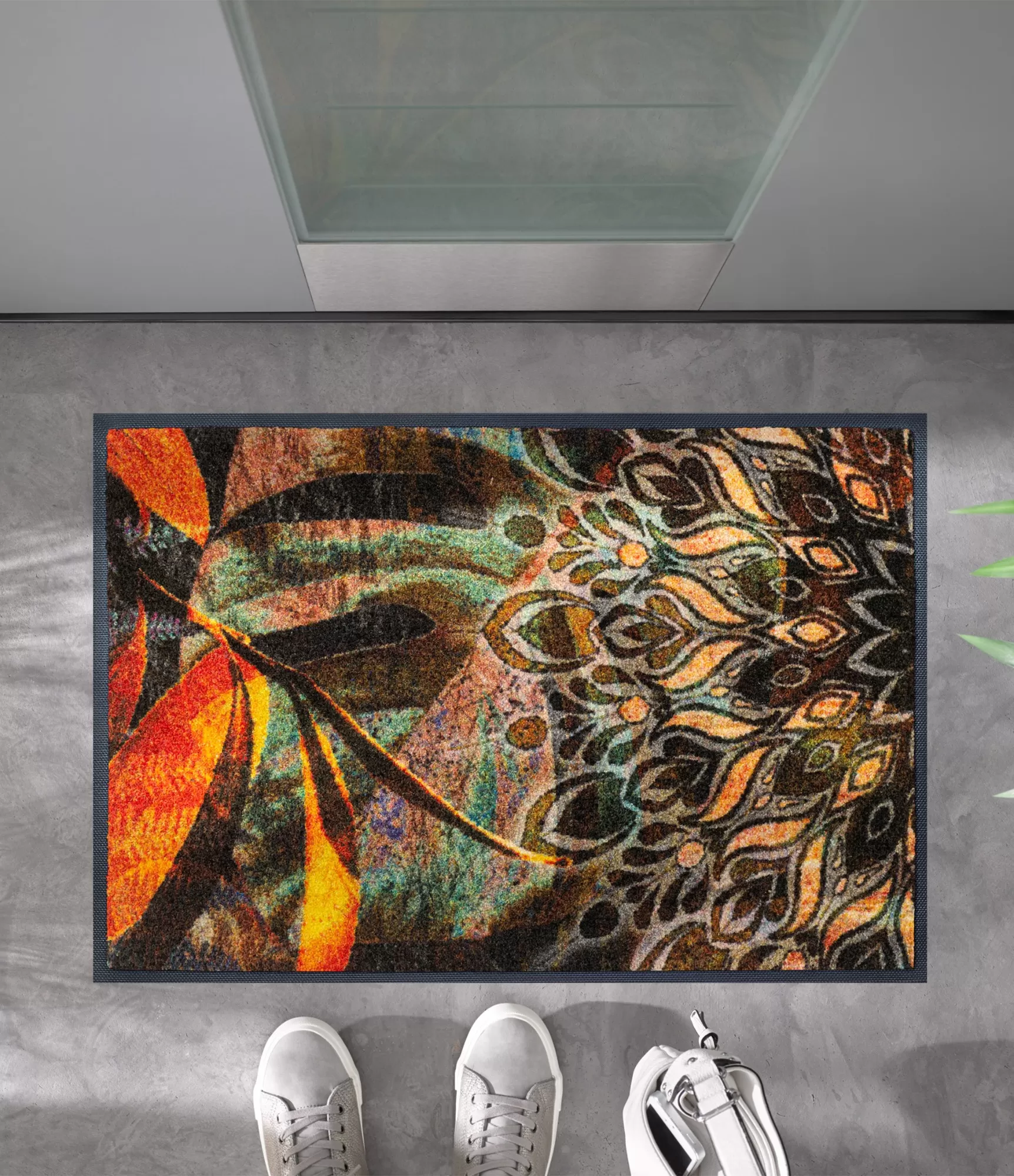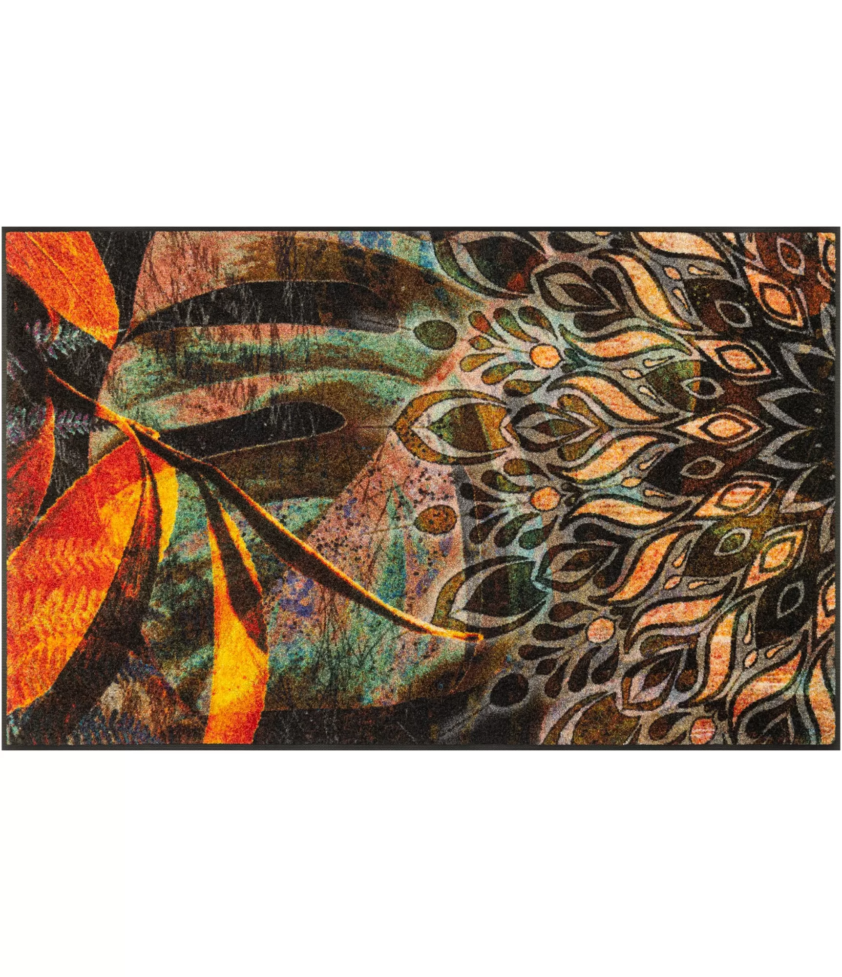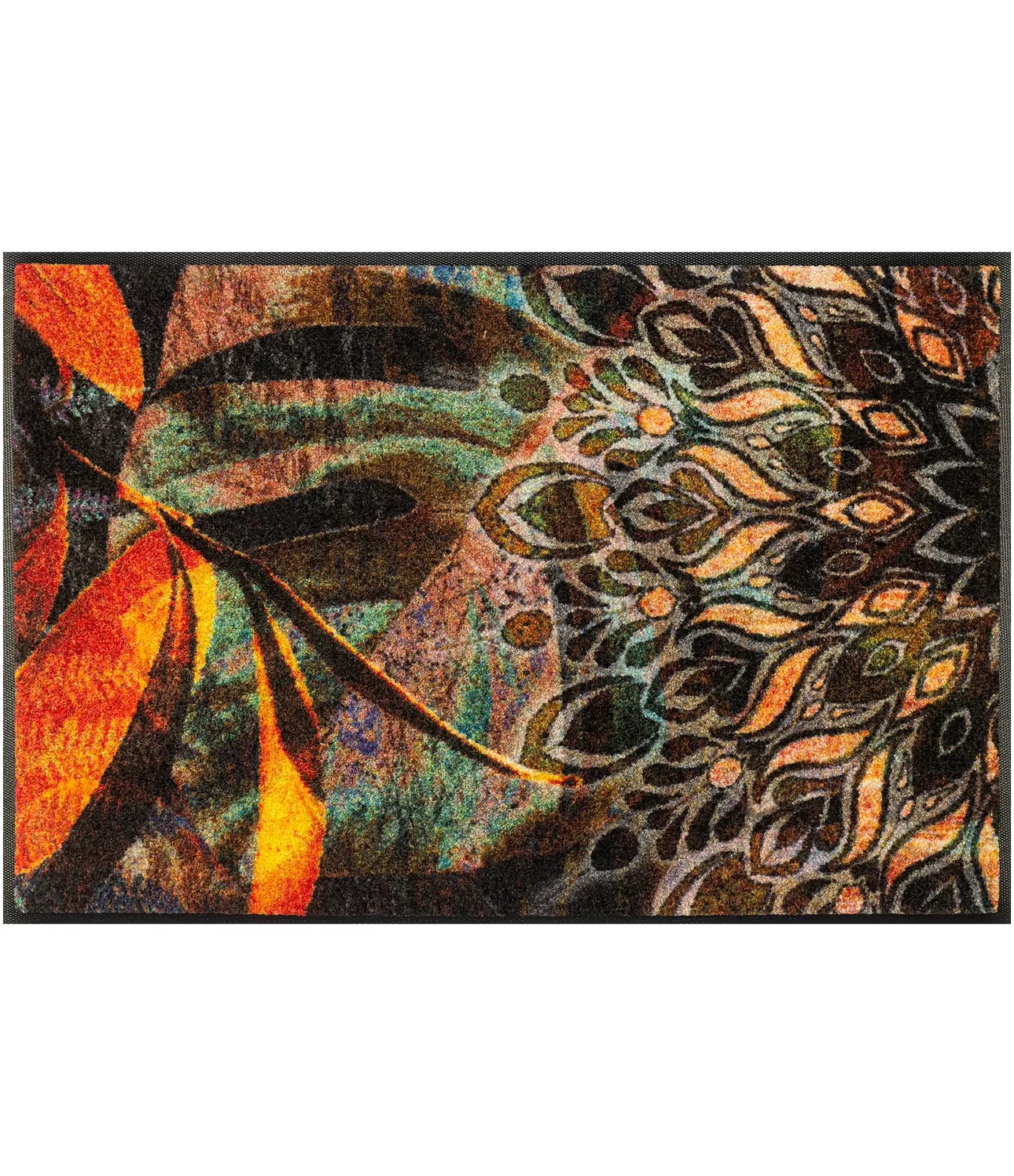 Modernais durvju paklājs „Jungle Dance“ piesaista uzmanību ar savu bagātīgo un dinamisko rakstu. Eksotiski lapu motīvi apvienoti ar dekoratīvām detaļām un dziļiem, kontrastējošiem toņiem – no siltiem oranžiem līdz piesātinātiem zaļiem un tumšiem akcentiem. Šāds dizains rada enerģijas un dzīvīguma sajūtu, padarot paklāju par spilgtu akcentu jebkurā telpā.
