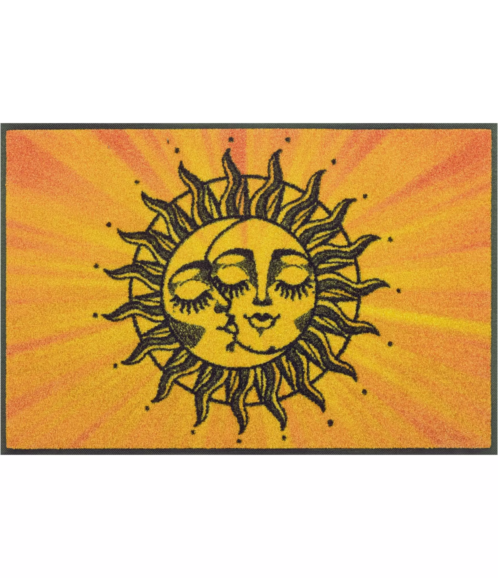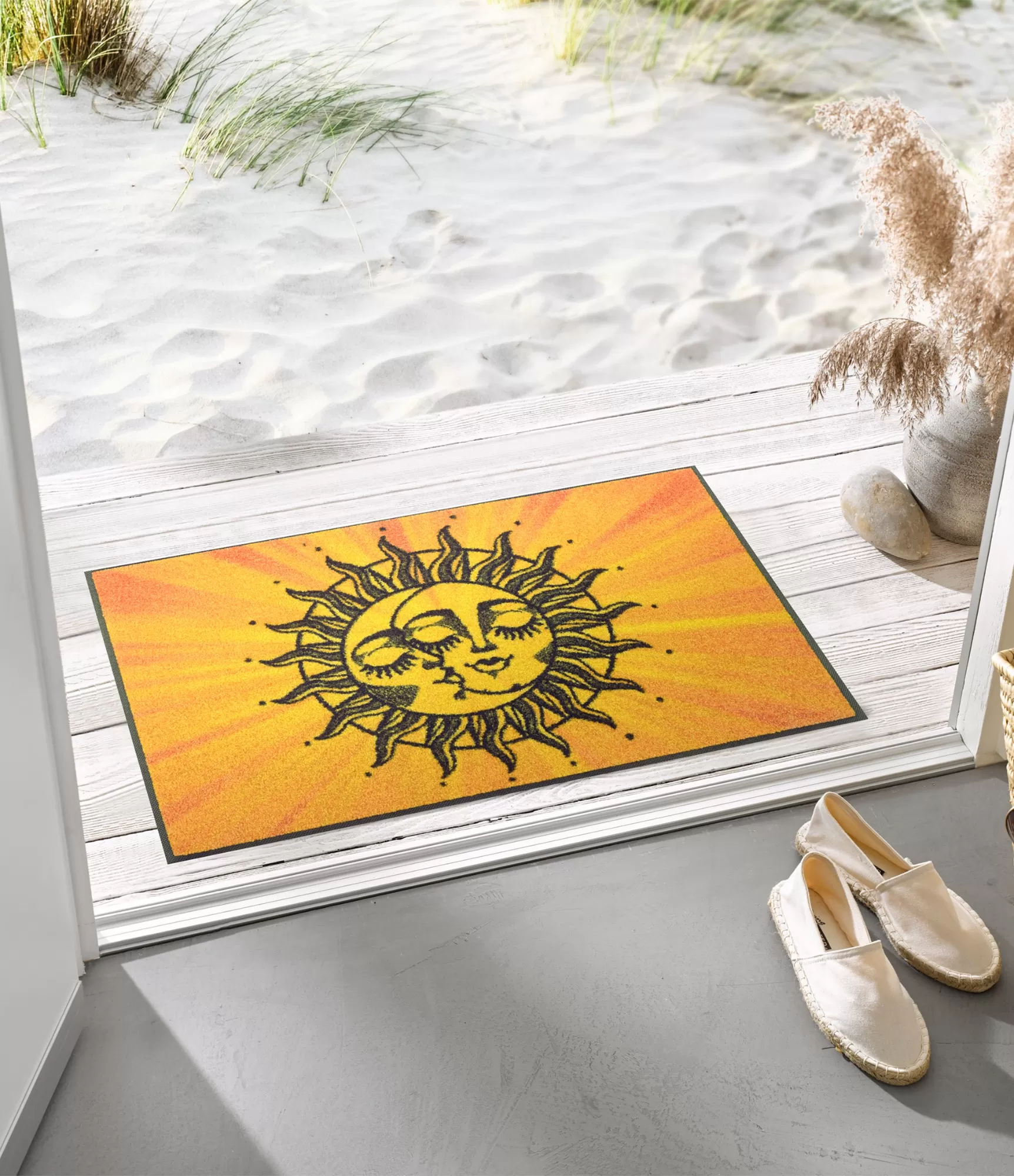 Mazgājamais durvju paklājs „Kiss the Sun“ uzreiz piesaista uzmanību ar savu izteiksmīgo un silto dizainu. Saules motīvs, attēlots piesātinātos dzeltenos un oranžos toņos, rada mājīgu un dzīvīgu noskaņu jau no pirmā soļa mājās. Tas ir ne tikai praktisks izstrādājums, bet arī skaidrs vizuālais akcents, kas veido pirmo iespaidu par telpu.