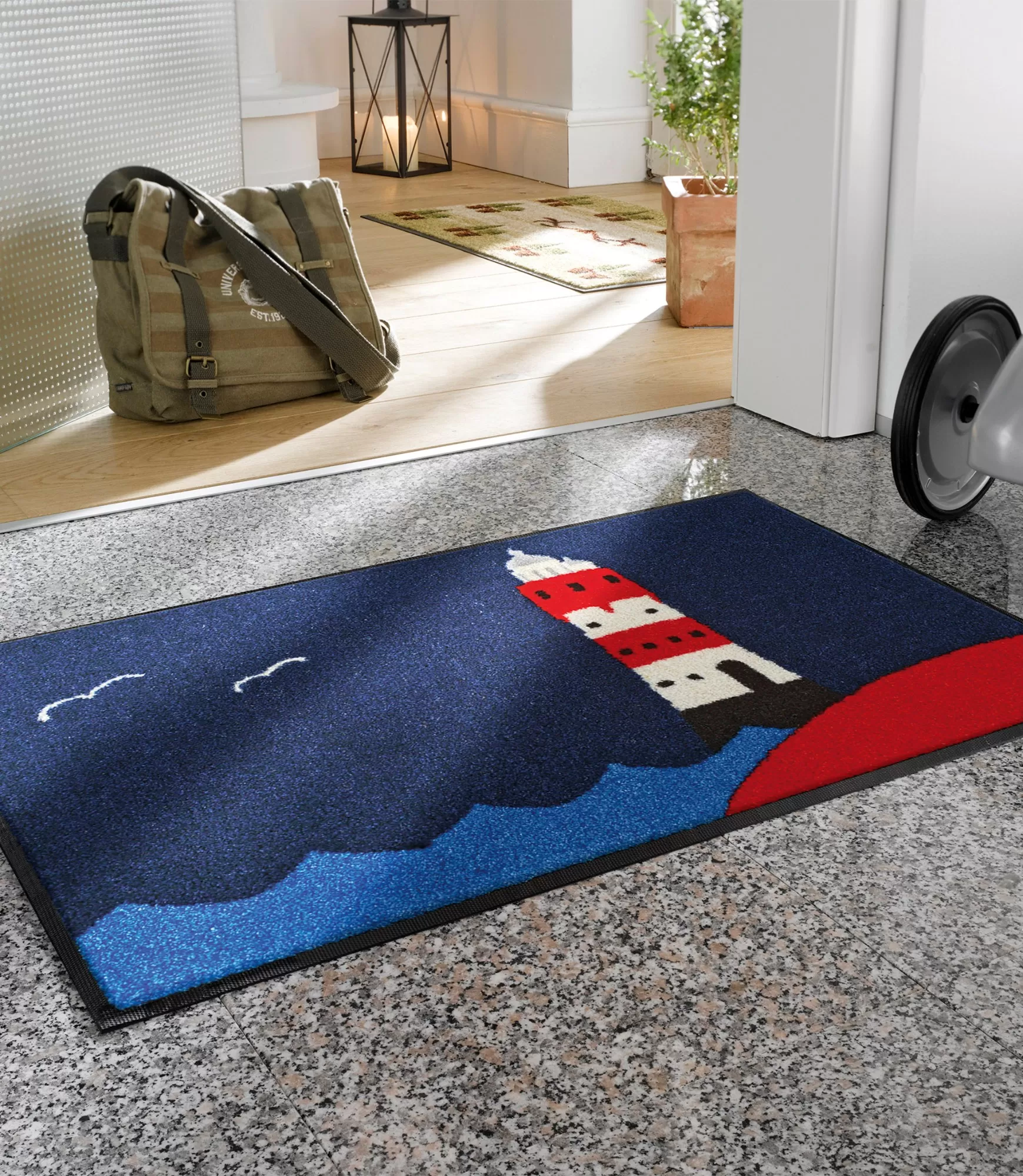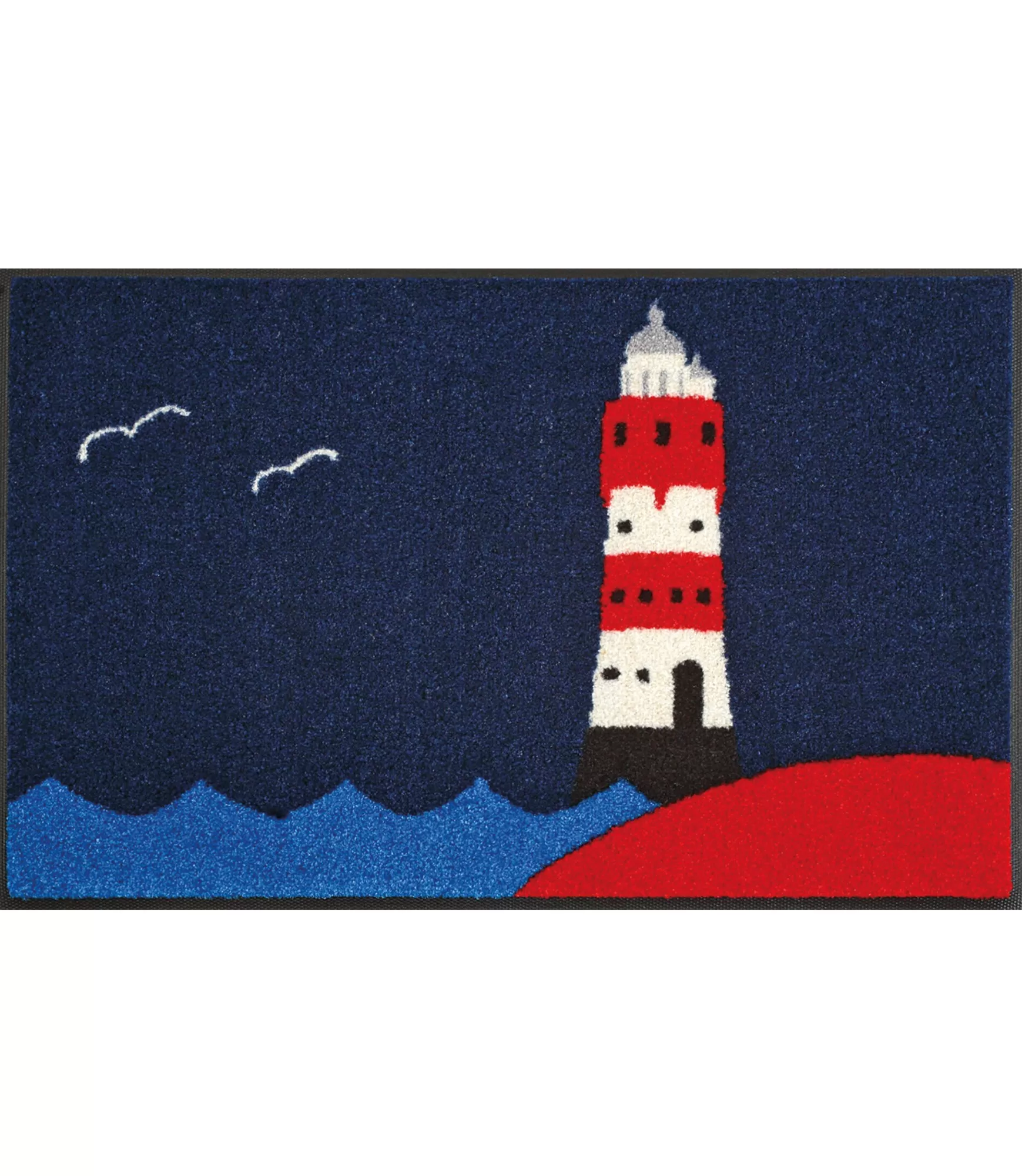Durvju paklājs „Lighthouse by the Sea“ ataino klasisku jūras tematiku – dziļš zilais fons, kontrastējoša sarkani balta bāka un viegli stilizēti viļņi veido skaidru, tīru un vizuāli nomierinošu tēlu. Tas ir dizains, kas atgādina jūras horizontu, svaigu gaisu un lēnu, harmonisku ritmu.