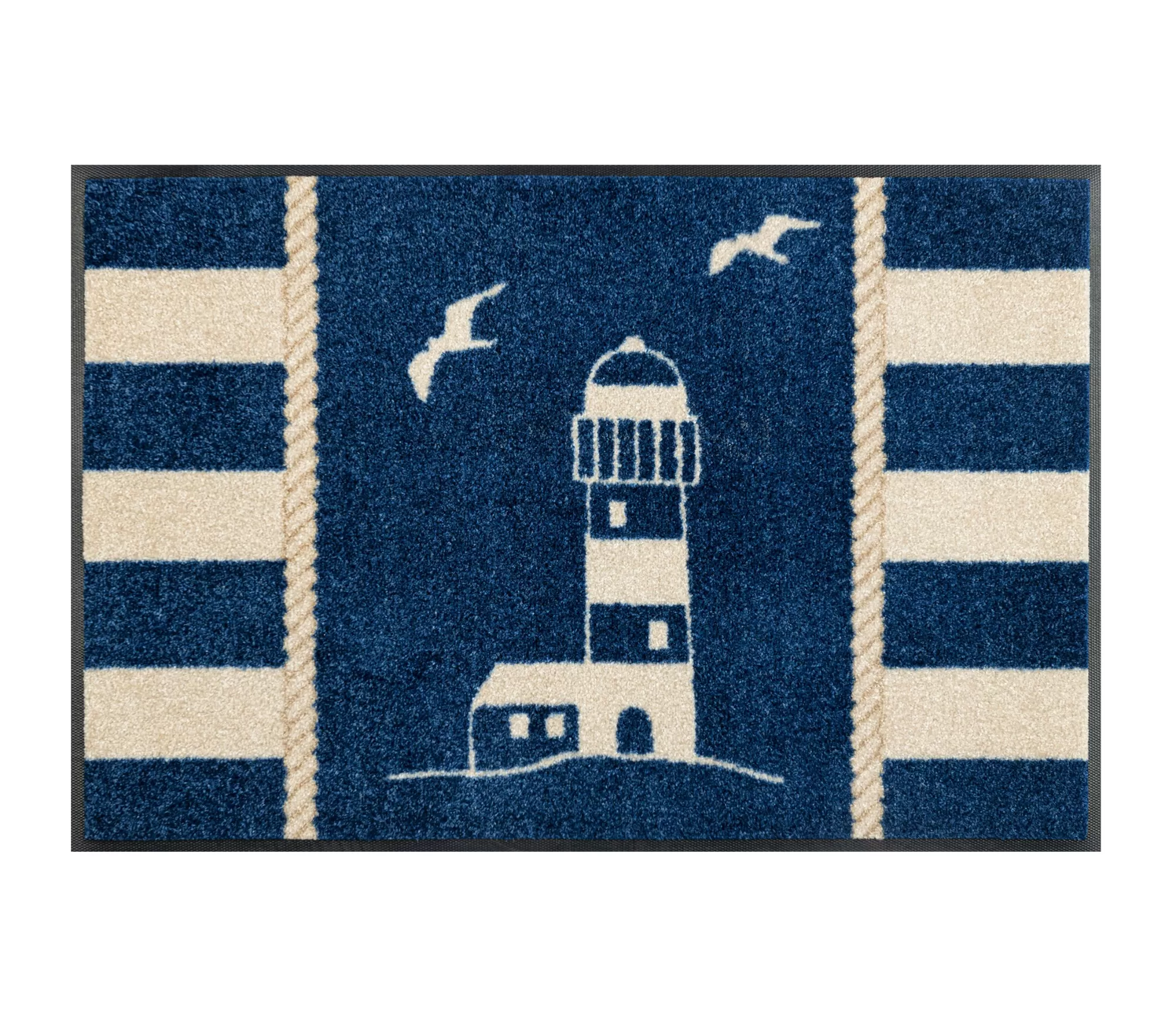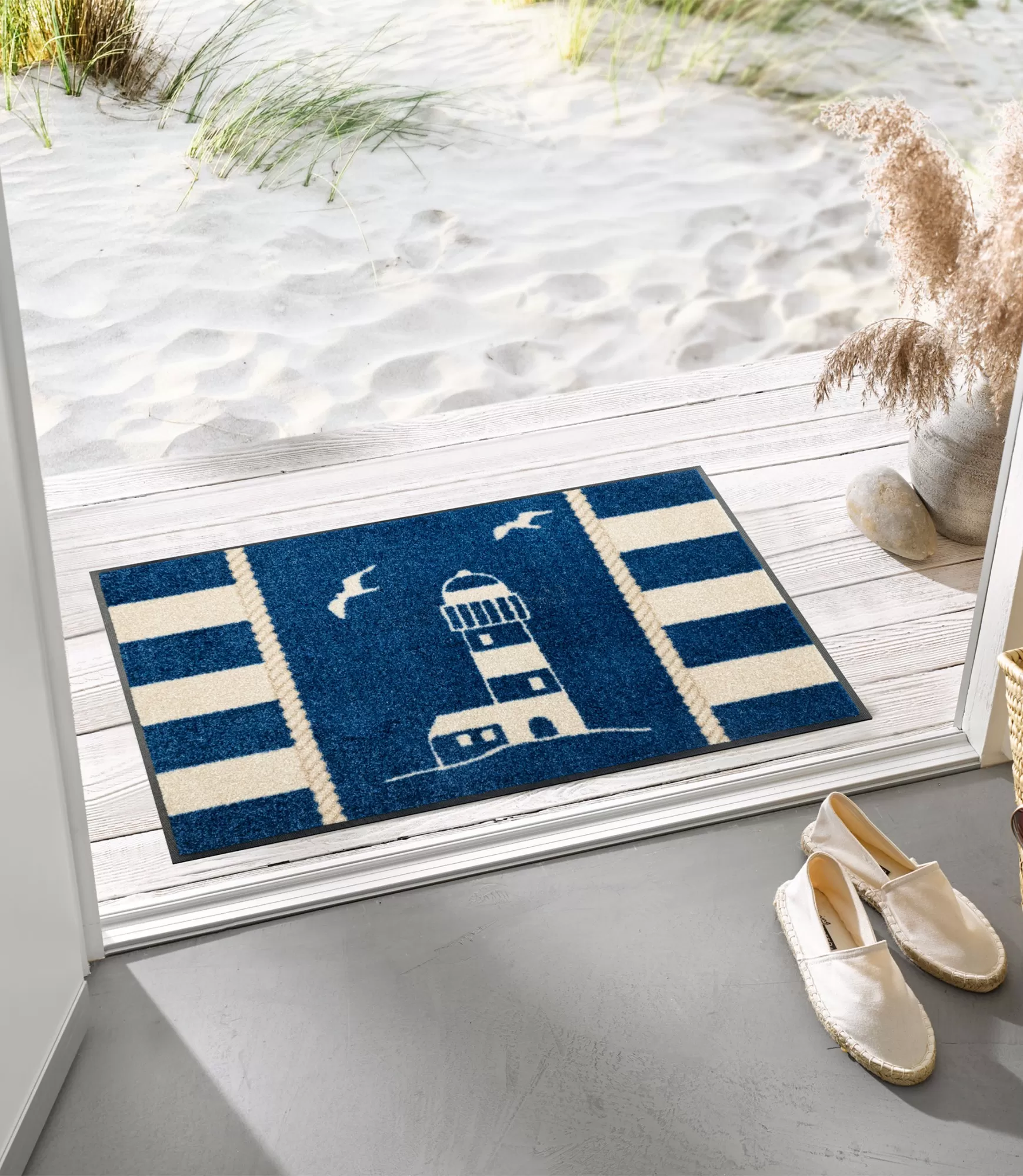 Durvju paklājs „Lighthouse“ ienes mājās vieglu piejūras noskaņu un miera sajūtu. Dziļi zilais fons, baltās svītras un bākas siluets veido skaidru, harmonisku tēlu, kas atgādina jūru, vēju un brīvdienu vieglumu. Minimālistisks, bet izteiksmīgs dizains ļauj šim paklājam kļūt par smalku interjera akcentu.