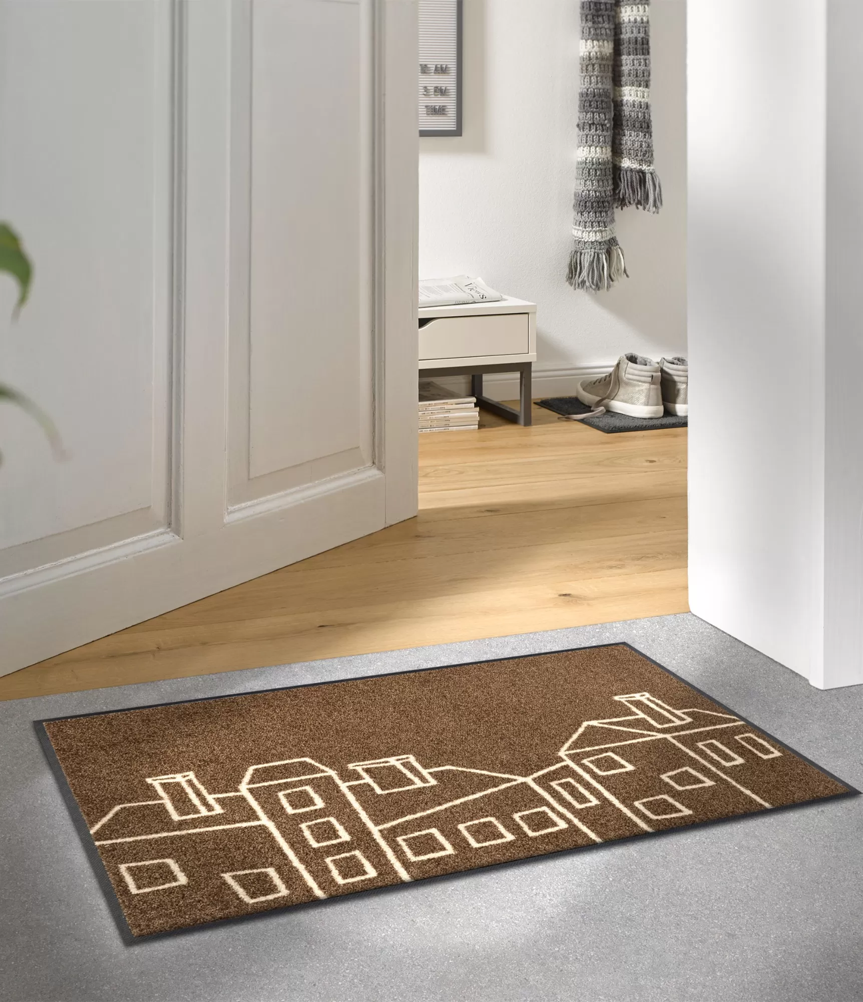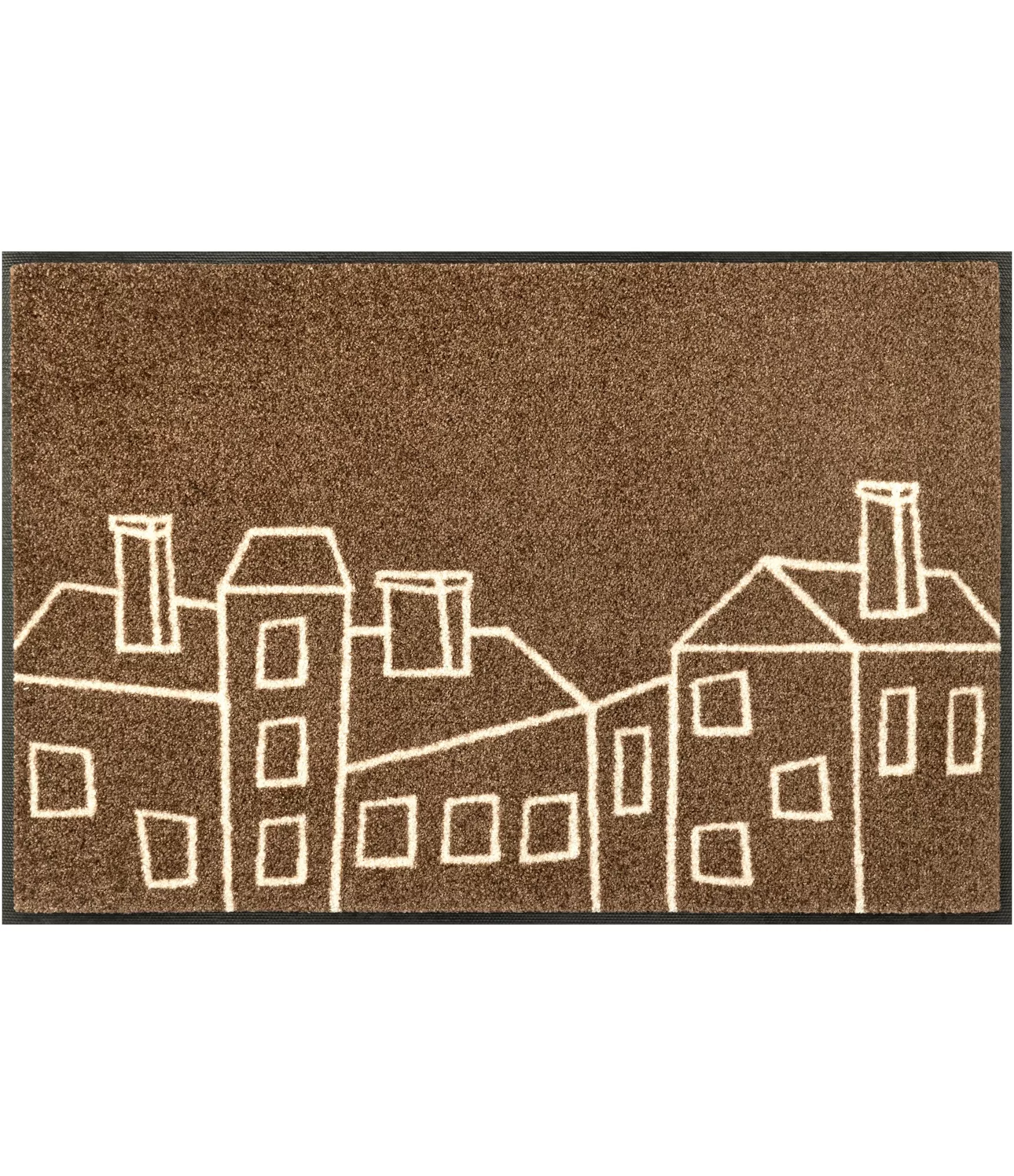 Mazgājamais durvju paklājs Linecity izceļas ar smalku, bet izteiksmīgu dizainu, kur stilizētas pilsētas māju līnijas rada modernu un mājīgu iespaidu. Siltais brūnais fons kopā ar gaišajām līnijām piešķir dabiskuma sajūtu un viegli iekļaujas dažādos interjera risinājumos.