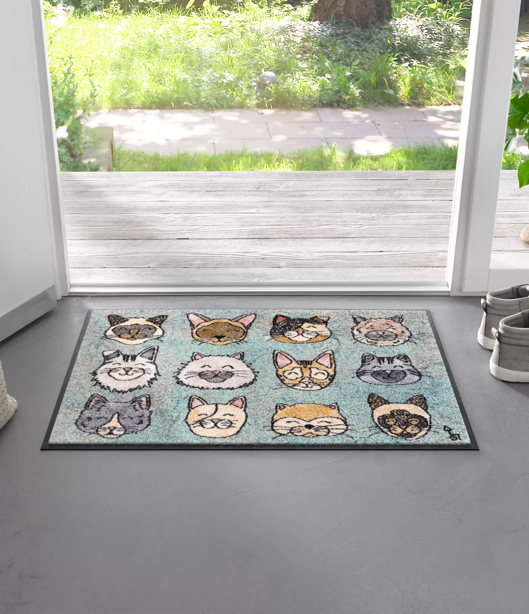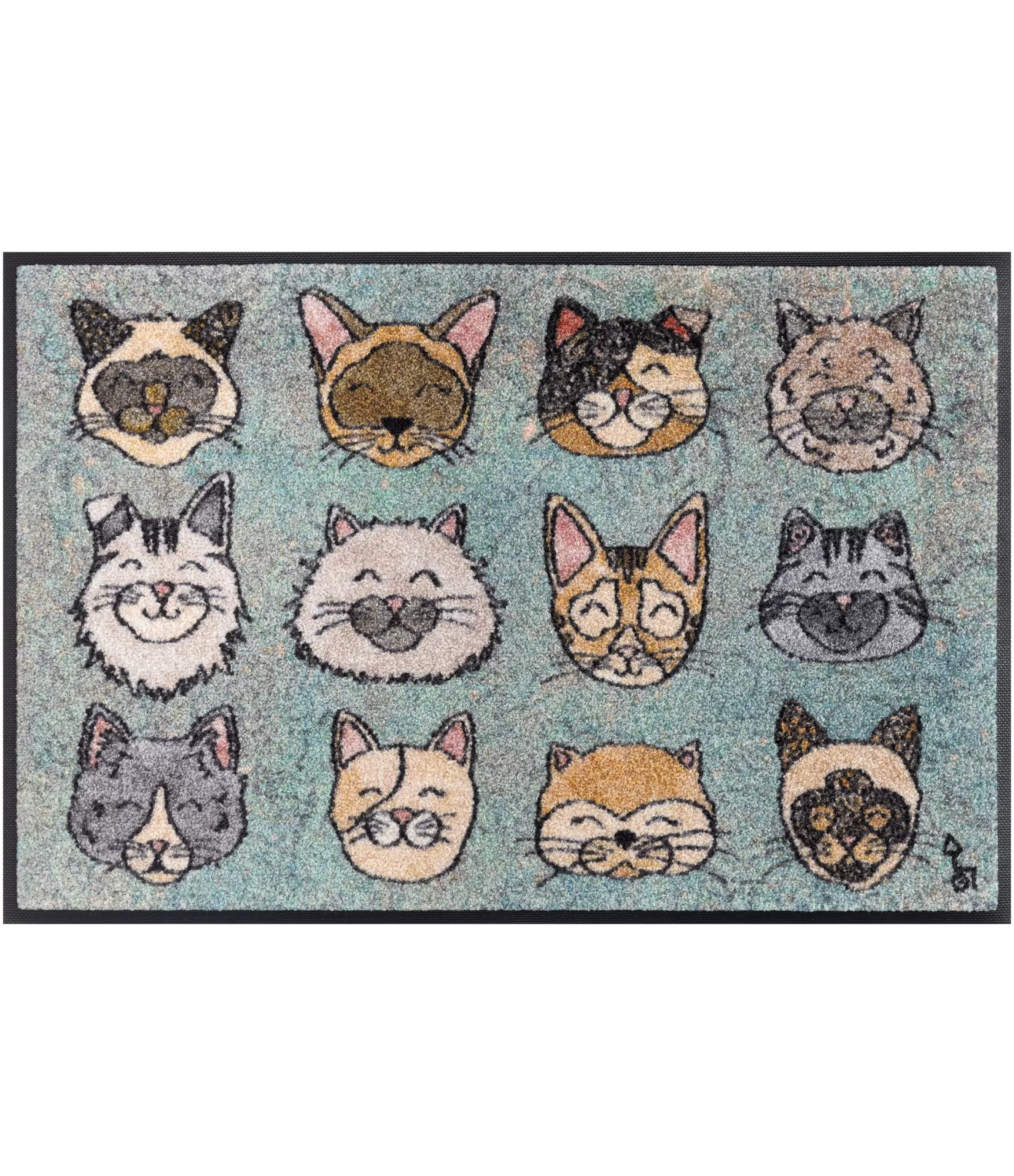 Mazgājamais durvju paklājs Love Cats ir rotaļīgs un noskaņu raisošs izvēles variants visiem kaķu mīļotājiem. Uz šī paklāja attēloti daudzi dažādi kaķu sejiņu zīmējumi, katrs ar savu izteiksmi, tāpēc kopējais skats ir dzīvs un rakstura pilns. Maigais, nedaudz pelēcīgi zilais fons ļauj krāsainajiem attēliem izcelties, vienlaikus saglabājot mājīguma sajūtu.