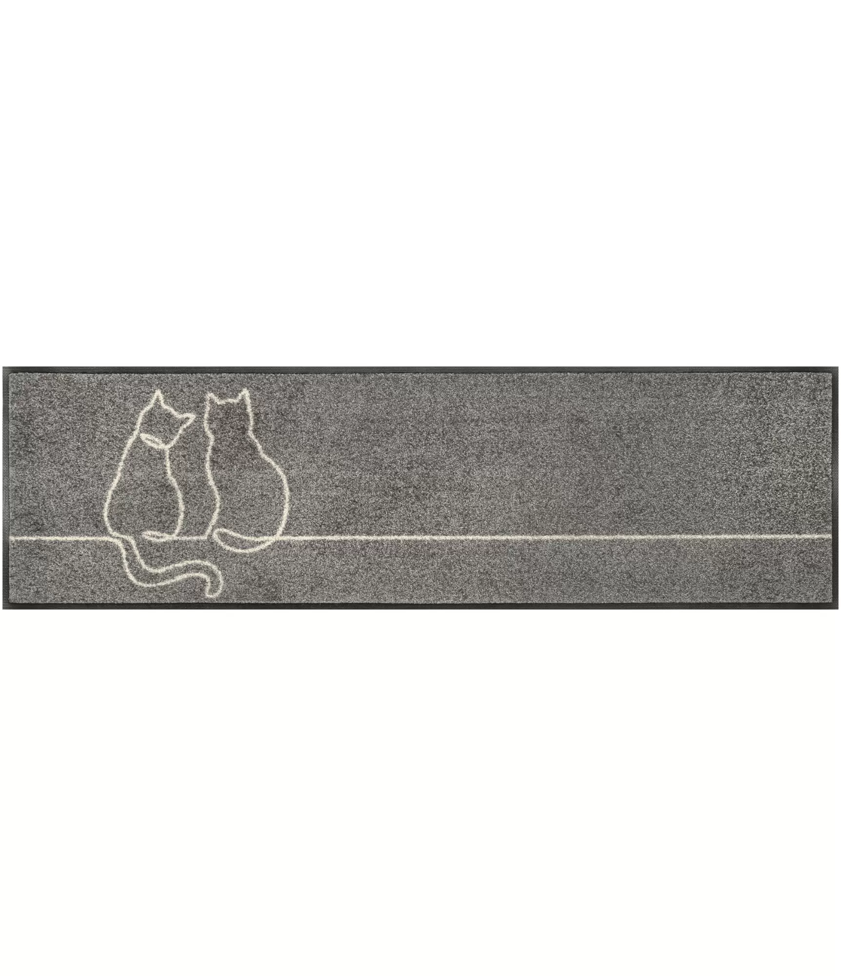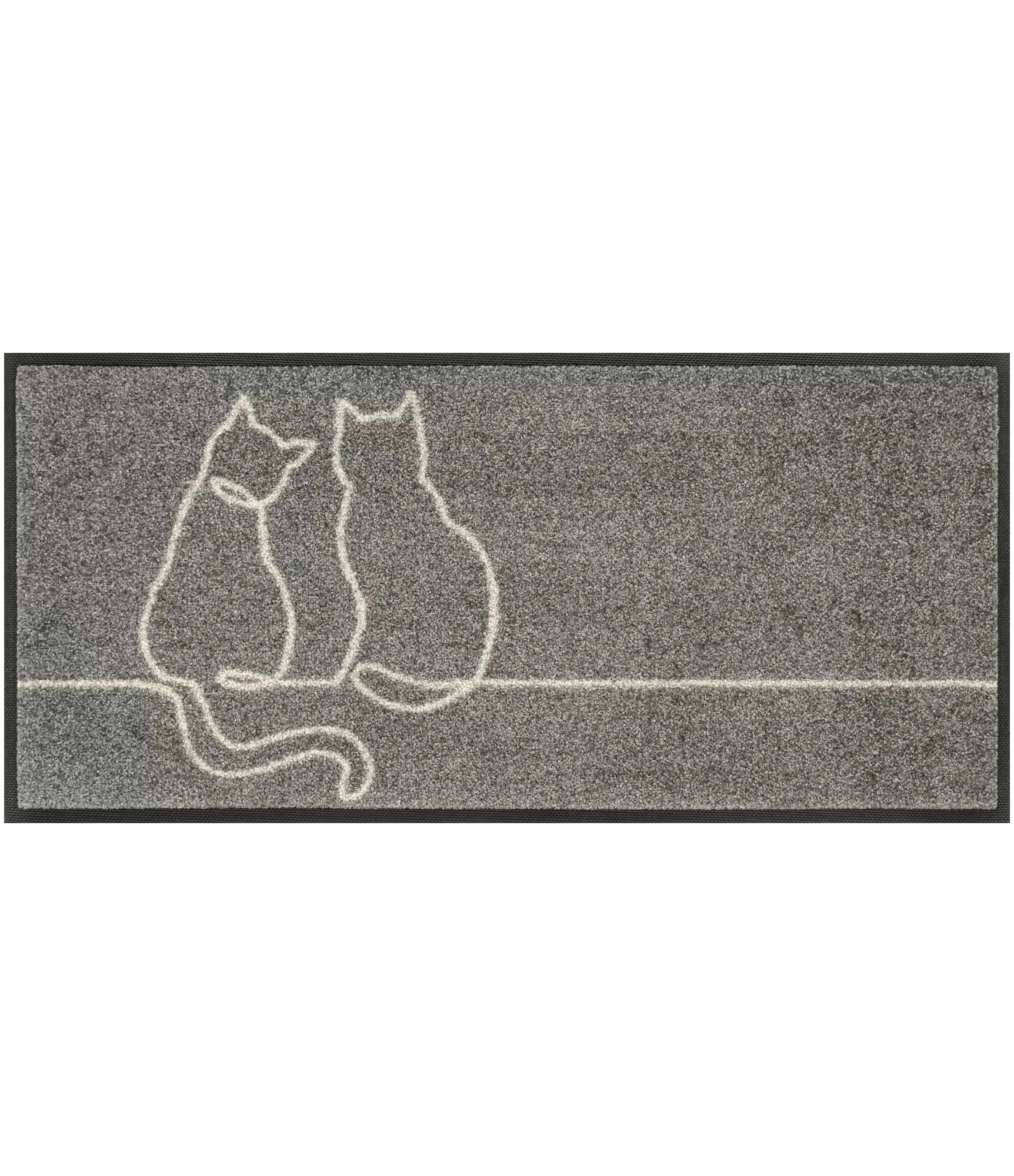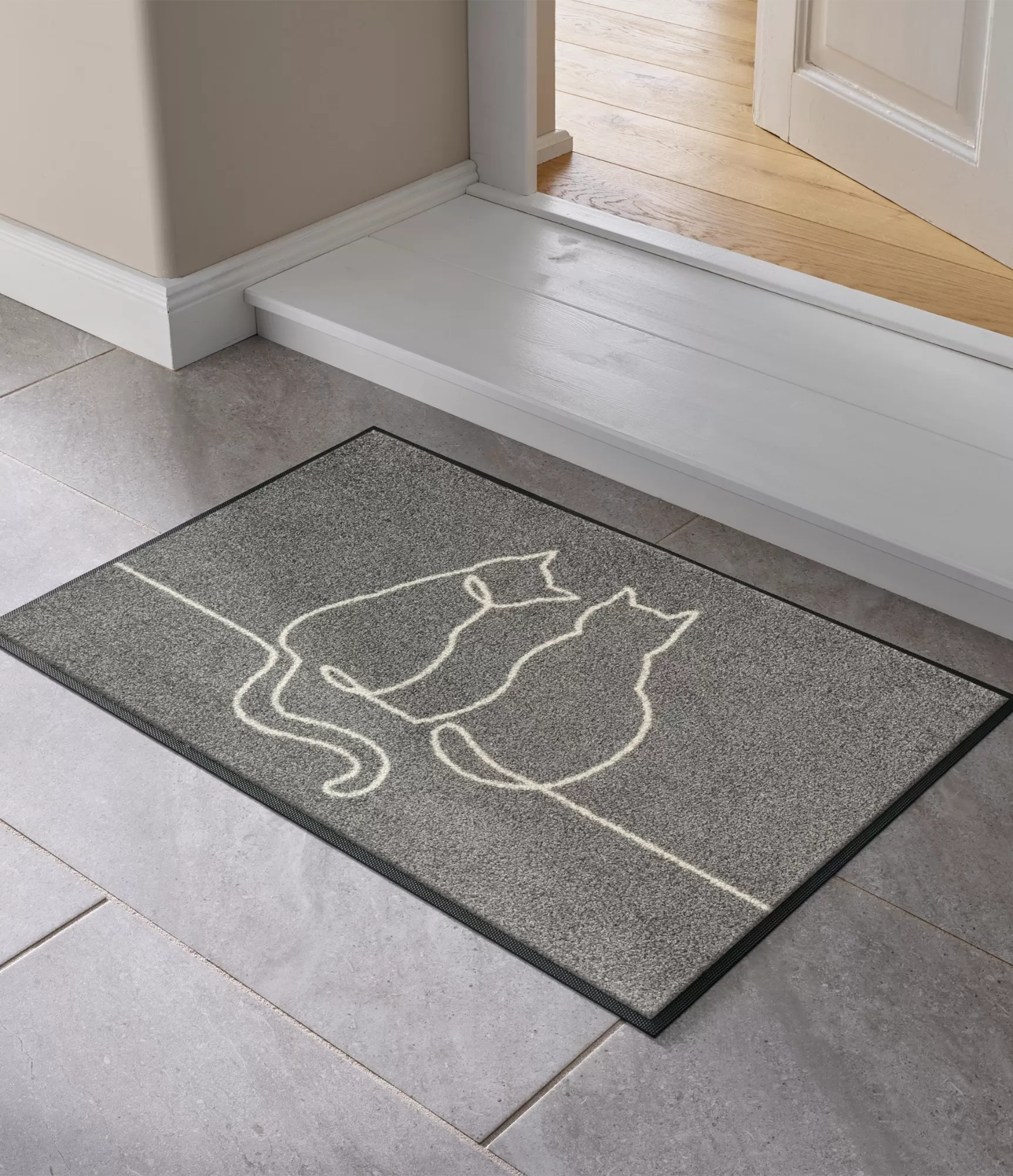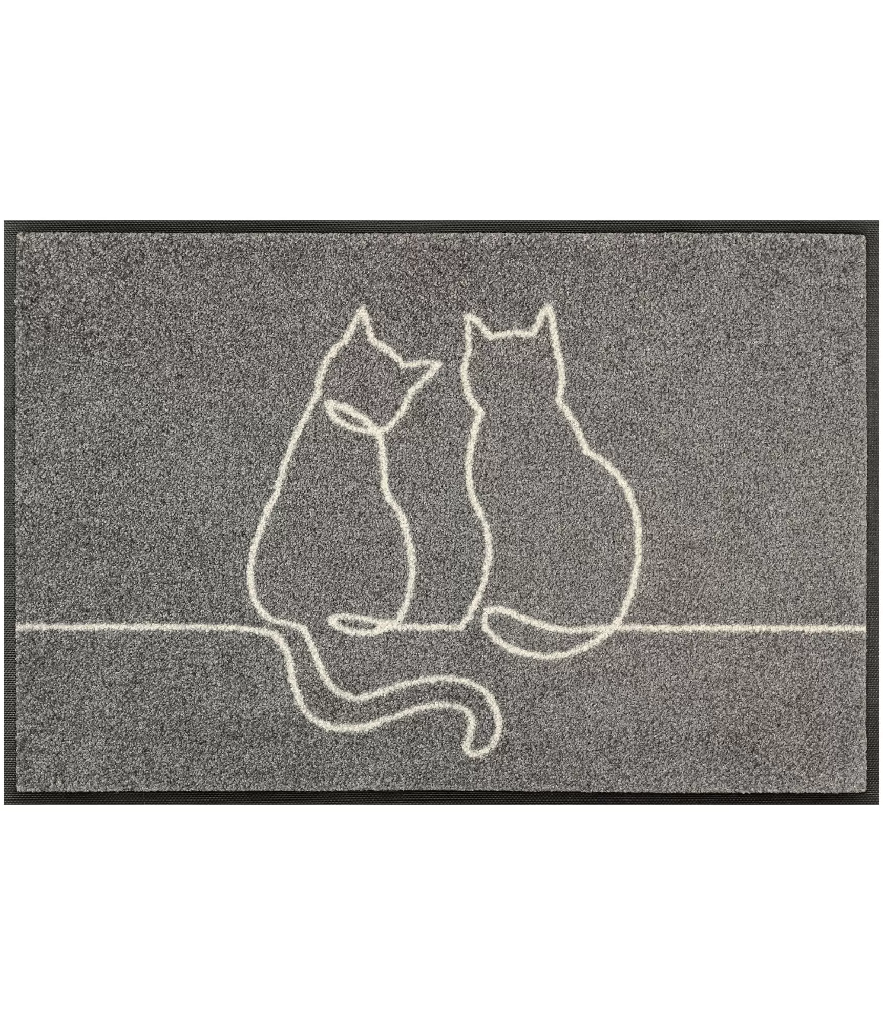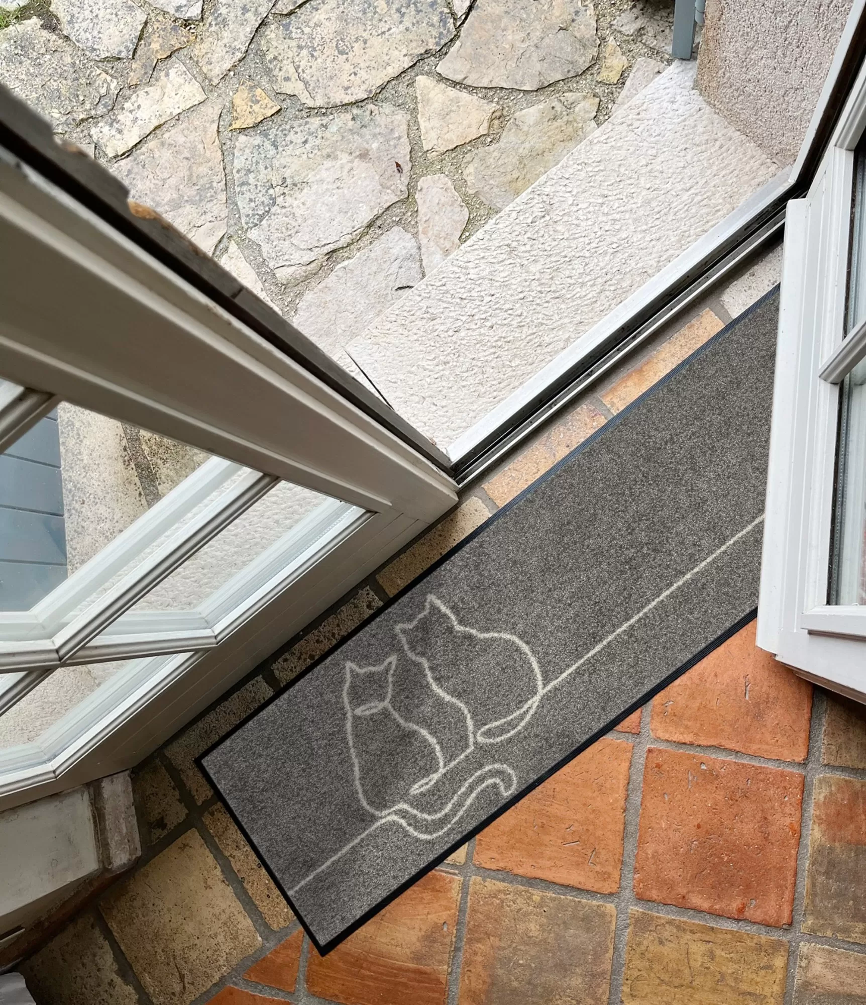 Mazgājamais durvju paklājs Lovetails izceļas ar minimālistisku un mājīgu dizainu, kas lieliski piemērots dažādiem interjeriem. Uz pelēka fona attēlotas divas kaķes ar smalkām līnijām rada miera un harmonijas sajūtu. Tas ir dizains, kas nav uzbāzīgs, bet piešķir mājām siltumu un raksturu.