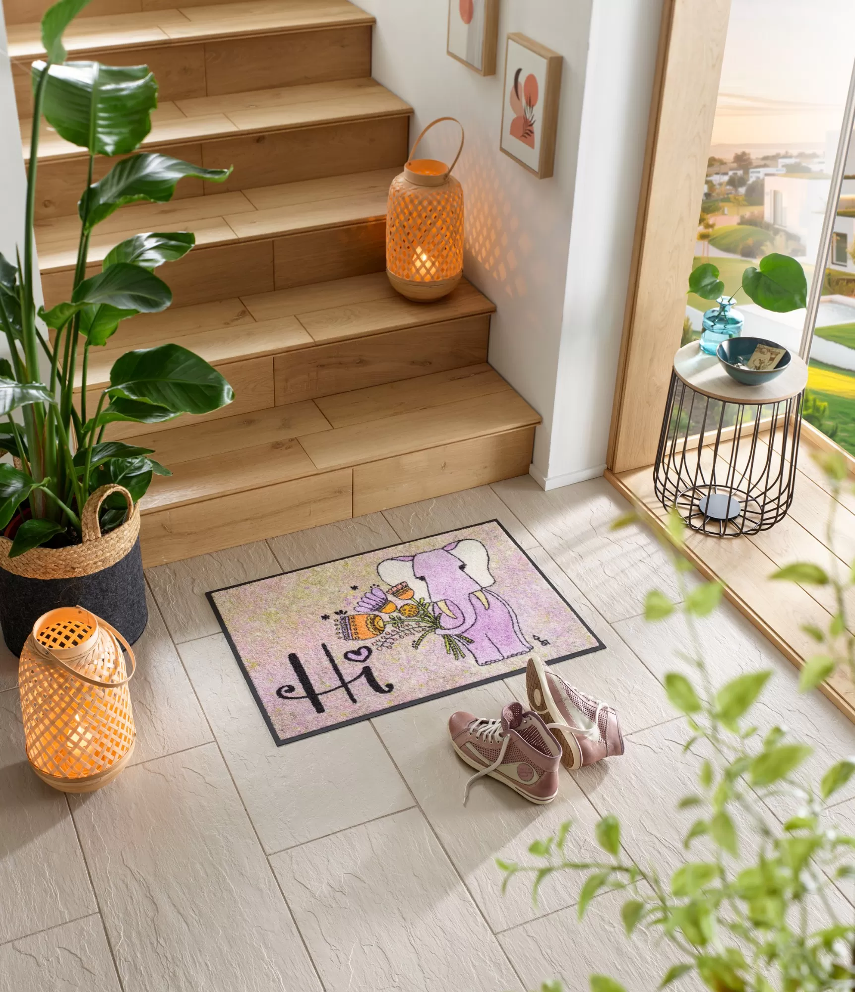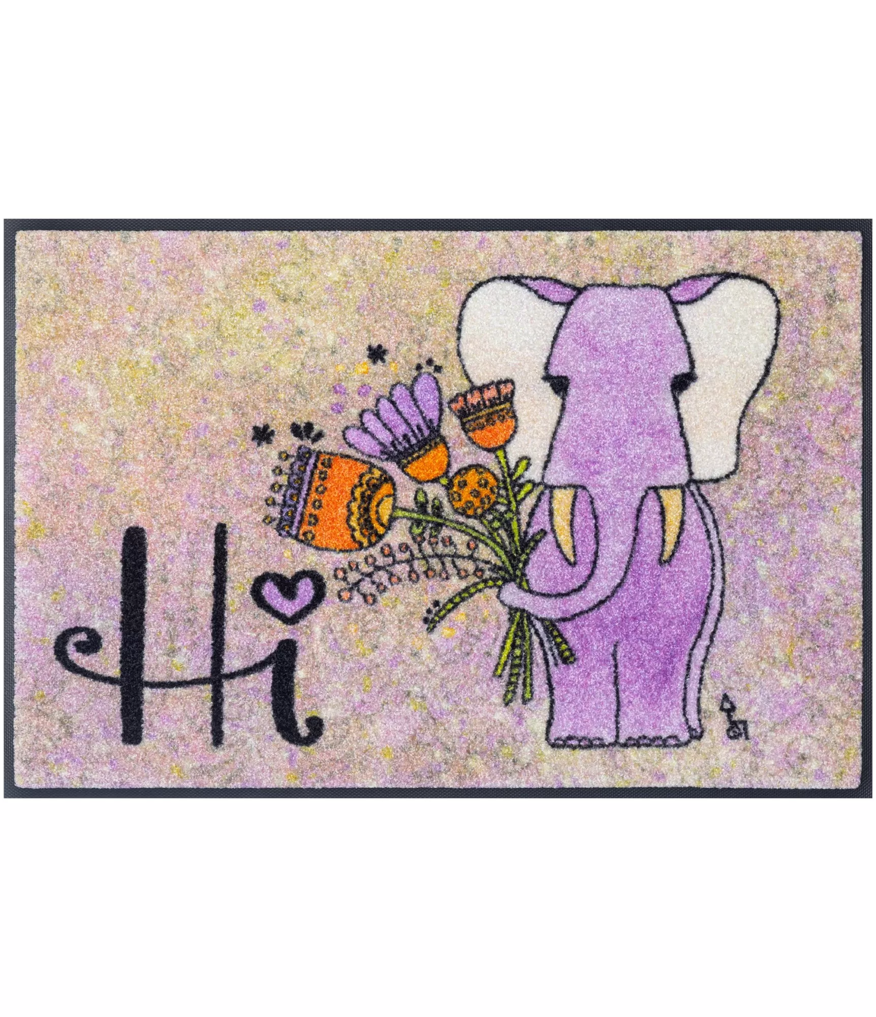 Durvju paklājs Lucky Elephant uzreiz piesaista uzmanību ar savu siltu un noskaņu radošu dizainu. Maigu pasteļtoņu fons kombinācijā ar violetu zilonīti un smalkām detaļām rada mājīgu, draudzīgu iespaidu. Uzraksts „Hi“ piešķir vēl vairāk dzīvīguma un aicina viesus ienākt ar smaidu.